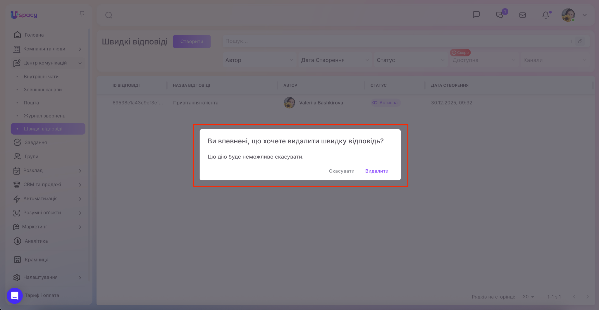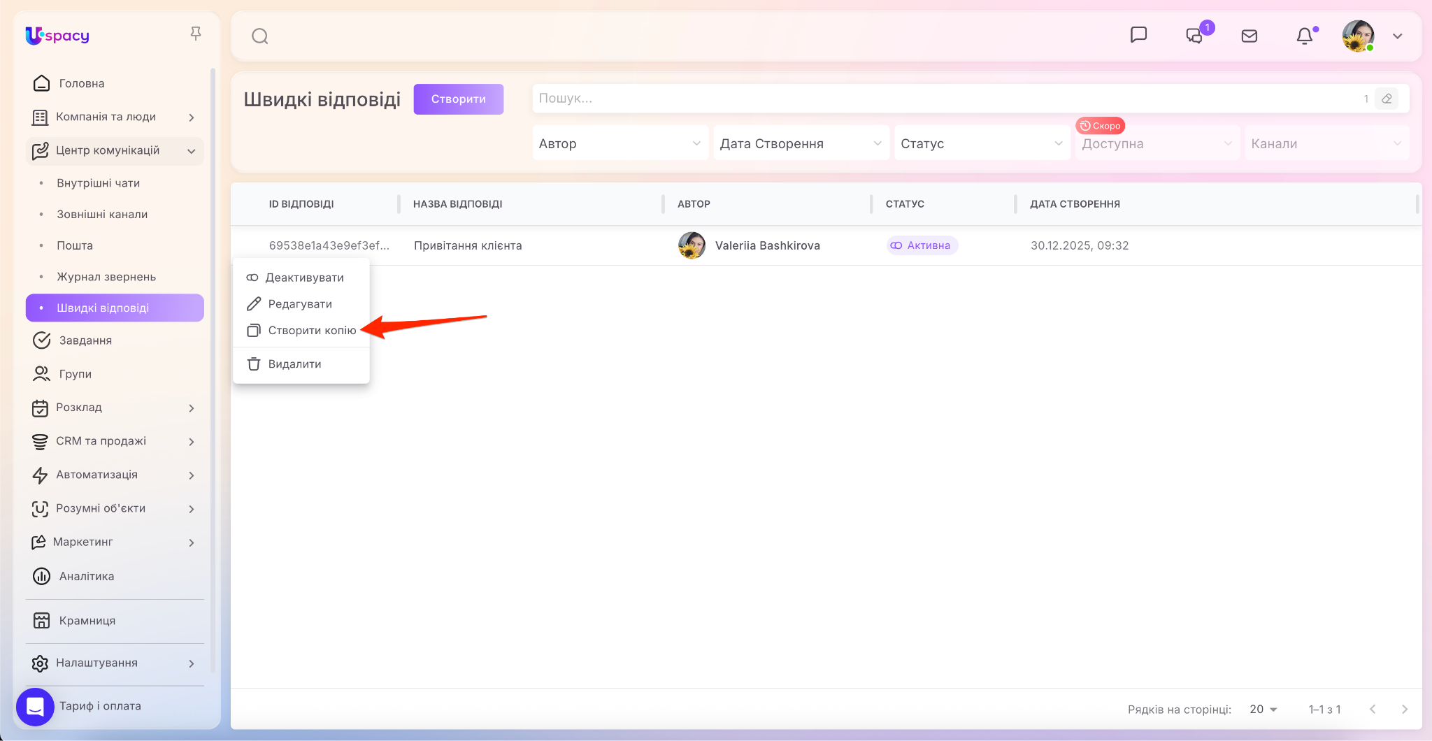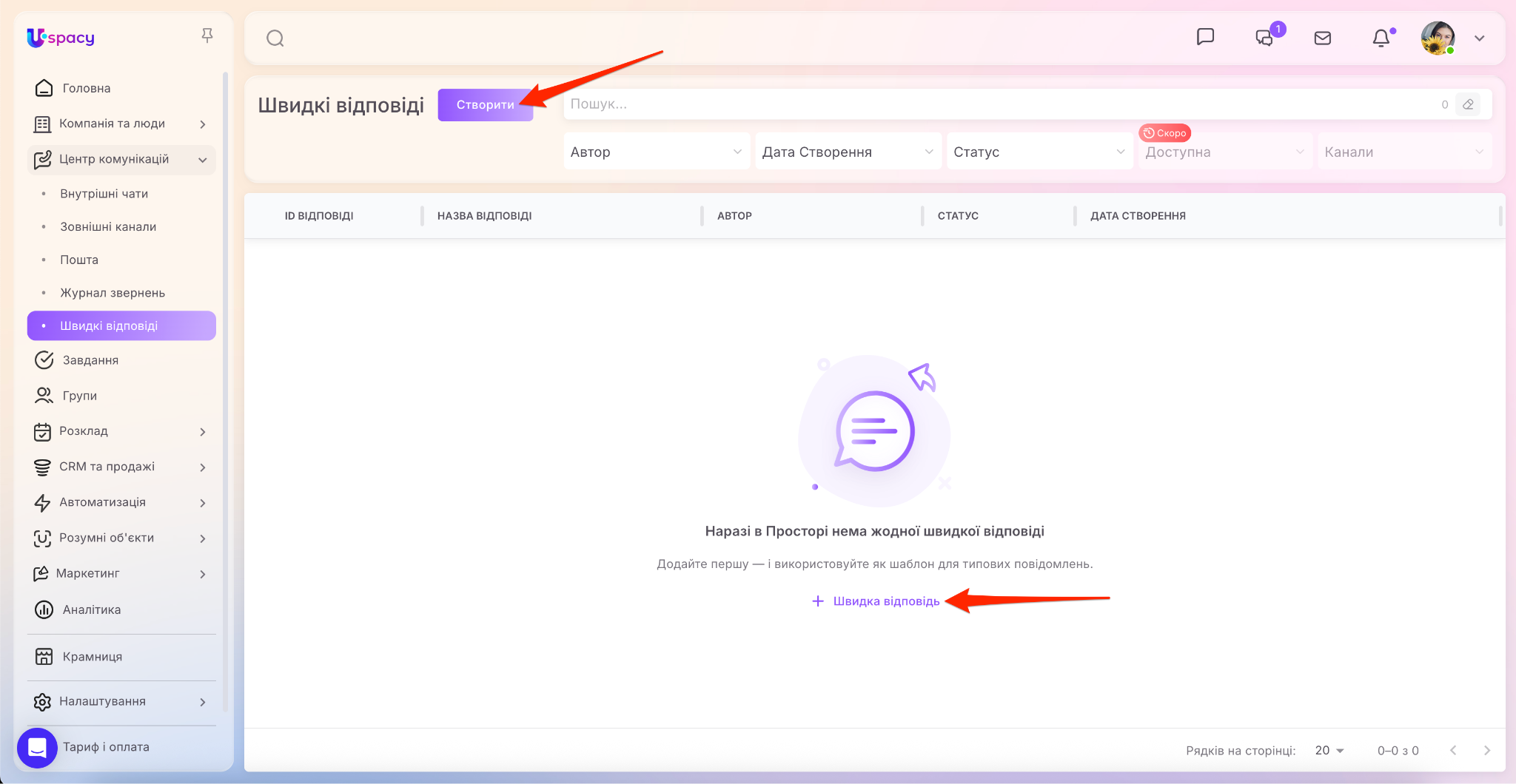 У Центрі комунікацій з’явився окремий пункт (доступ до нього мають тільки адміністратори та власник Простору), при переході у який можна керувати швидкими відповідями в Просторі. А саме створювати, редагувати їх, деактивовувати та видаляти непотрібні тощо.