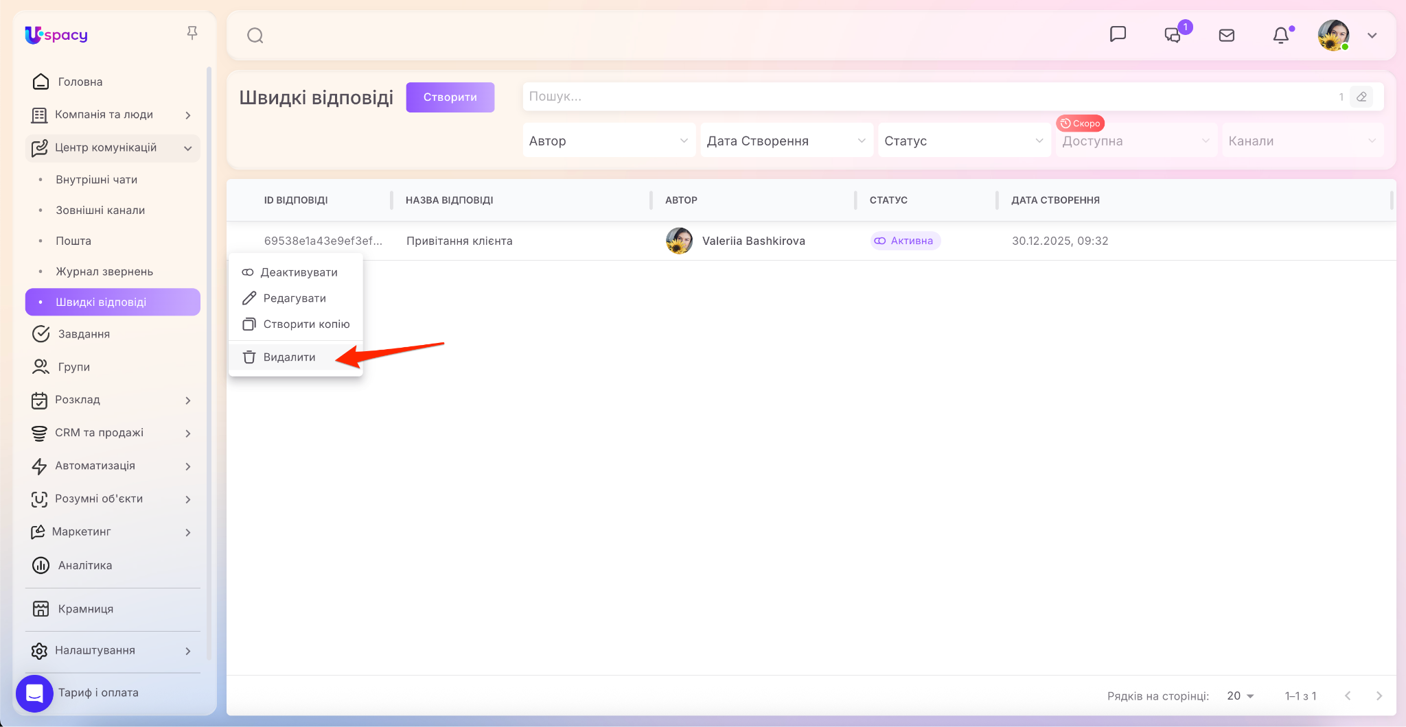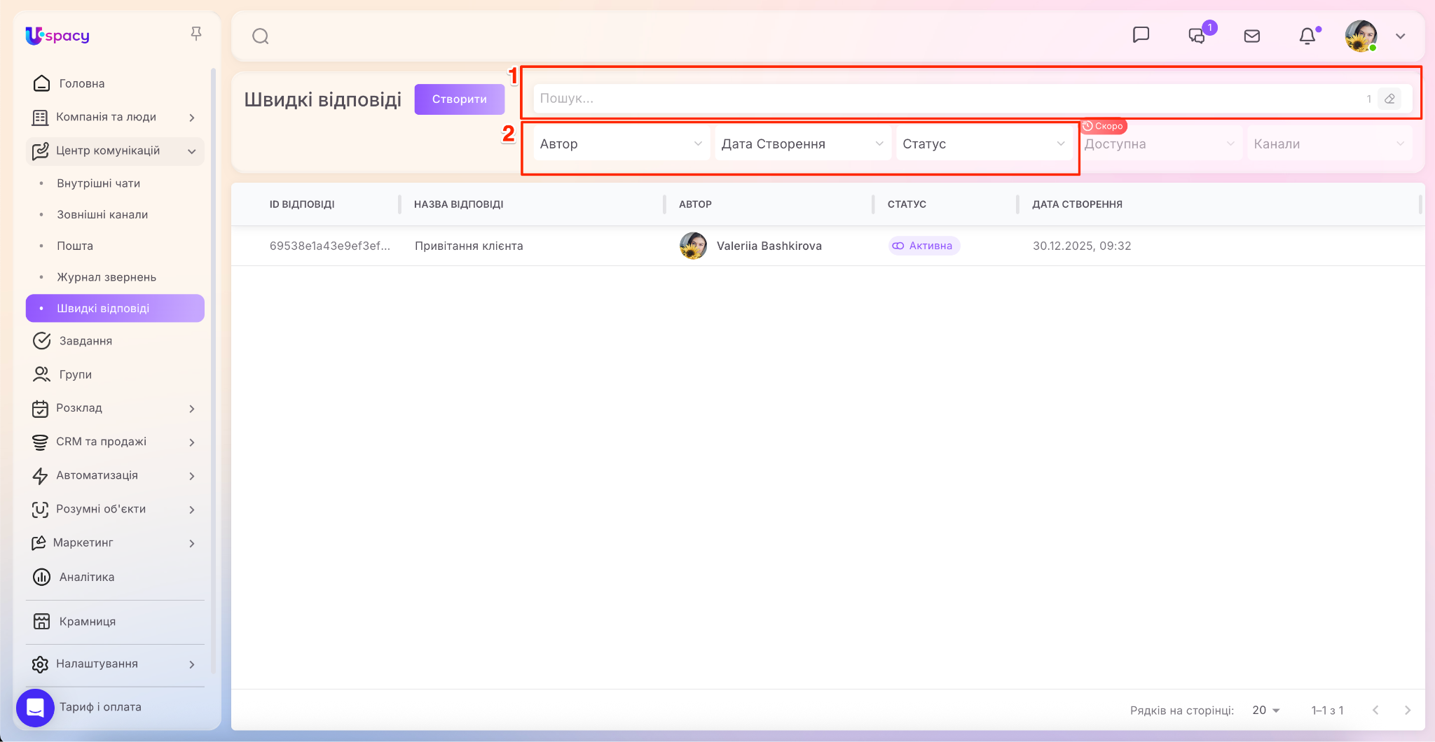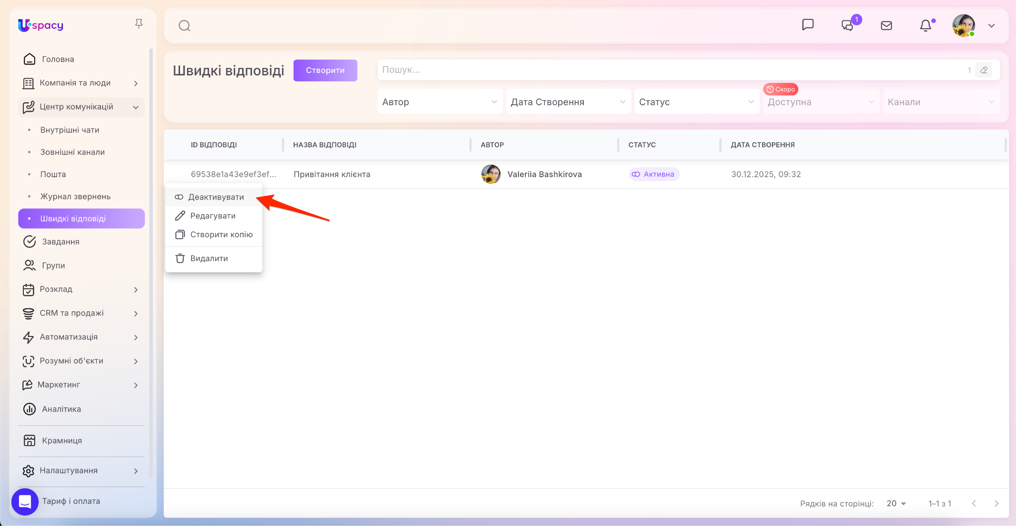 У Центрі комунікацій з’явився окремий пункт (доступ до нього мають тільки адміністратори та власник Простору), при переході у який можна керувати швидкими відповідями в Просторі. А саме створювати, редагувати їх, деактивовувати та видаляти непотрібні тощо.