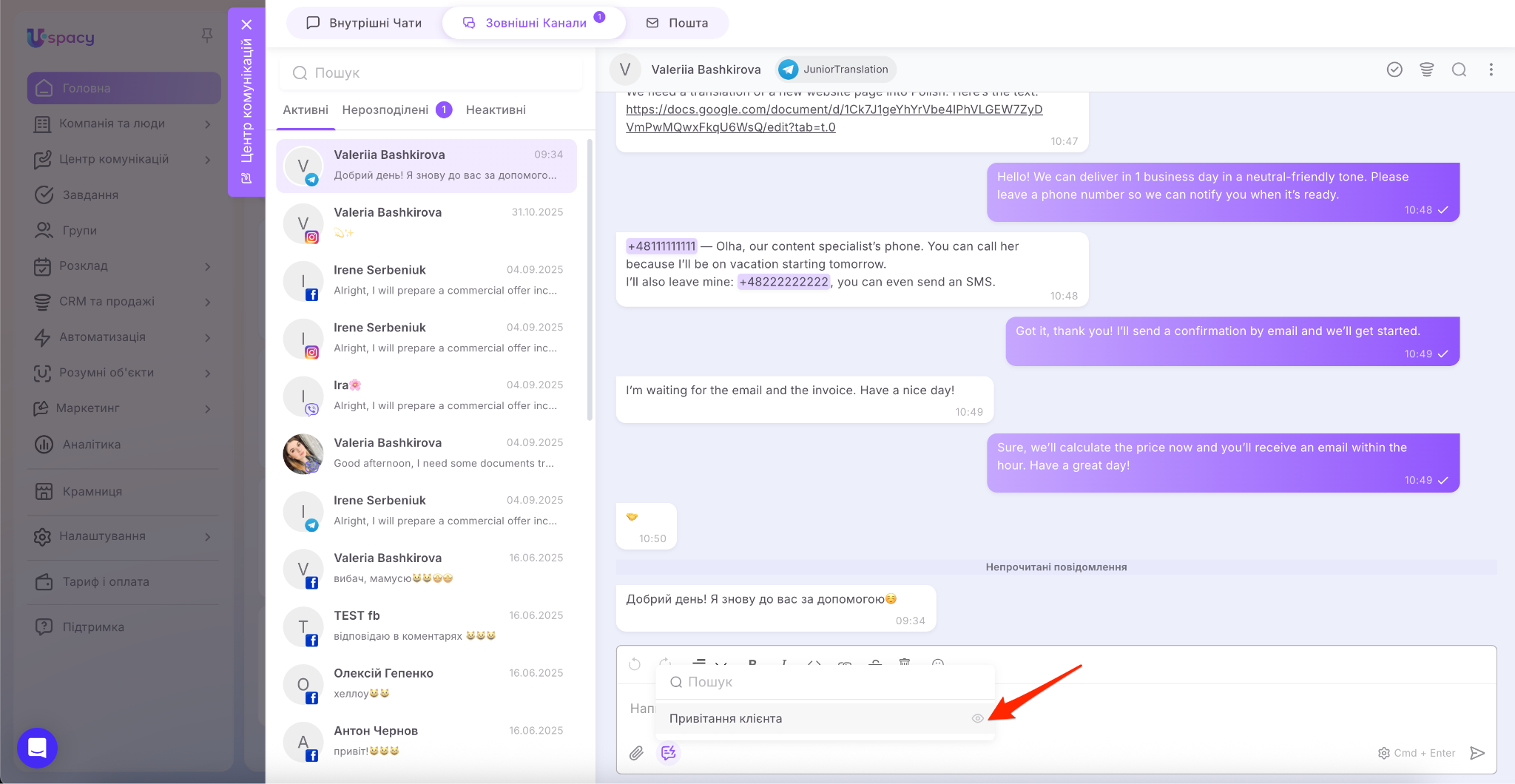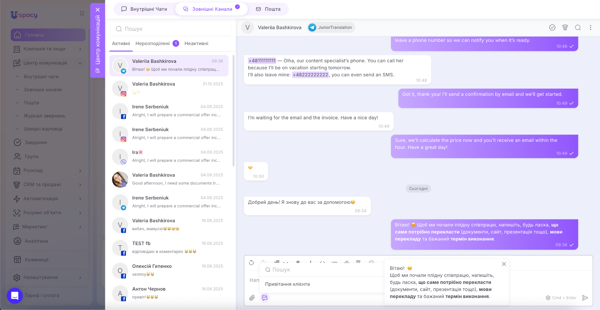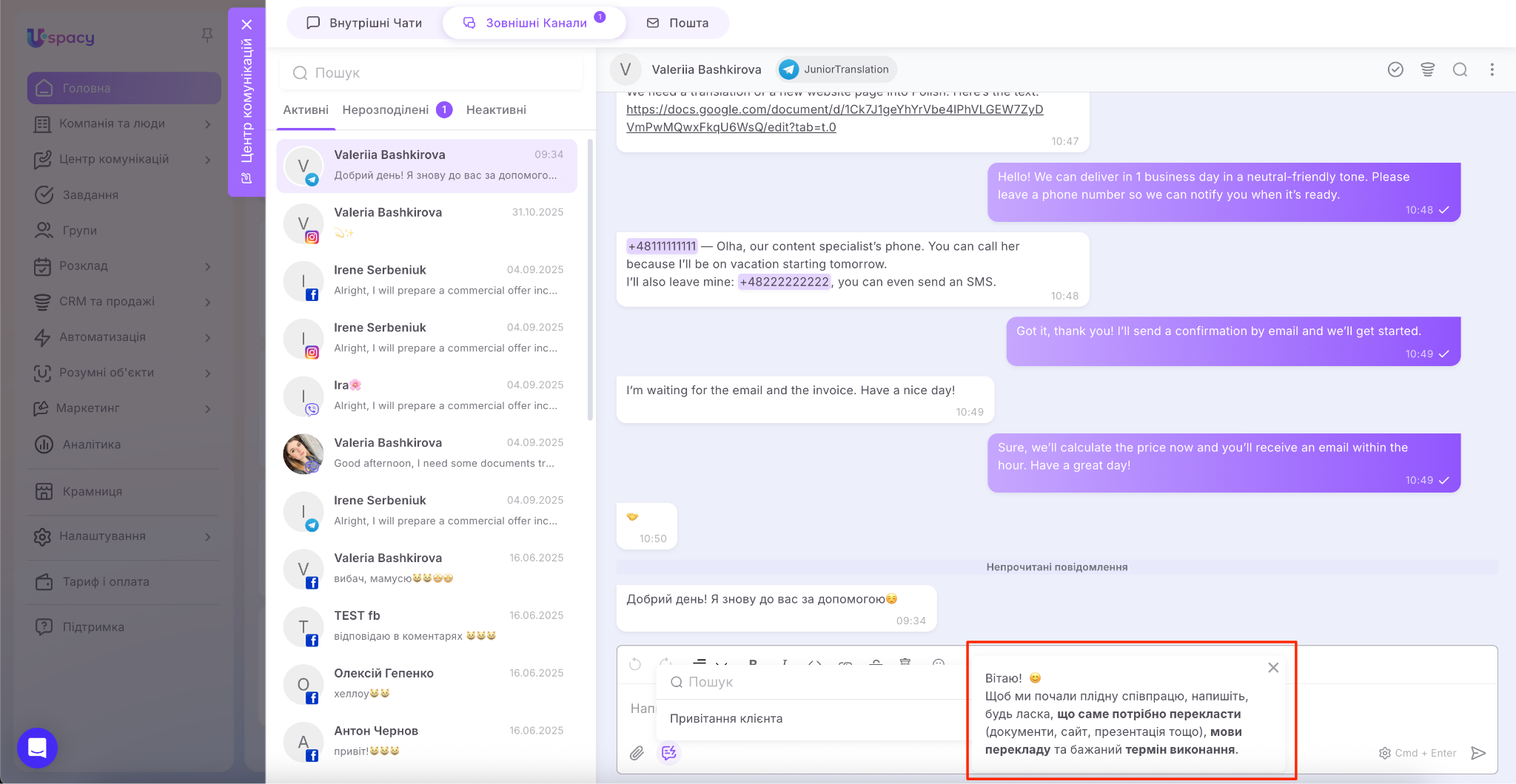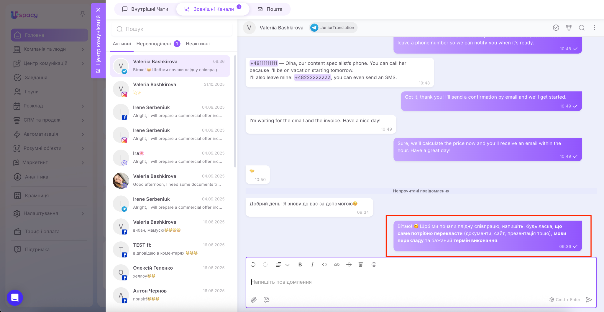 У результаті вся комунікація зібрана в одному місці, а менеджеру не потрібно постійно перемикатися між різними застосунками.