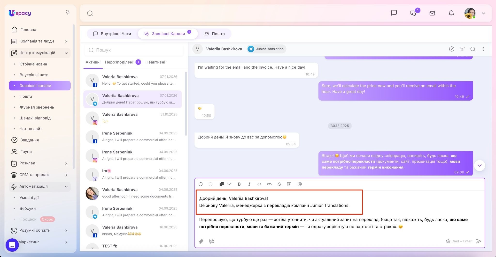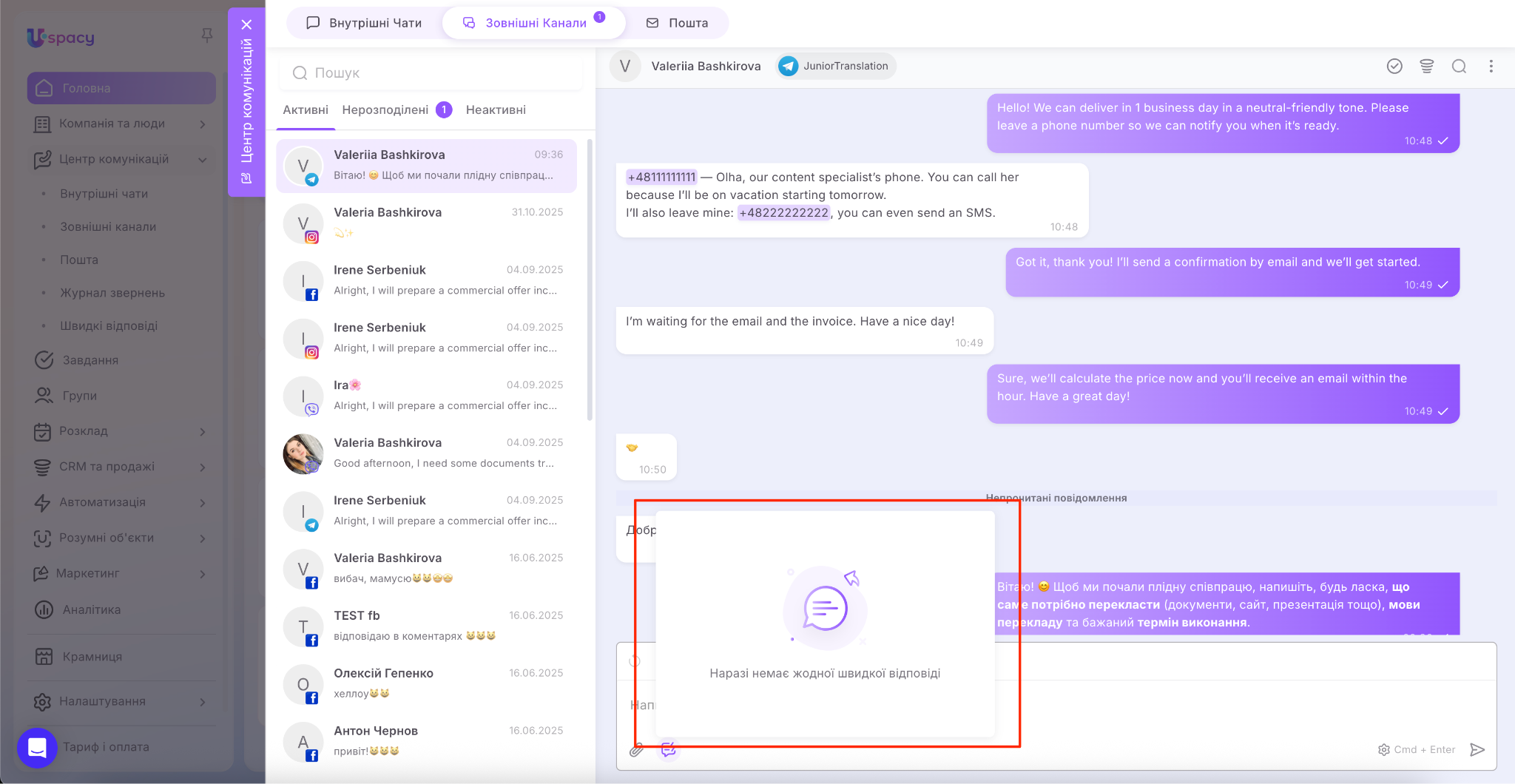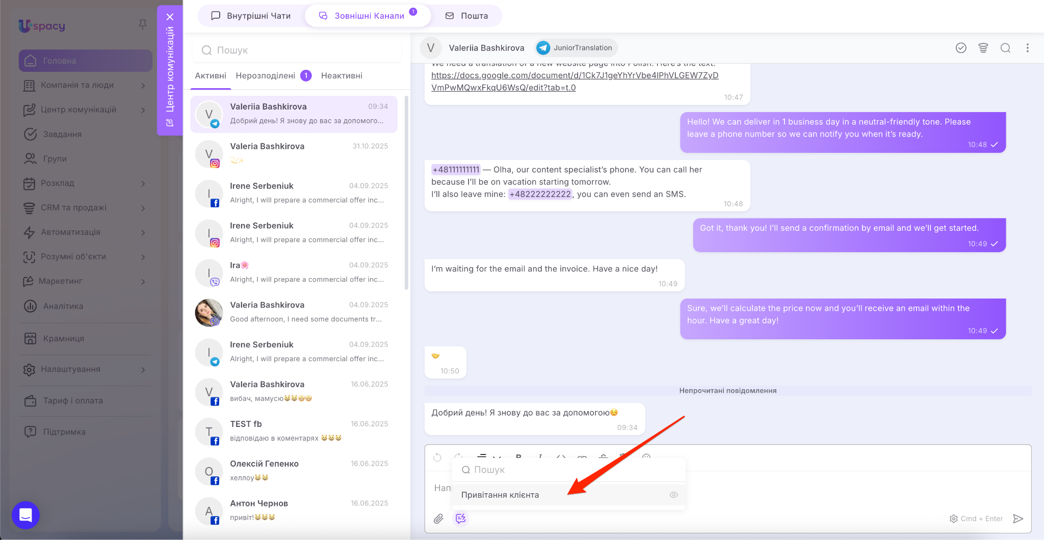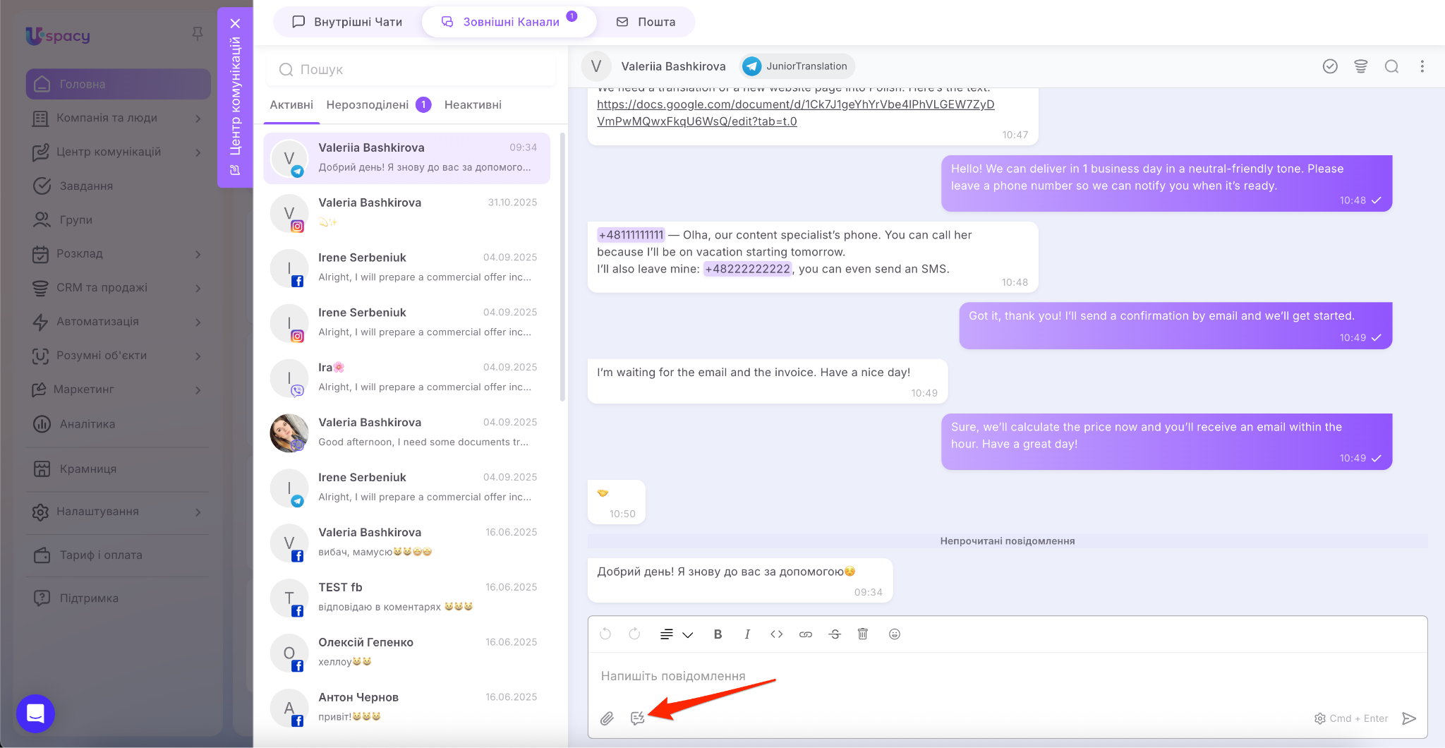 У результаті вся комунікація зібрана в одному місці, а менеджеру не потрібно постійно перемикатися між різними застосунками.