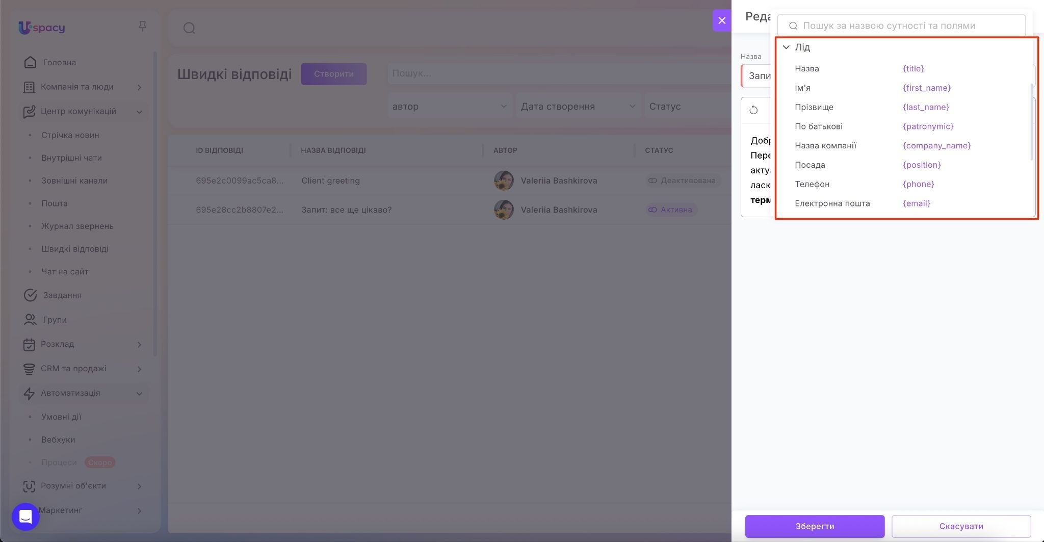 - Значення змінних підтягуються лише тоді, коли чат прив’язаний до відповідної сутності (ліда, угоди, контакту, компанії) й у вибраному полі є дані. Якщо поле порожнє, у тексті швидкої відповіді ця змінна підставиться порожнім значенням.
