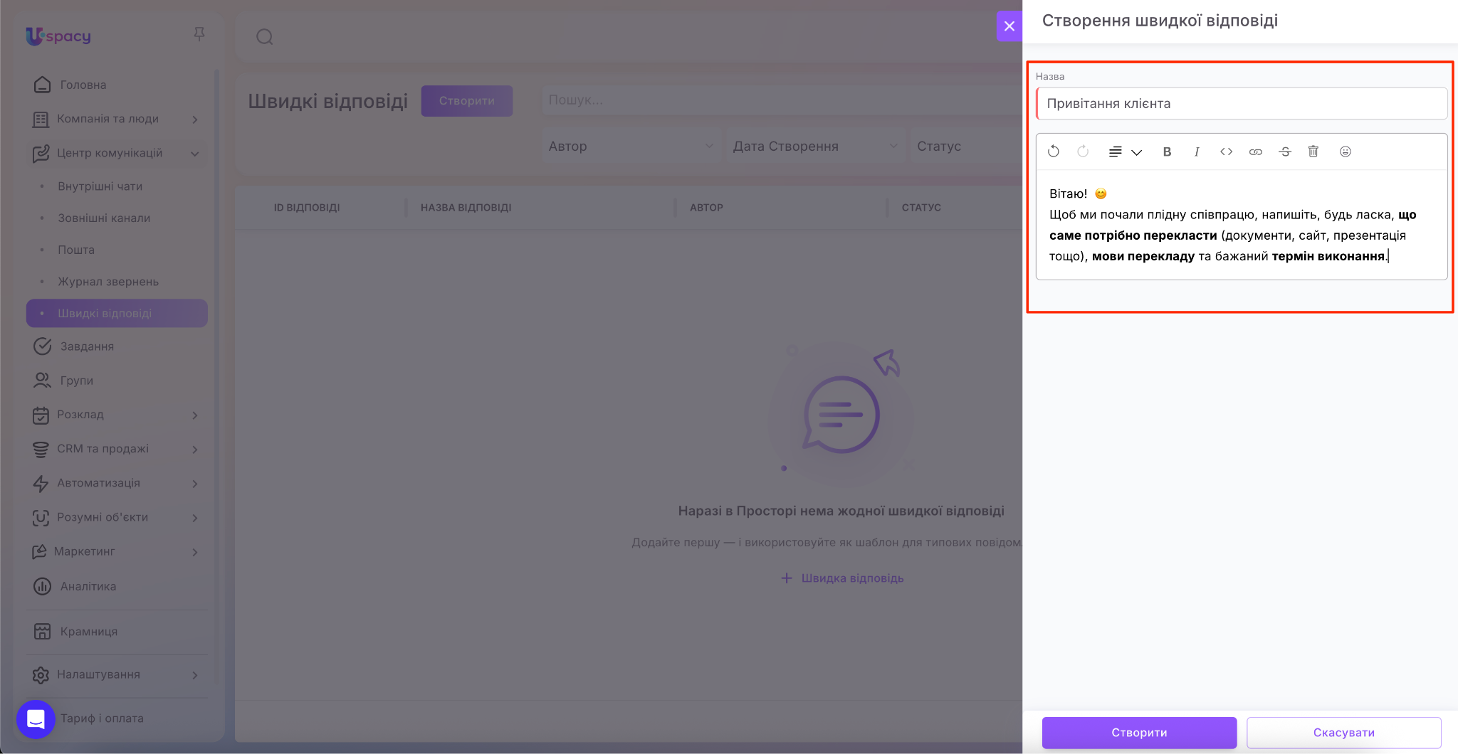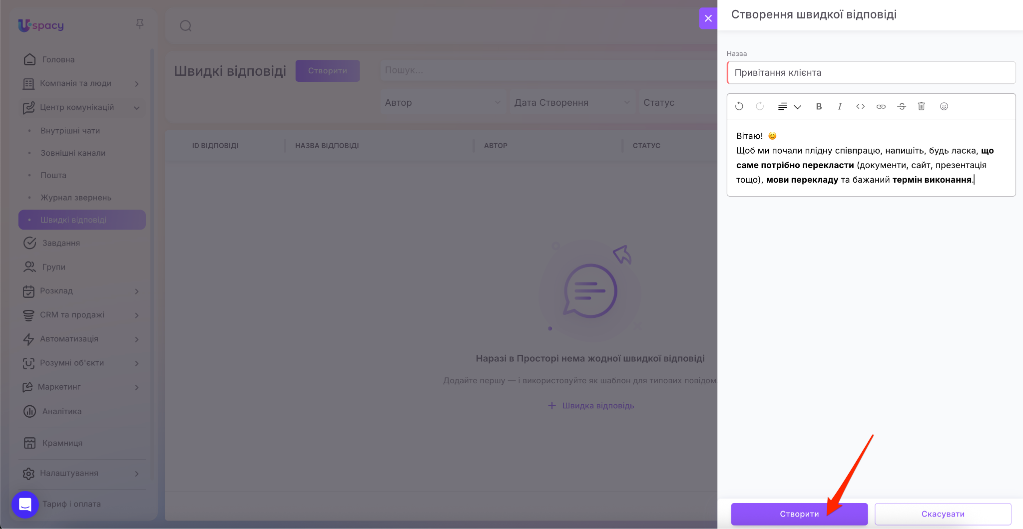 Для цього натисніть на кнопку Створити. Або на + Швидка відповідь, якщо додаєте першу.