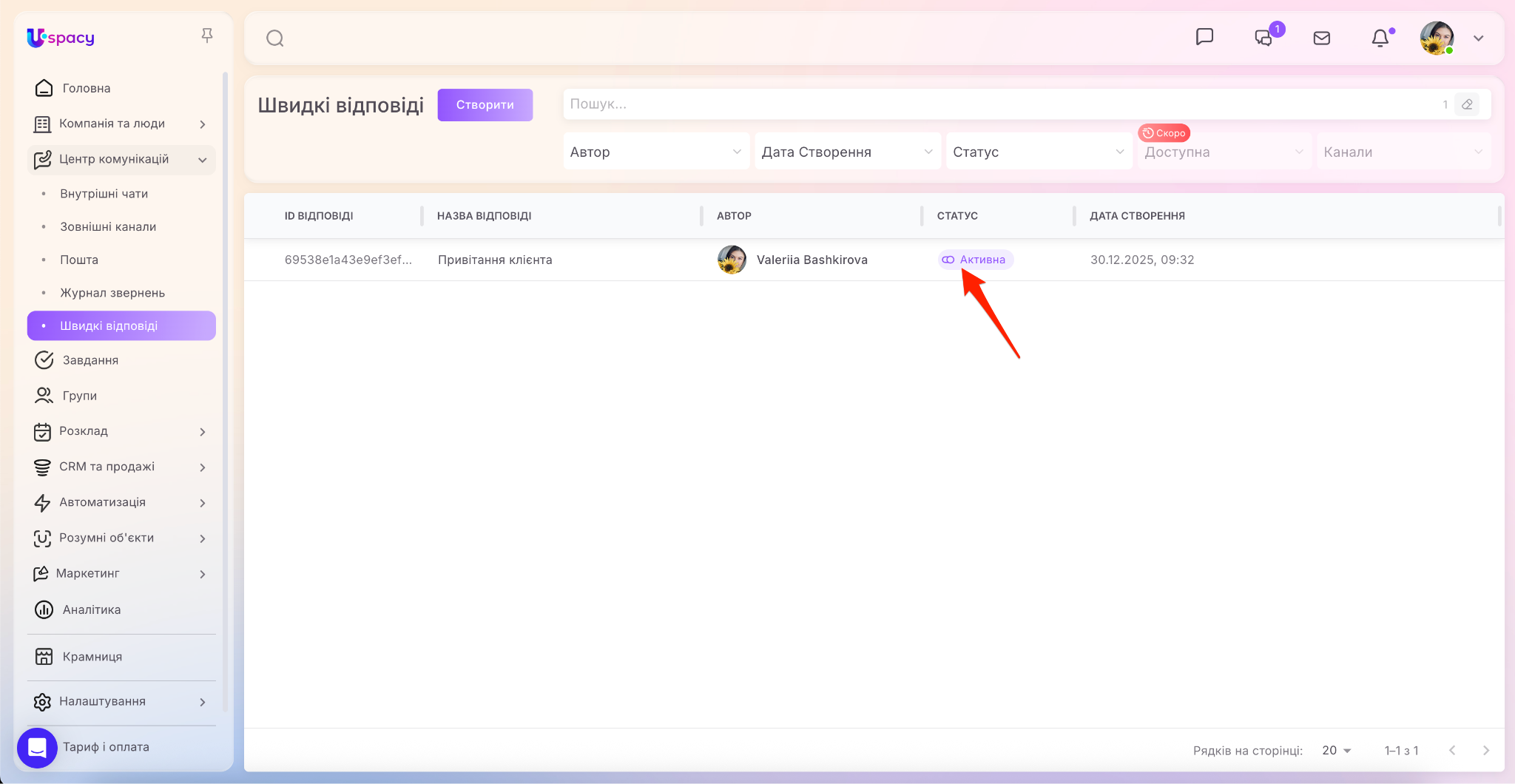 У результаті нова швидка відповідь з’явиться у списку та одразу отримає статус Активна.