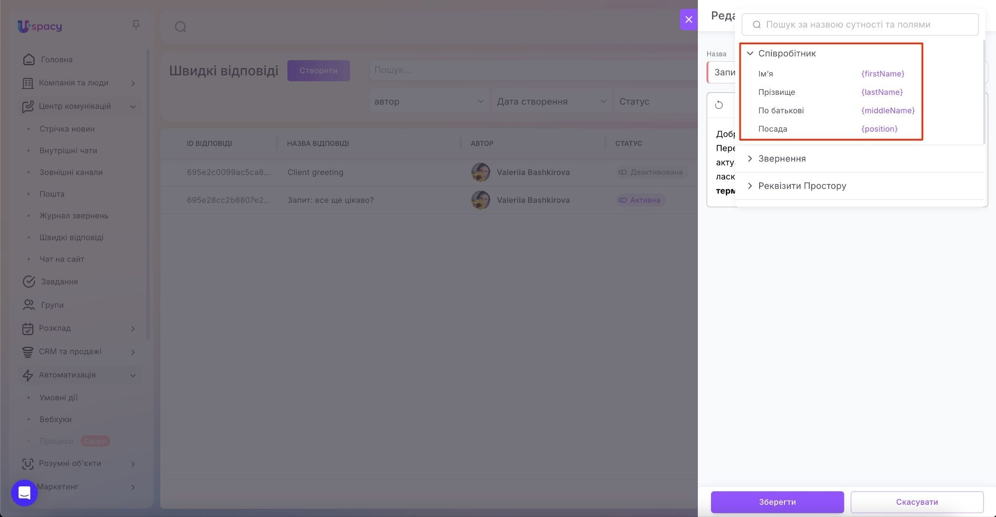 🟣 Співробітник – дані того користувача, який зараз використовує швидку відповідь у діалозі. Можна підтягнути ім’я, прізвище, по батькові та посаду. Зручно для автоматичного підпису на кшталт: