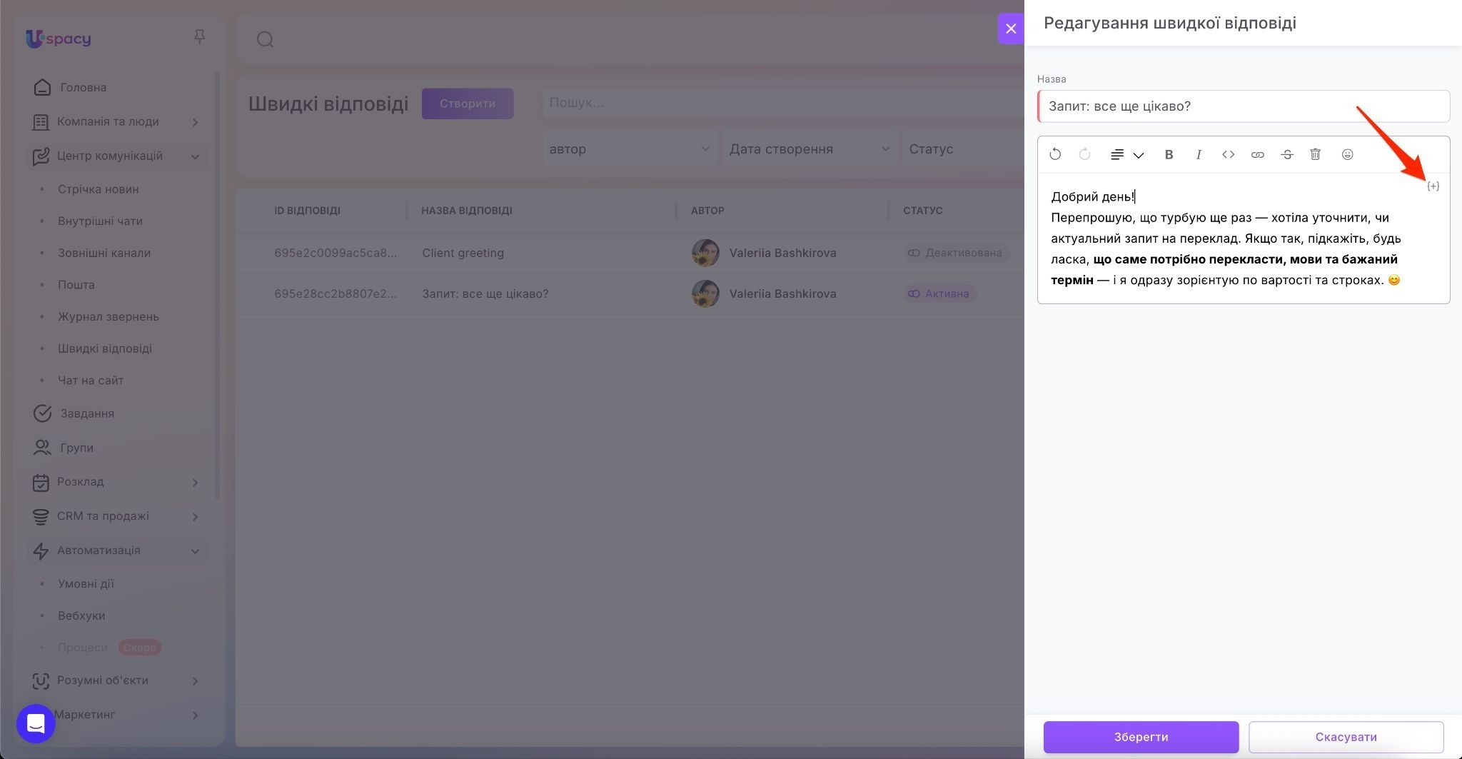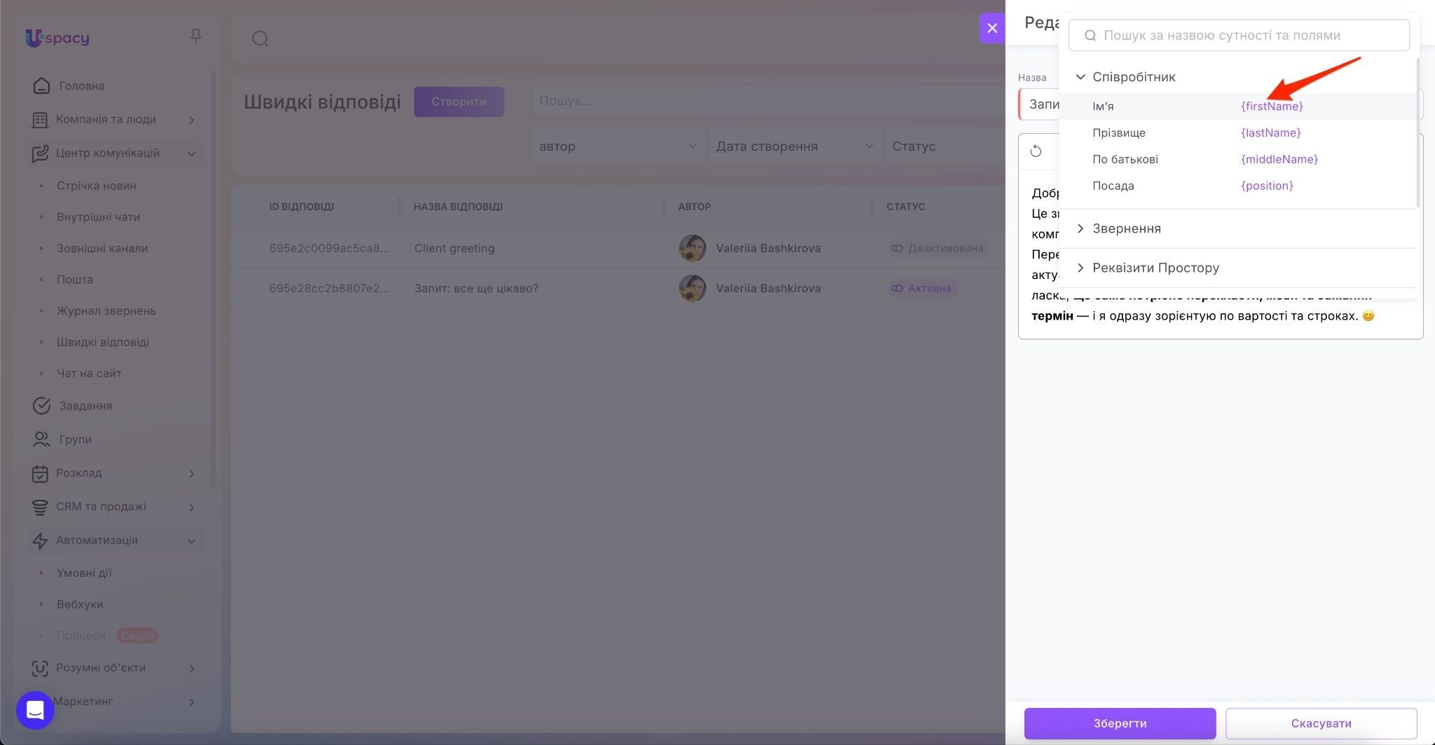 Отже, додаємо у наш текст швидкої відповіді змінні. Вибираємо потрібну. Наприклад, ім’я відповідального за чат оператора.