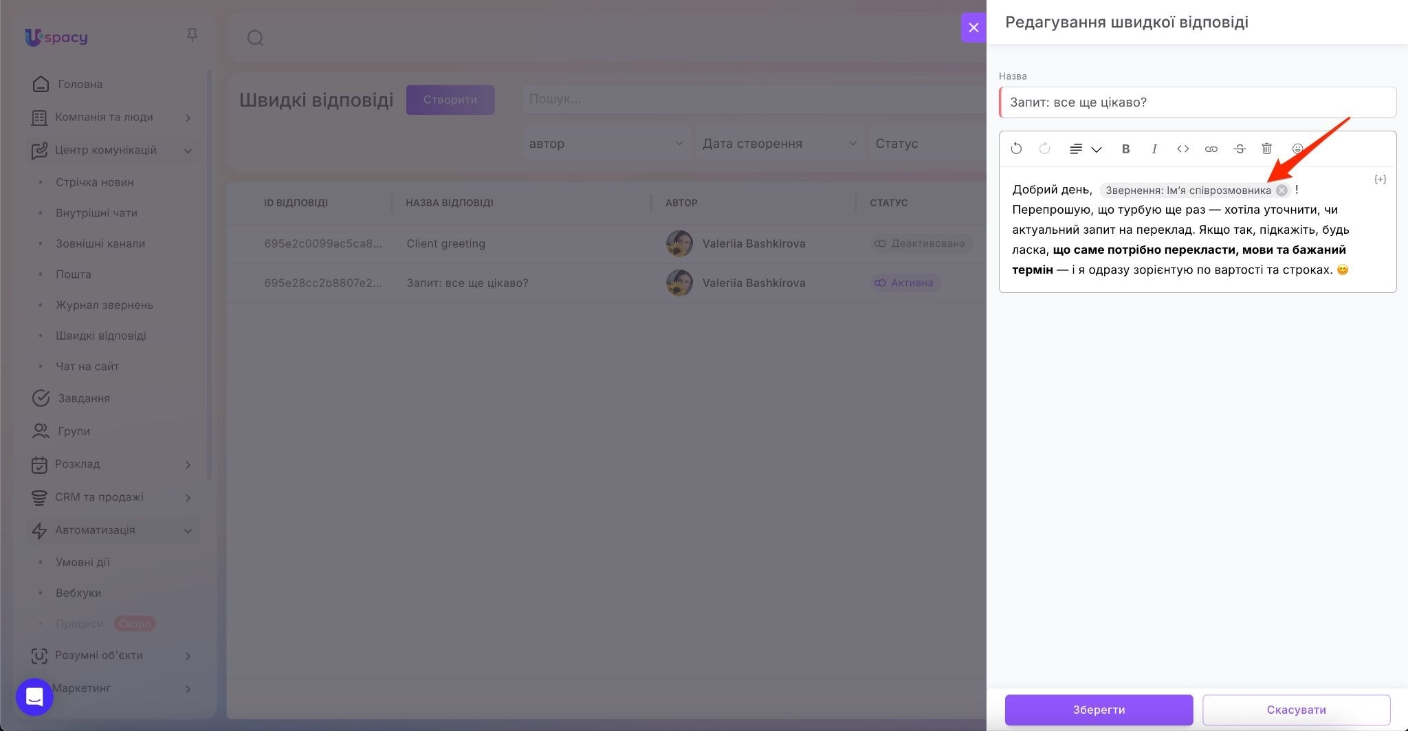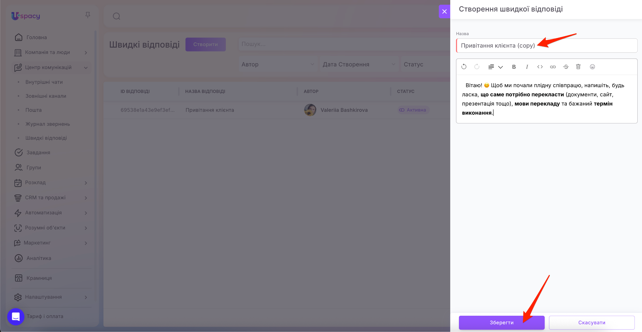 Відкриється форма, де ви зможете внести зміни в назву та в текст шаблонного повідомлення. Після цього натисніть Зберегти.