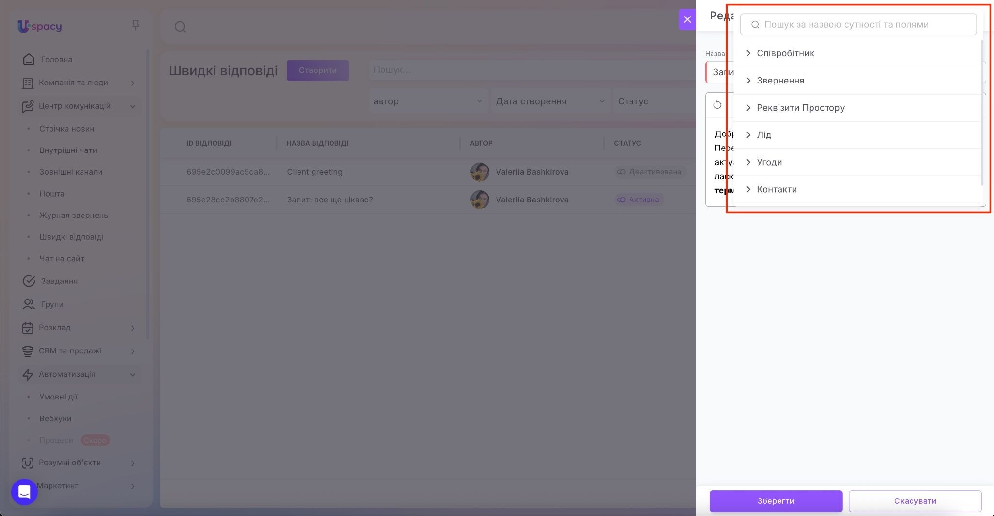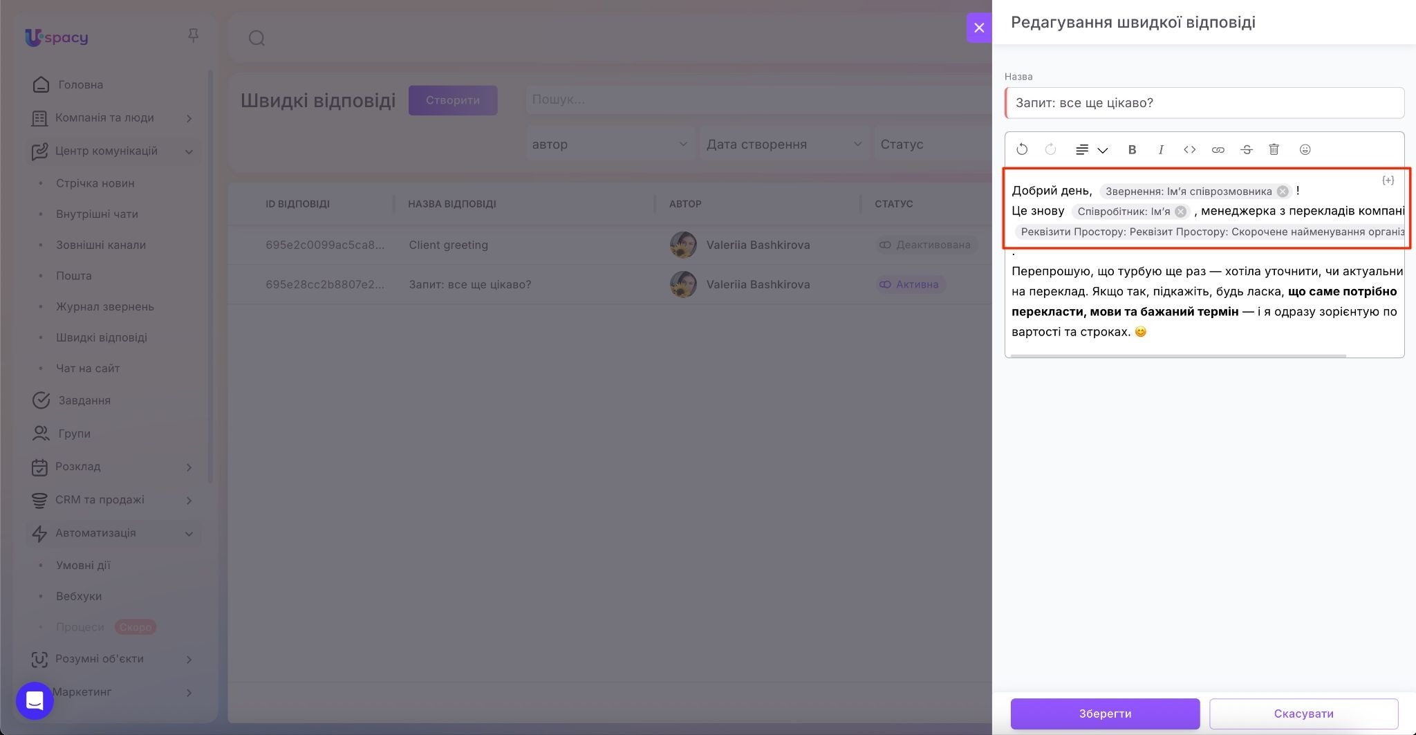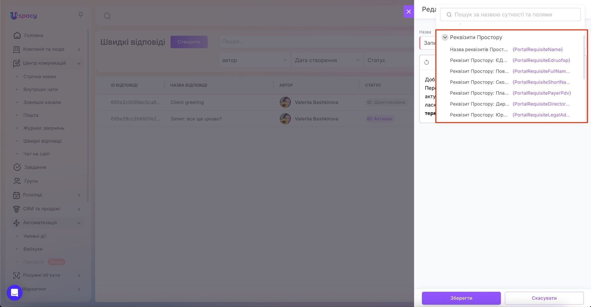 Це дозволяє персоналізувати відповідь (звернення на ім’я, передати контактні дані, назву компанії тощо). Наприклад, ви можете створити швидку відповідь Реквізити для оплати, де всі платіжні дані автоматично підтягуватимуться з реквізитів Простору, або шаблон Номер відправлення, у якому змінна підставлятиме номер ТТН із відповідного поля в картці угоди чи іншої сутності.