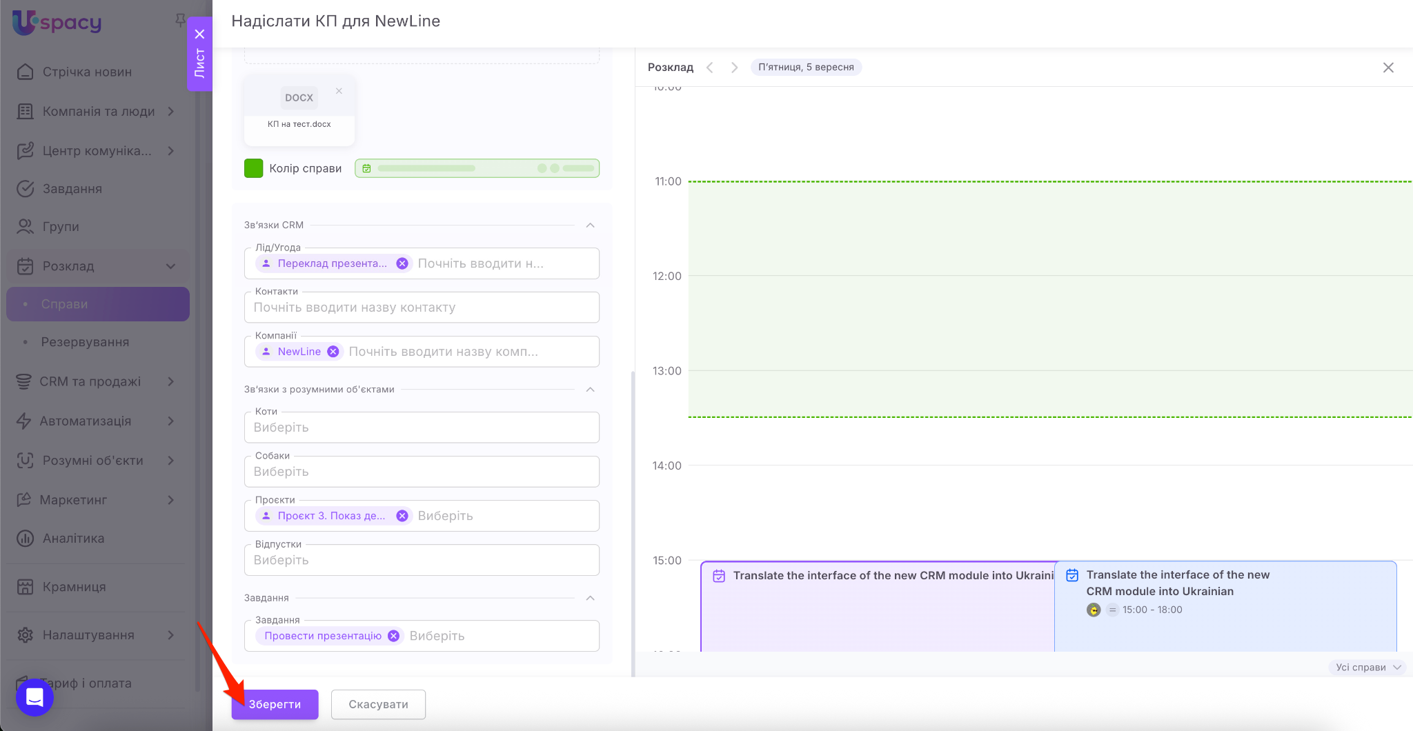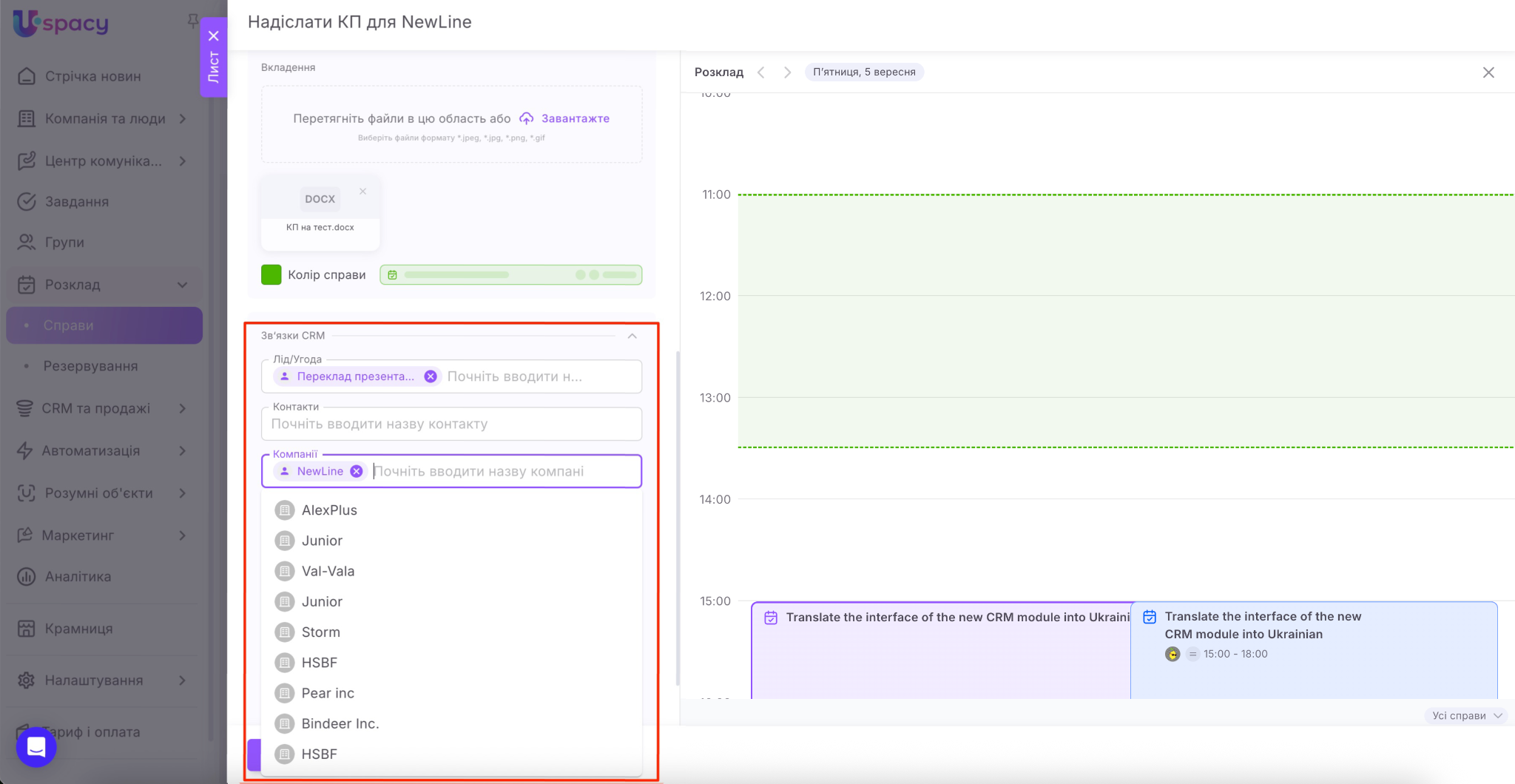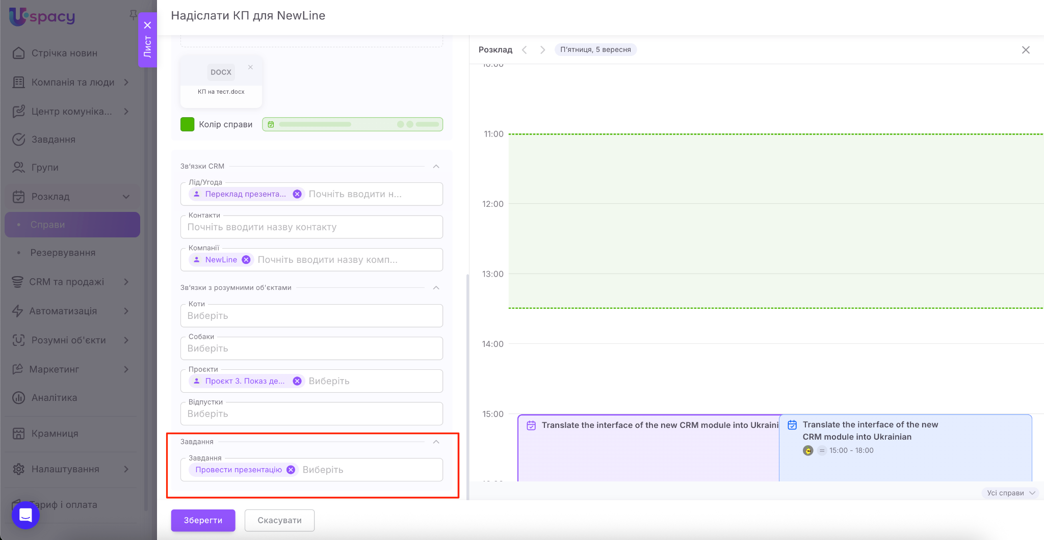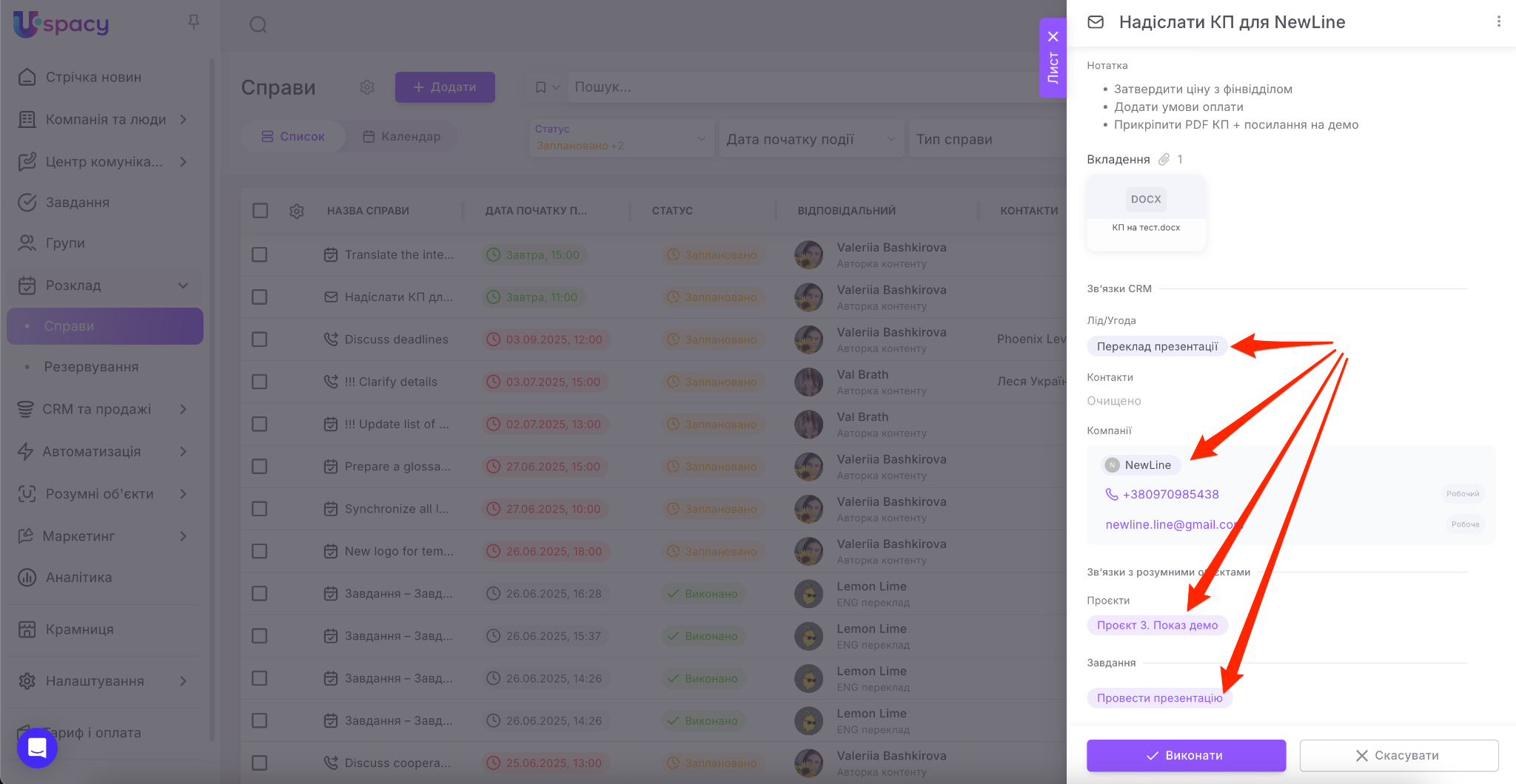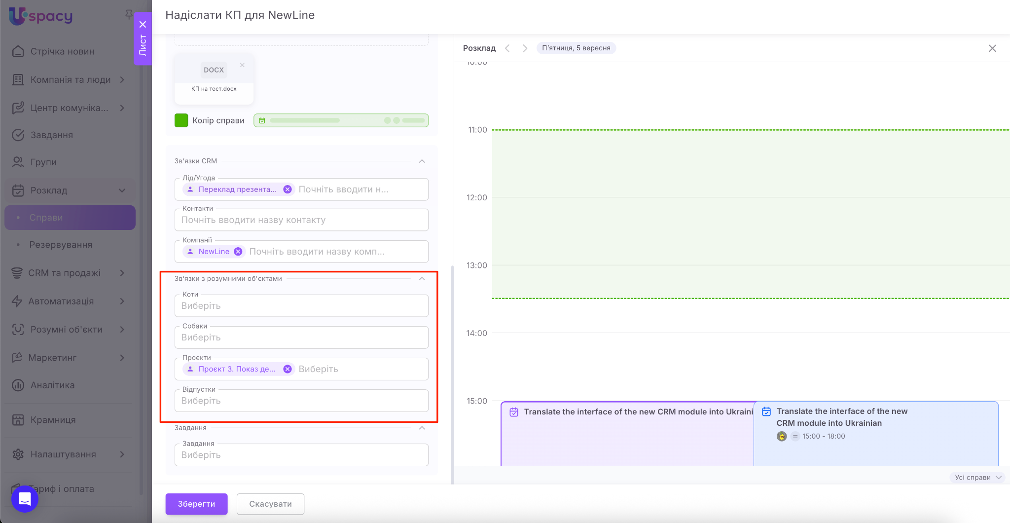 Наостанок пов’яжіть справу, яку створюєте, з потрібними елементами CRM (лідом, угодою, контактом чи компанією).