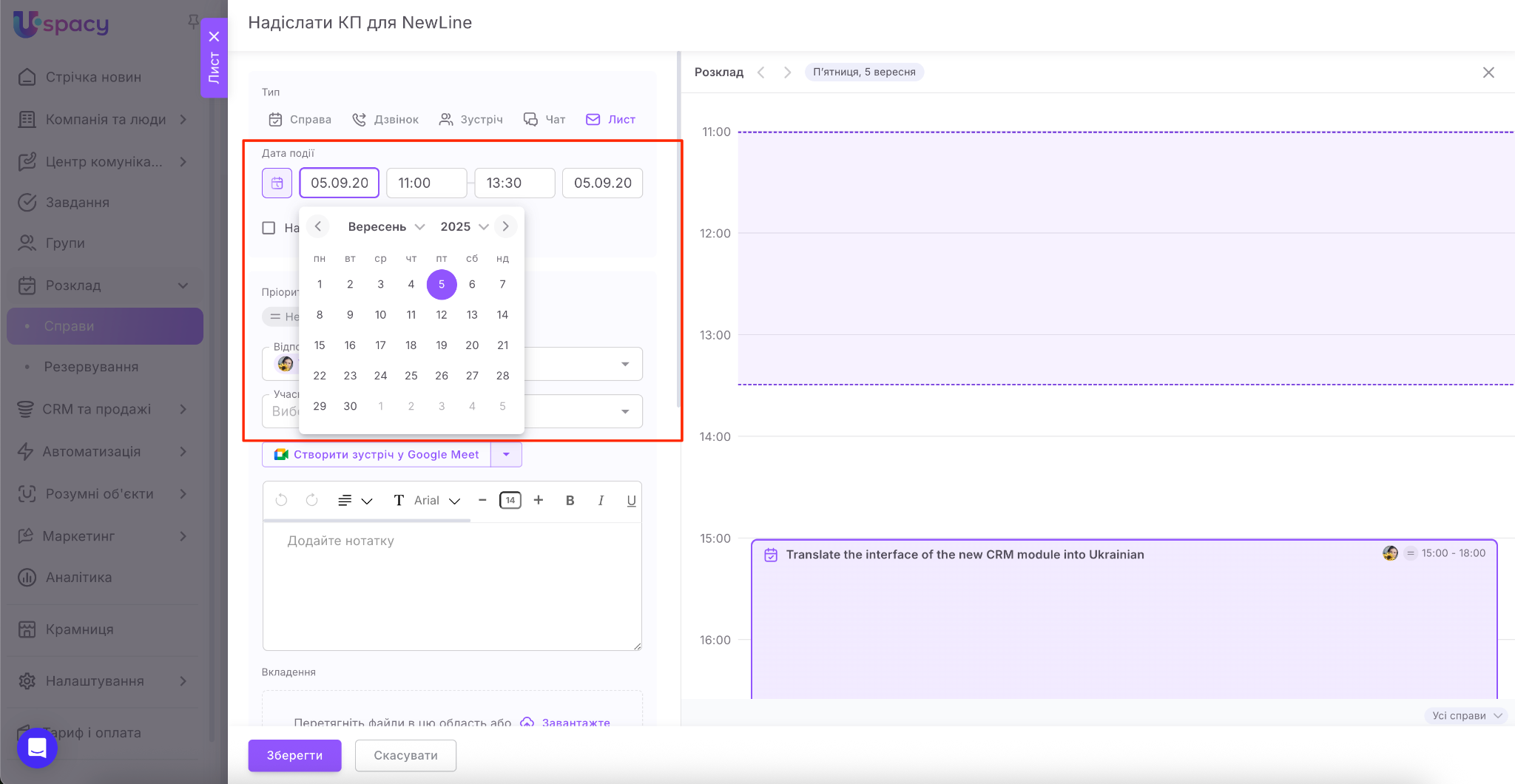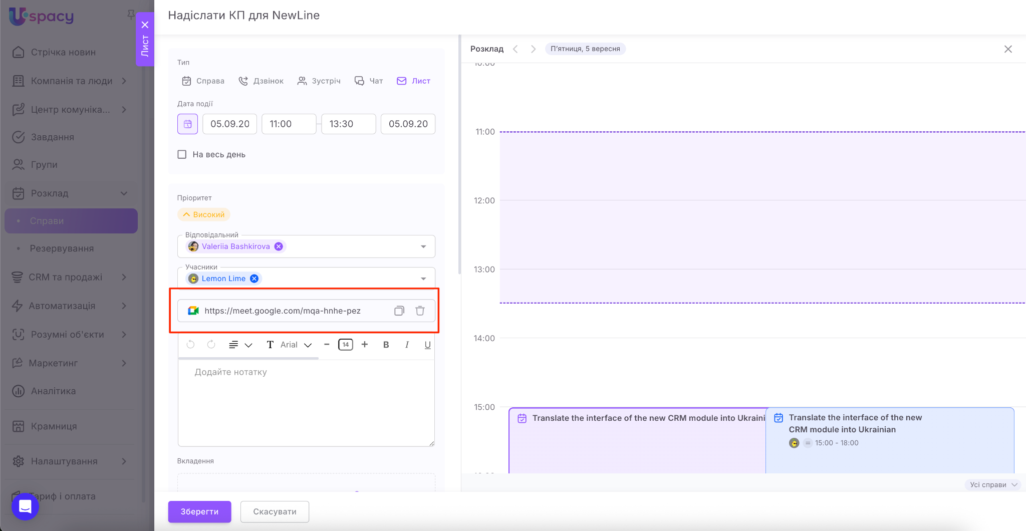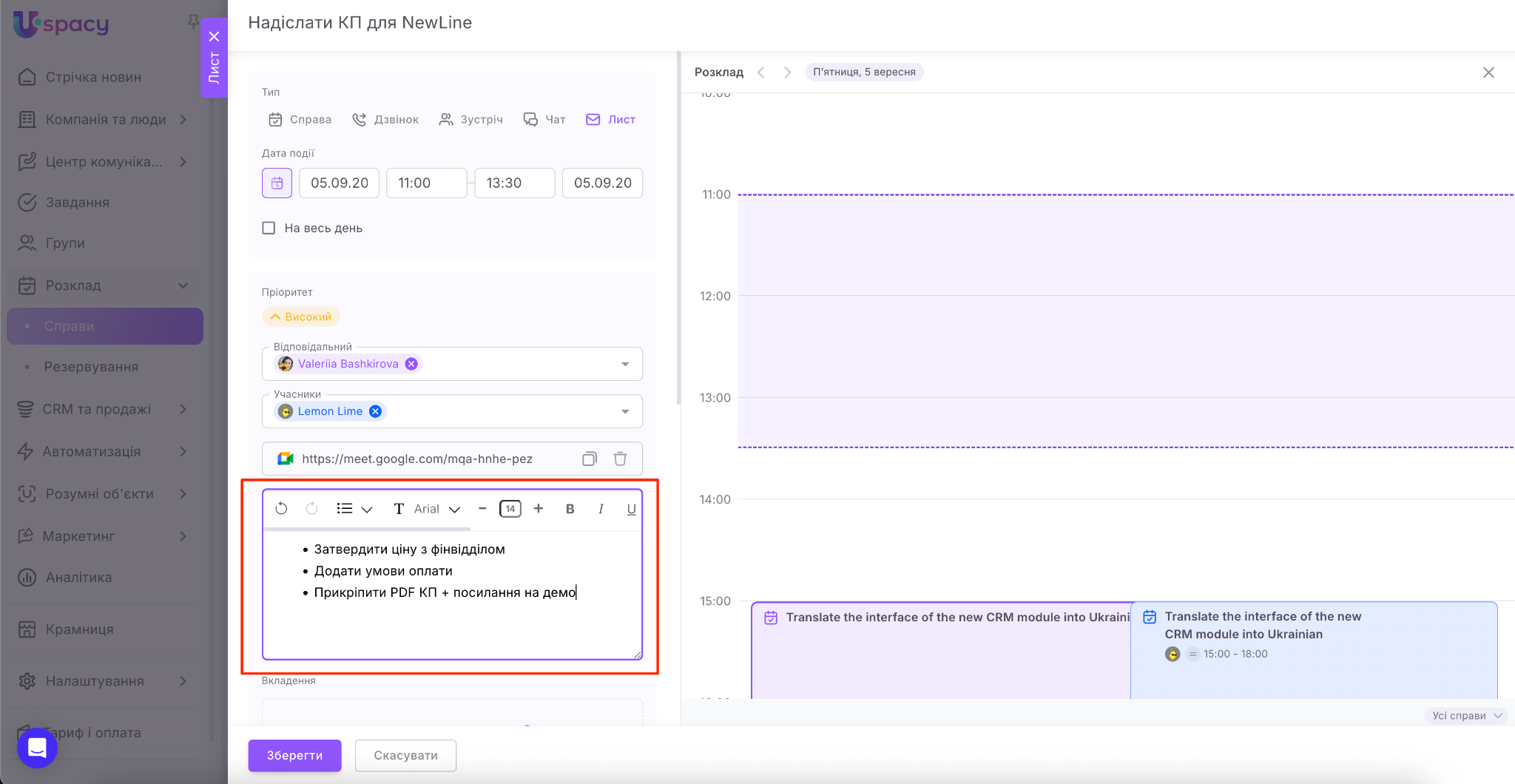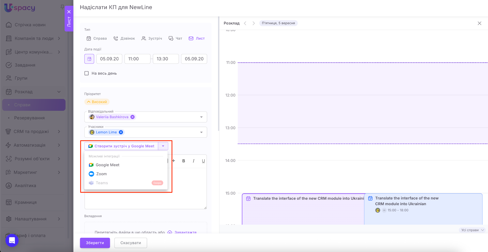 Якщо ви є користувачами комерційних тарифних планів, то одразу під час планування справи ви можете створити посилання на відеозустріч у сервісі Google Meet або Zoom.