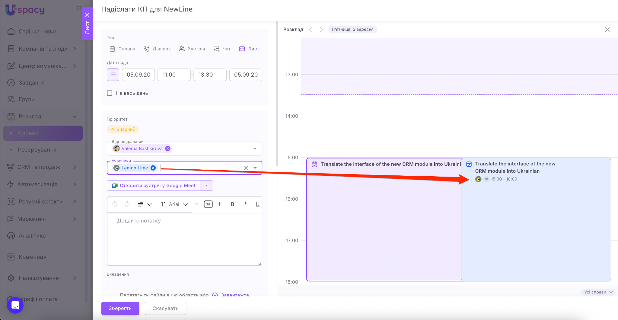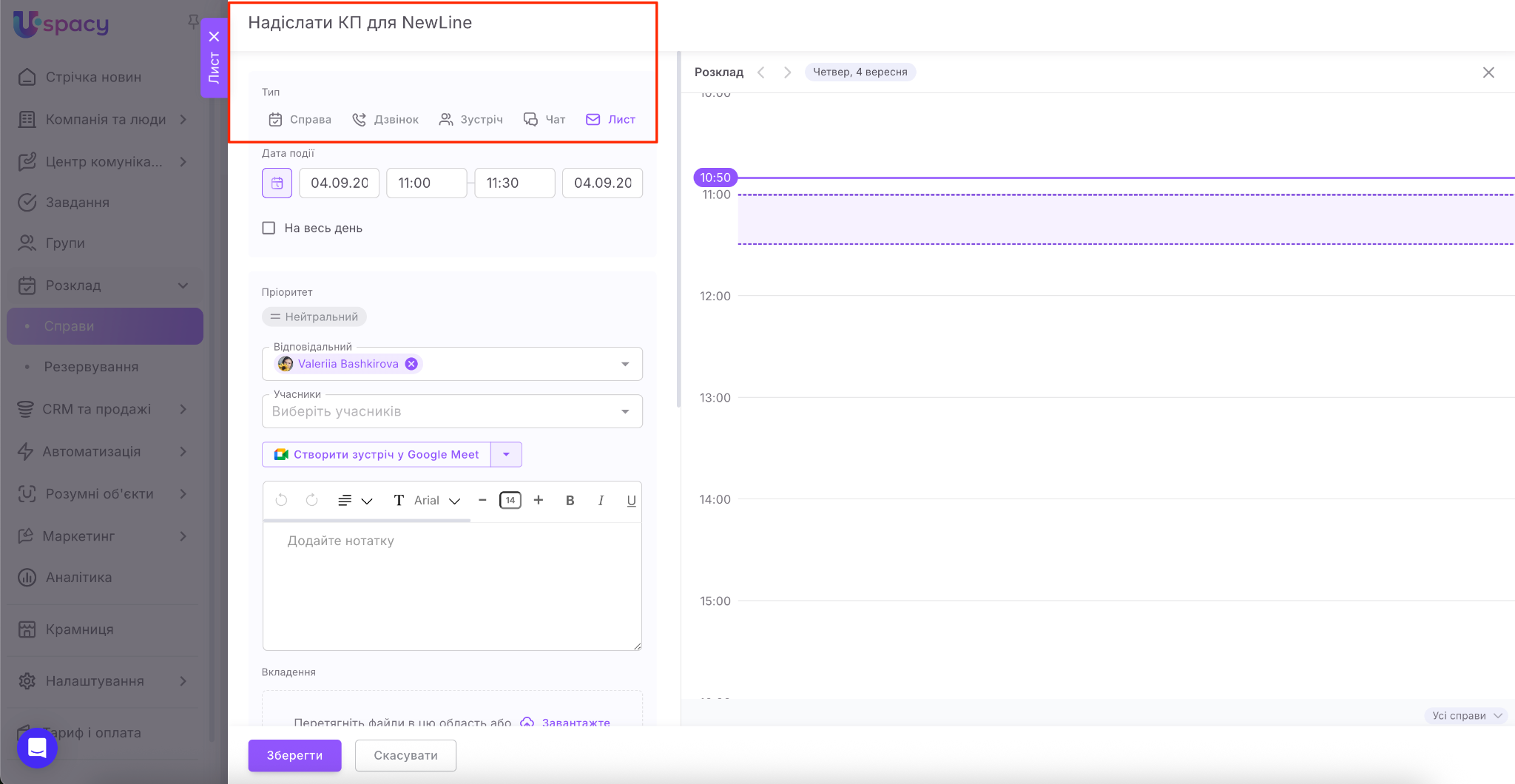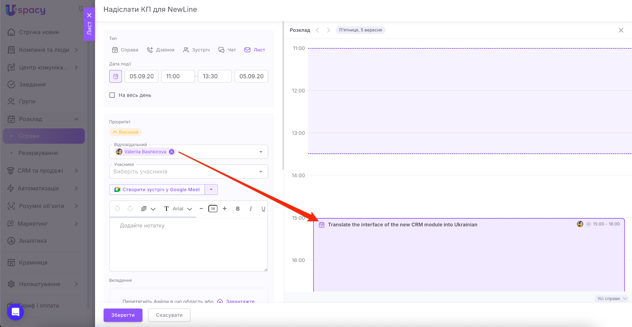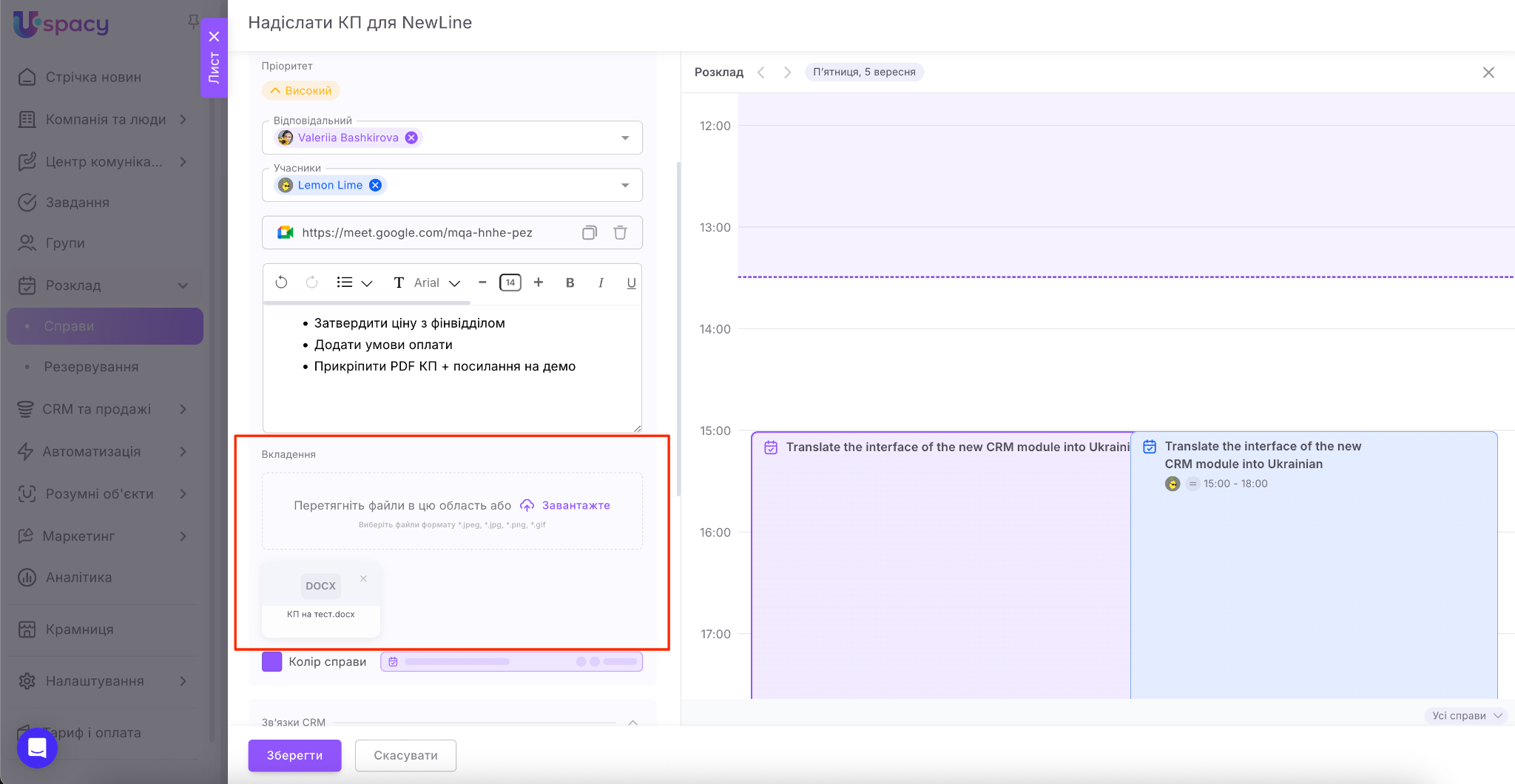 Якщо ви є користувачами комерційних тарифних планів, то одразу під час планування справи ви можете створити посилання на відеозустріч у сервісі Google Meet або Zoom.
