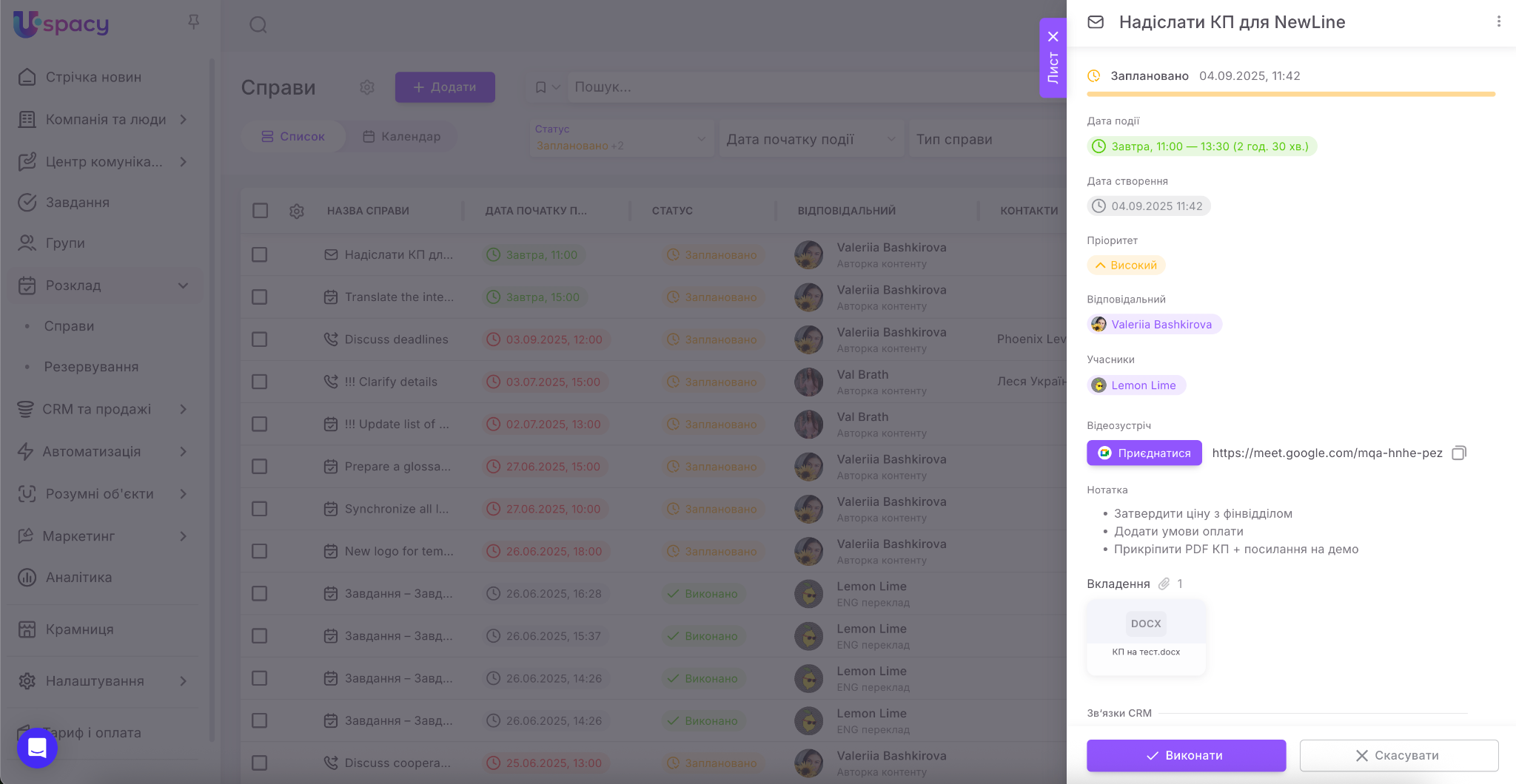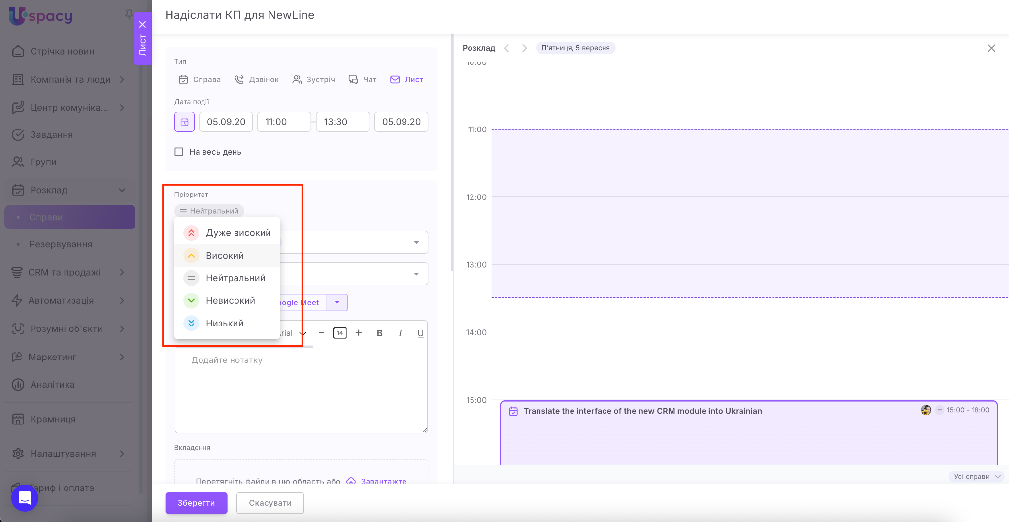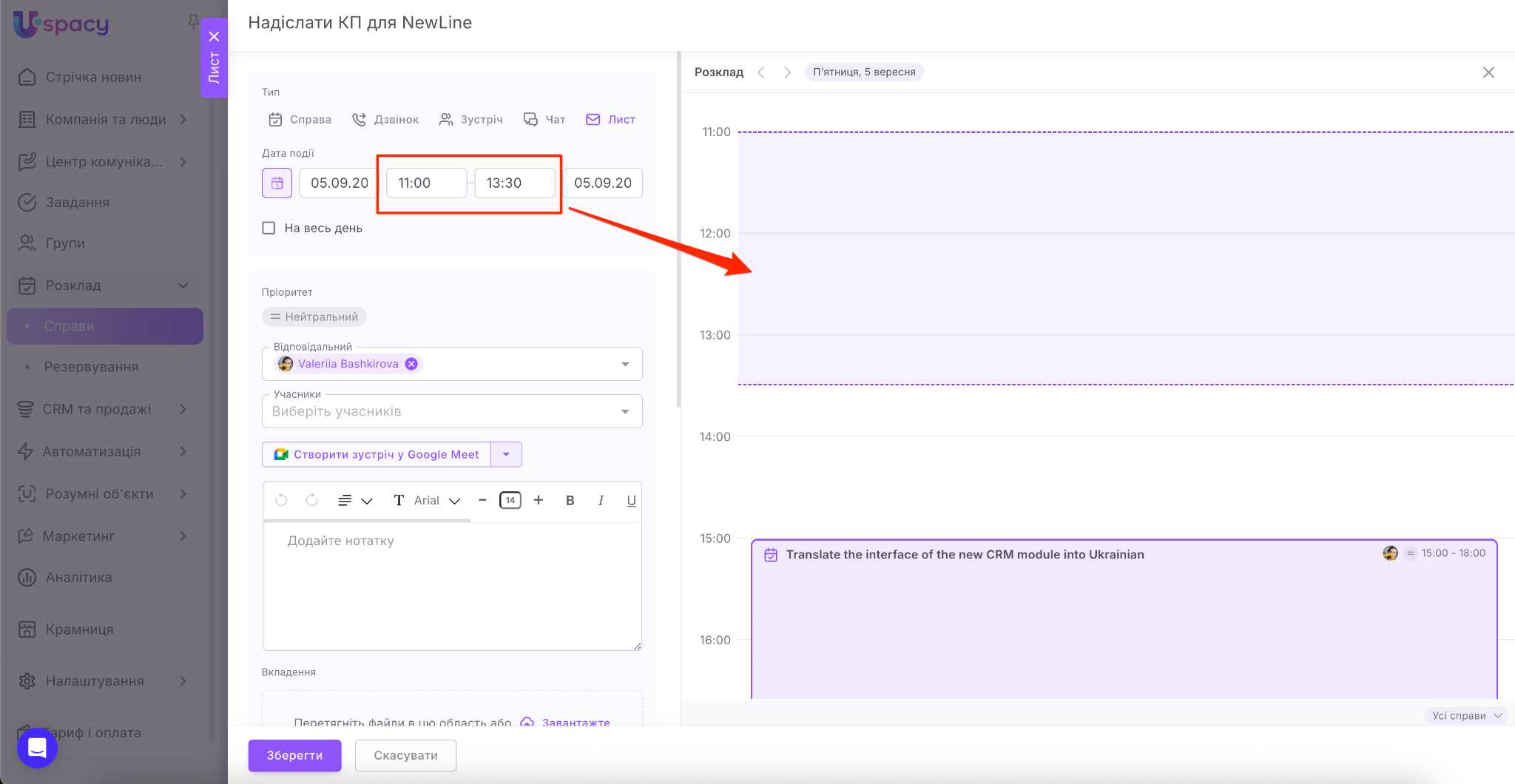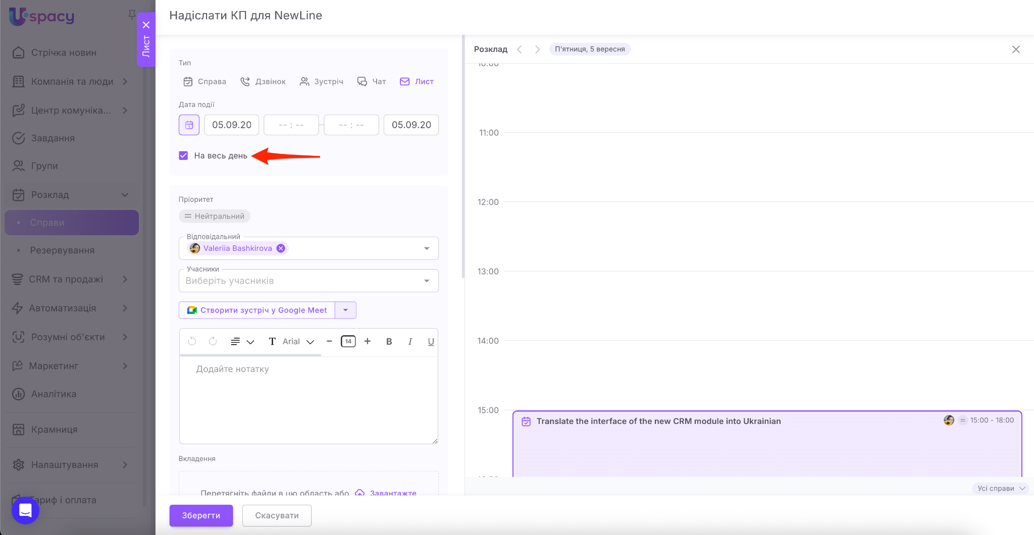 Якщо ви є користувачами комерційних тарифних планів, то одразу під час планування справи ви можете створити посилання на відеозустріч у сервісі Google Meet або Zoom.