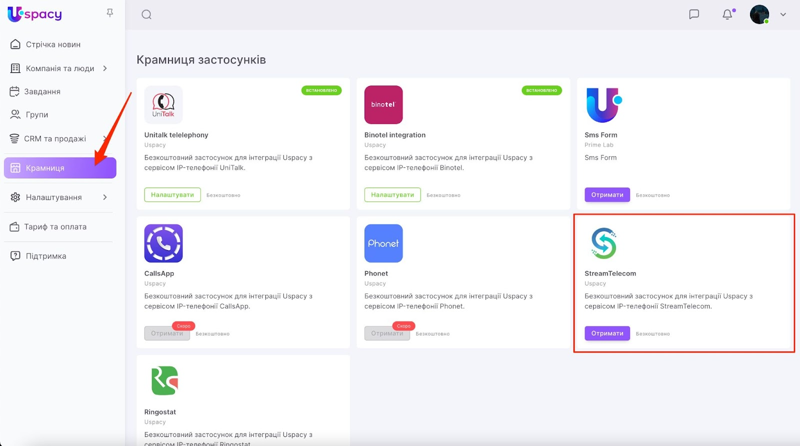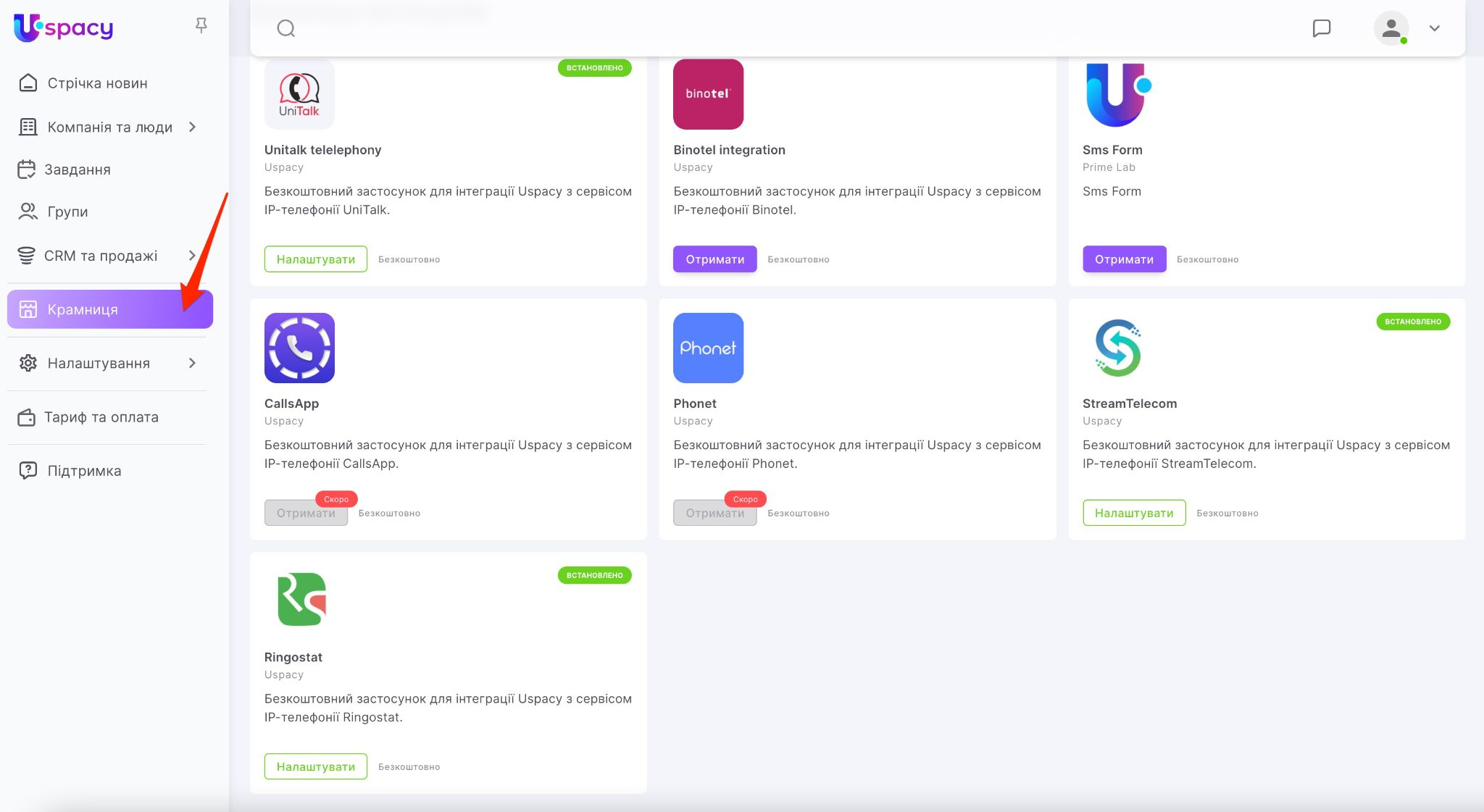 У Uspacy телефонія працює за рахунок інтеграцій зі спеціалізованими сервісами. У розділі Крамниця представлені безкоштовні застосунки, які після їх встановлення та налаштування дозволять без перешкод телефонувати клієнтам або приймати дзвінки від них.