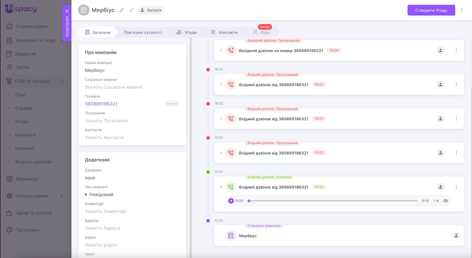 Після цього можна починати працювати з телефонією StreamTelecom прямо в Uspacy – телефонуйте та будьте на зв’язку зі своїми поточними та потенційними клієнтами.