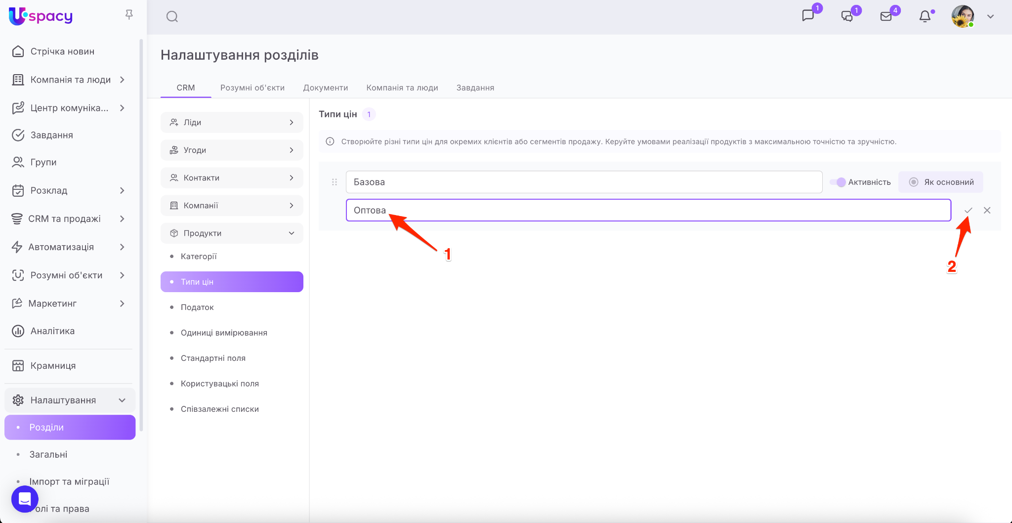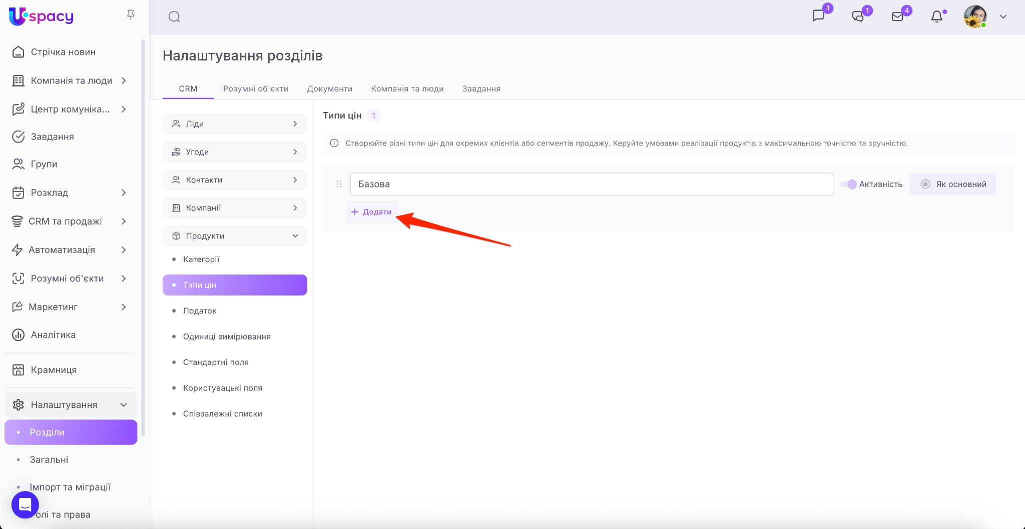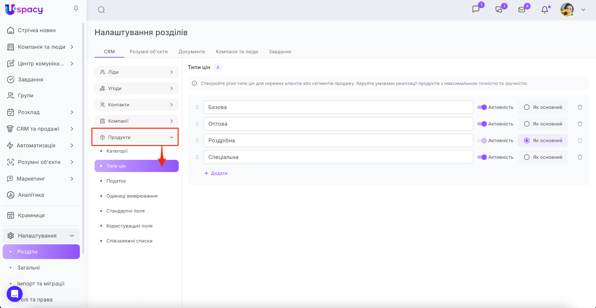 Для цього потрібно перейти в розділ Налаштування – Розділи – СRM, розгорнути блок Продукти та вибрати пункт Типи цін.