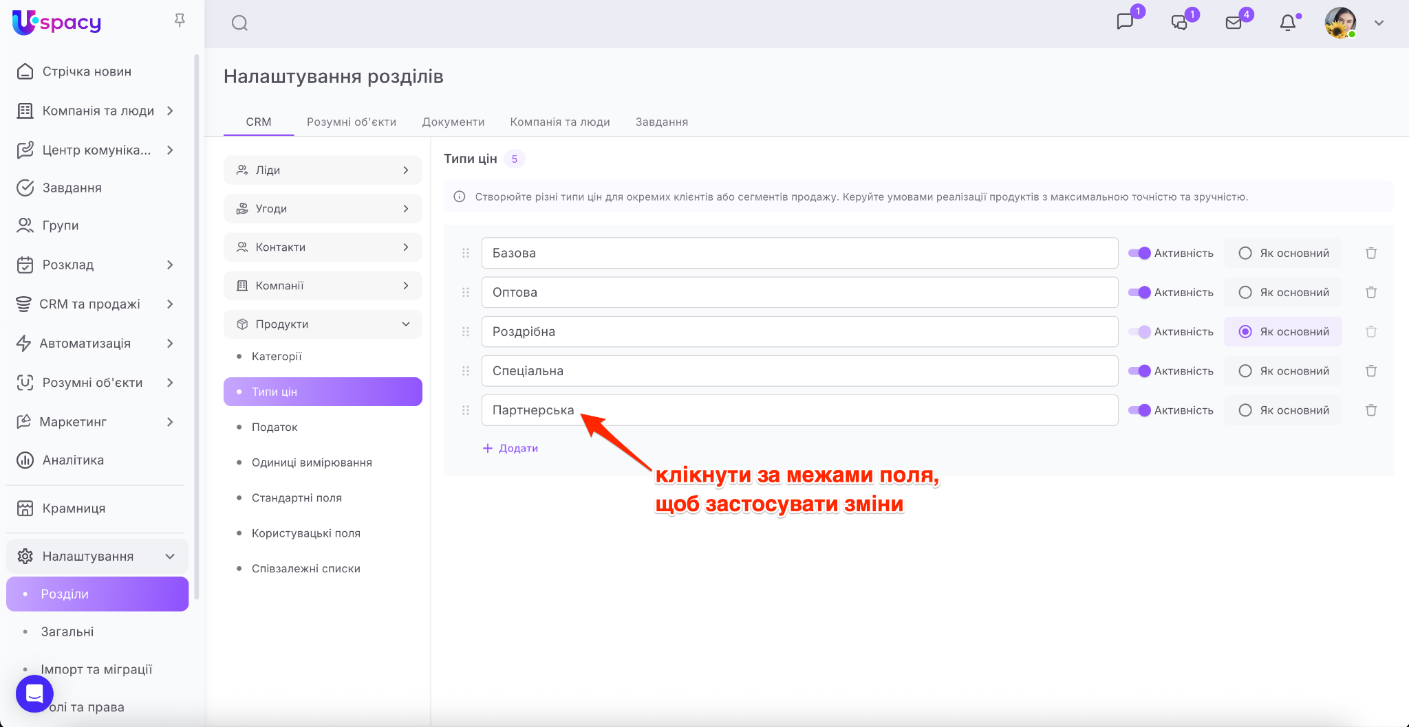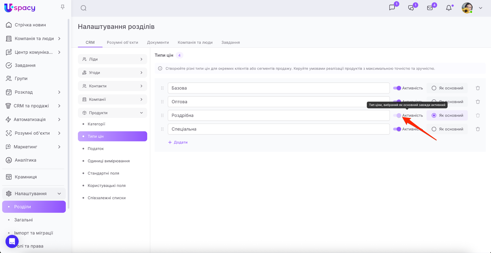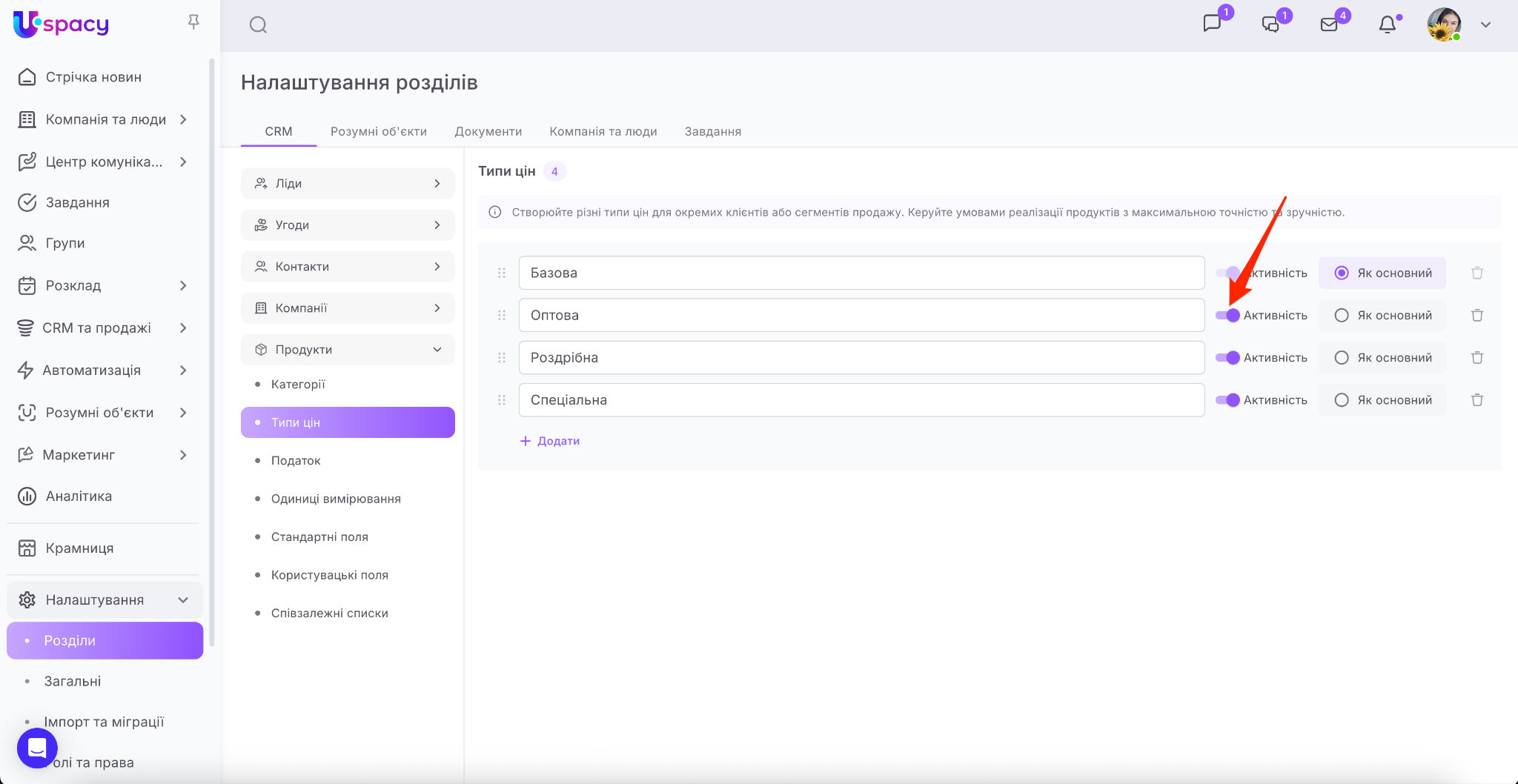 Для цього потрібно перейти в розділ Налаштування – Розділи – СRM, розгорнути блок Продукти та вибрати пункт Типи цін.