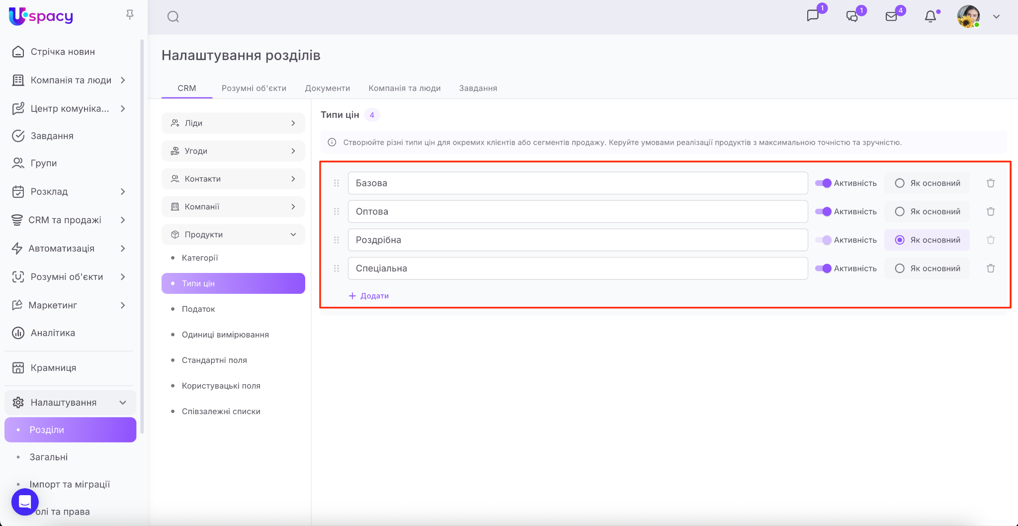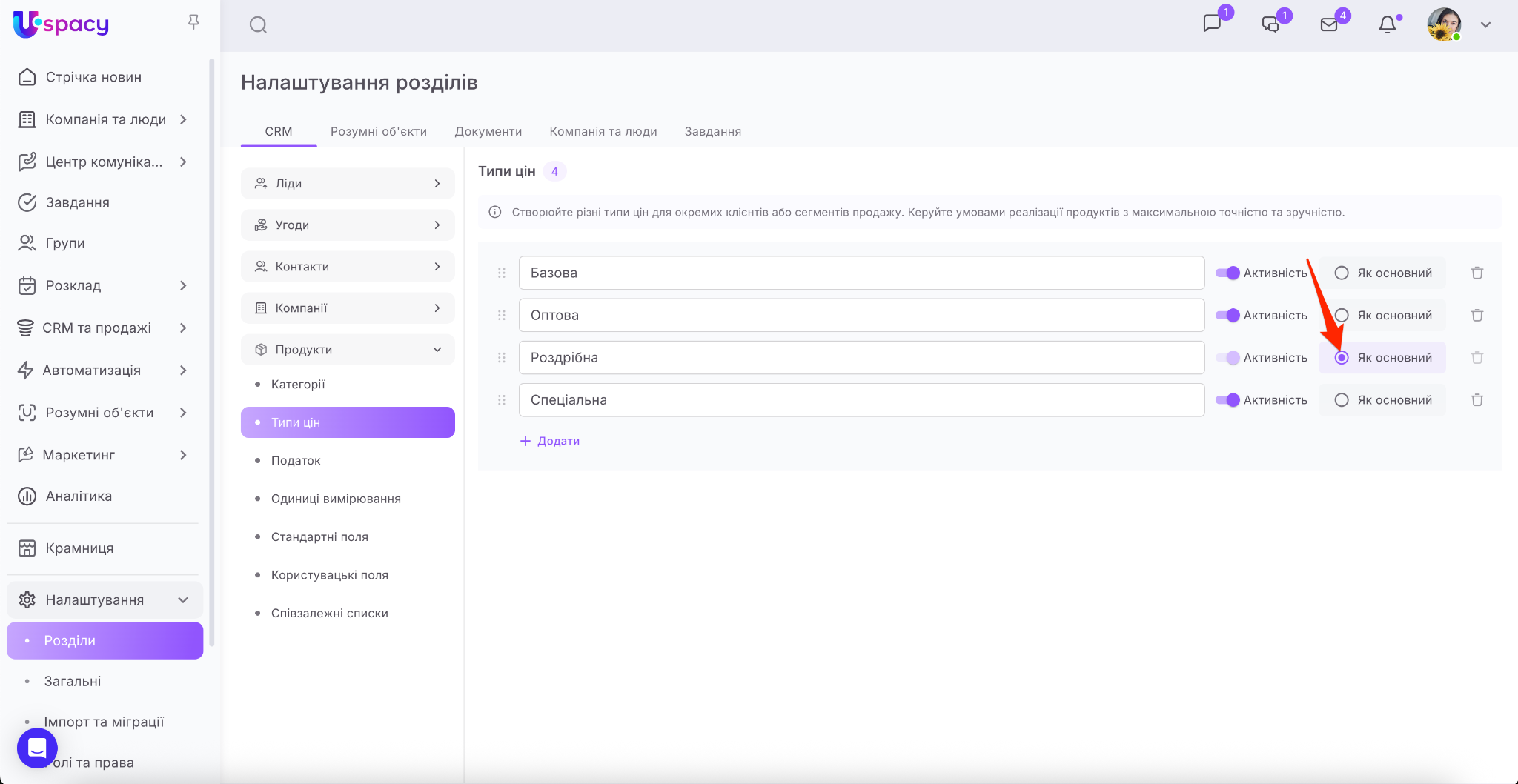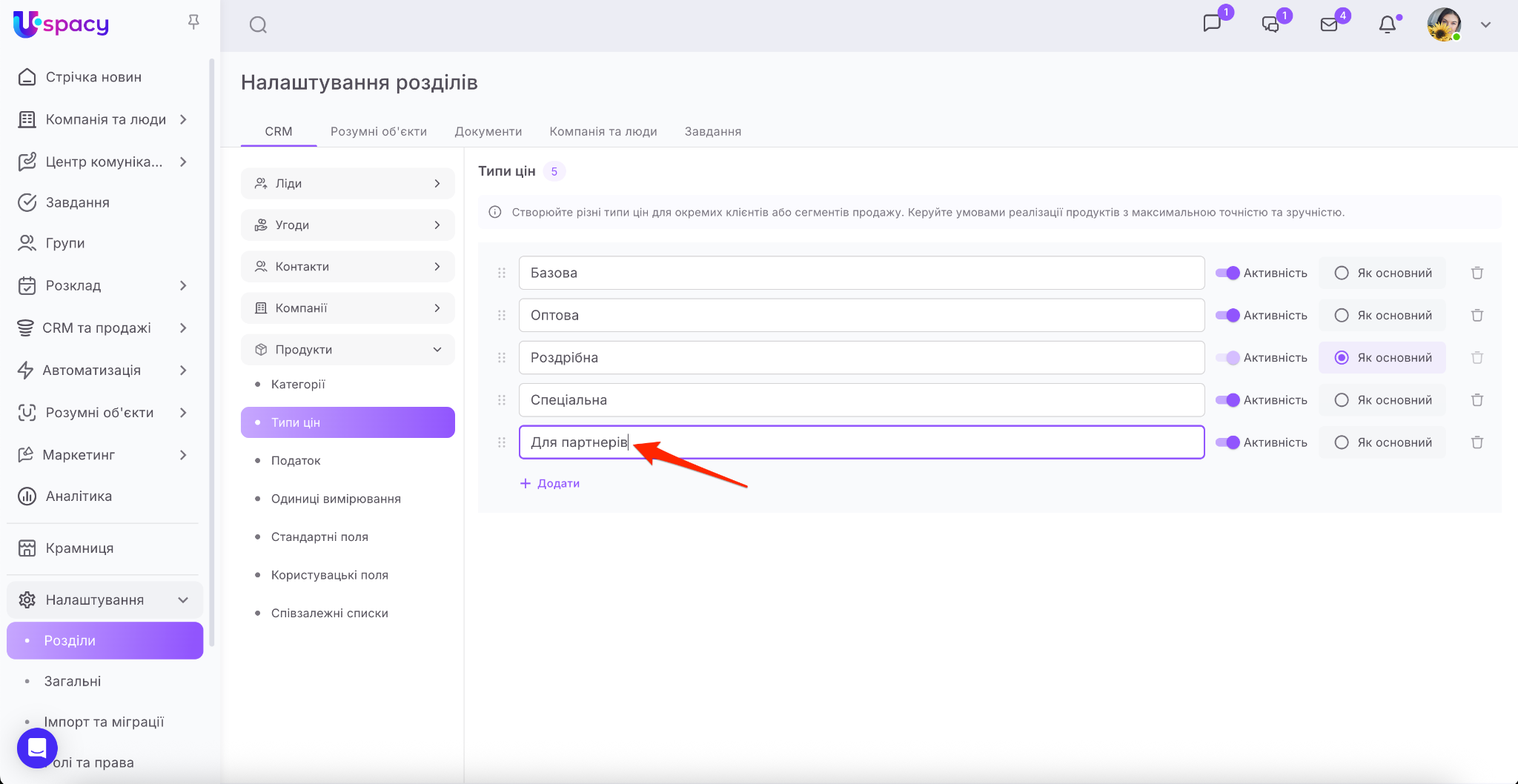 🌟 Додавати їх може тільки адміністратор або власник Простору. Для інших є можливість лише використовувати типи цін в роботі з продажами в CRM.