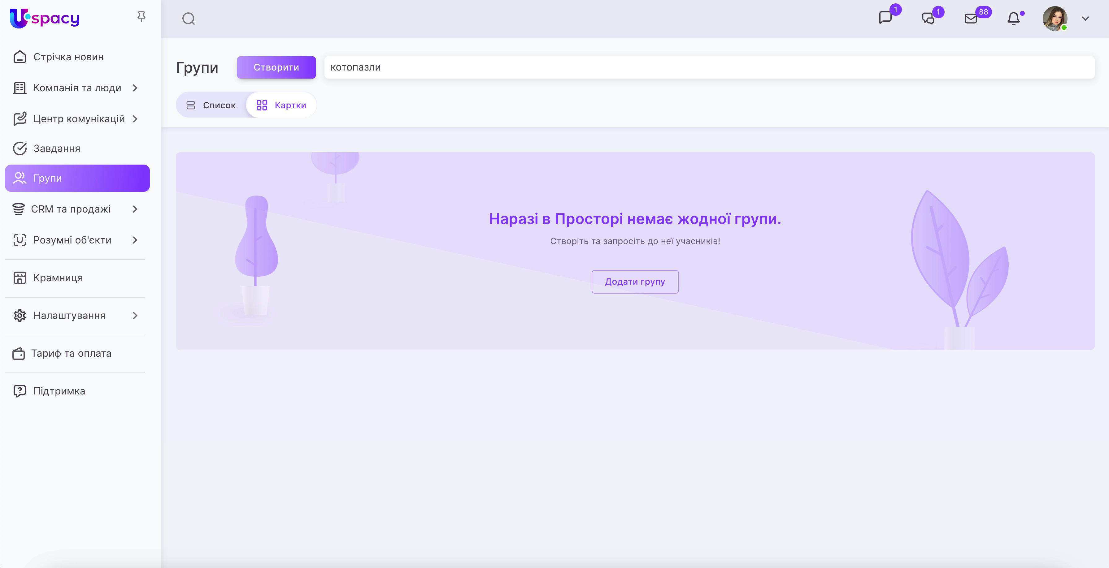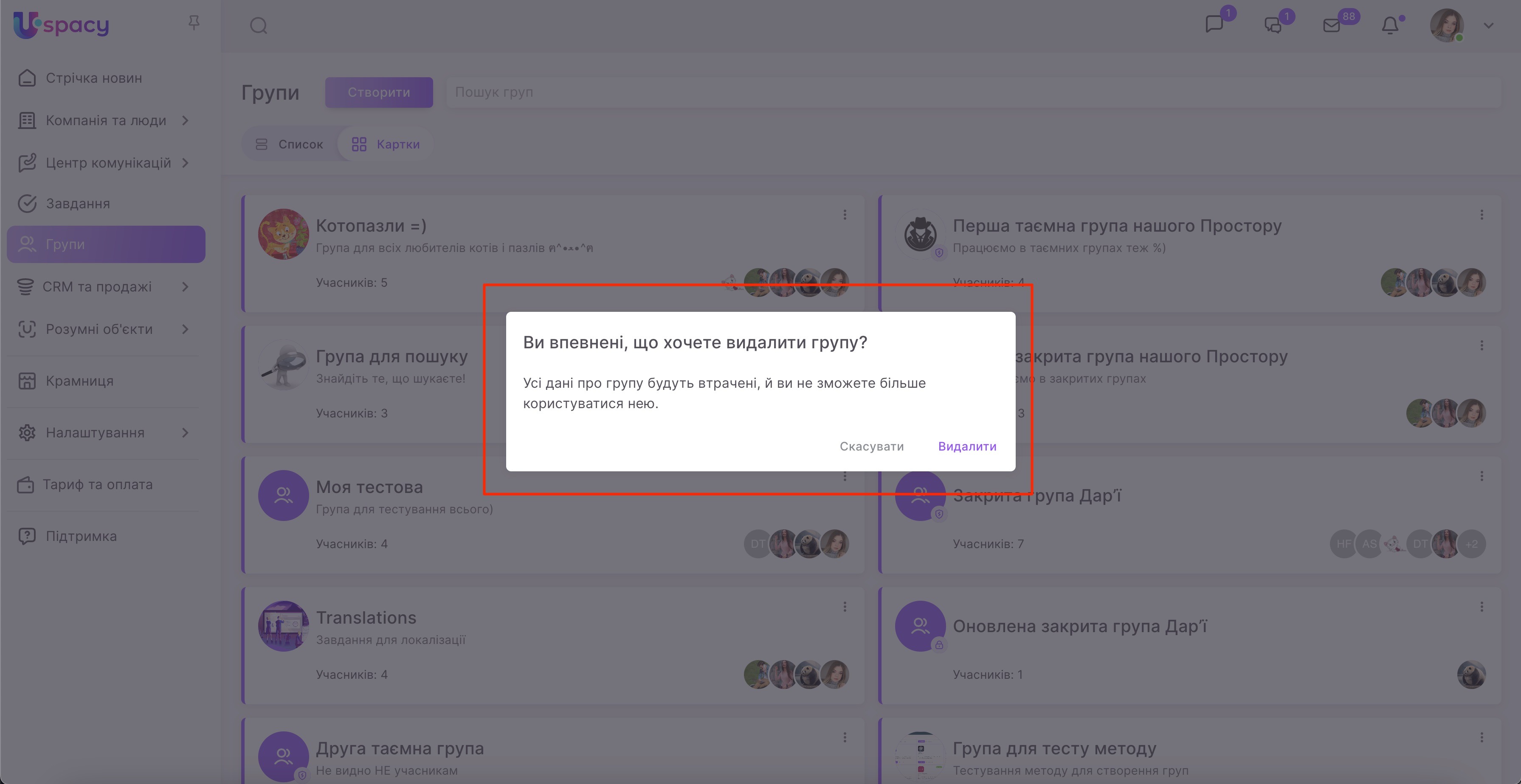 Щоб усунути групу з Простору, потрібно відкрити меню взаємодії з нею та натиснути на пункт Видалити групу.