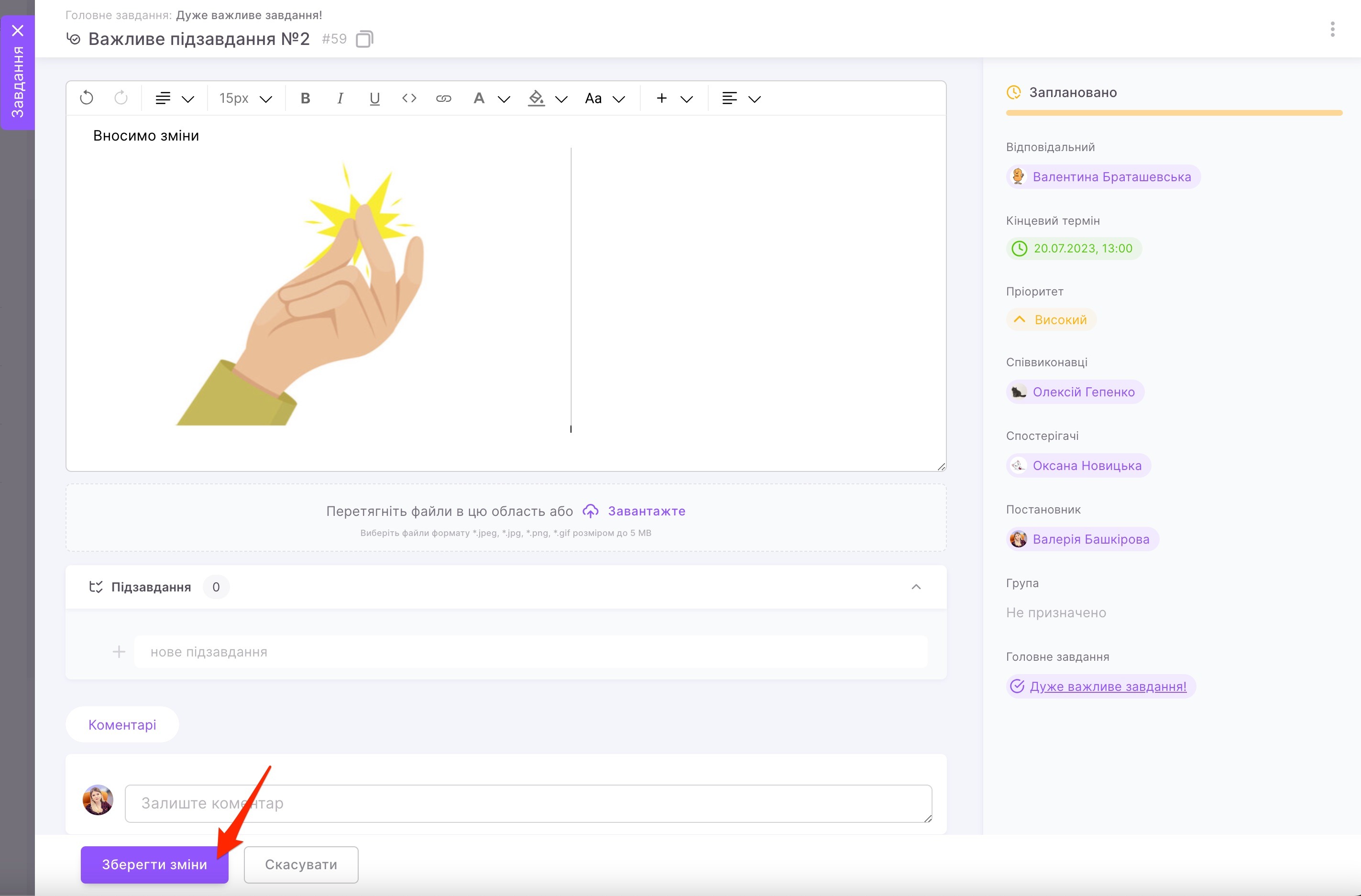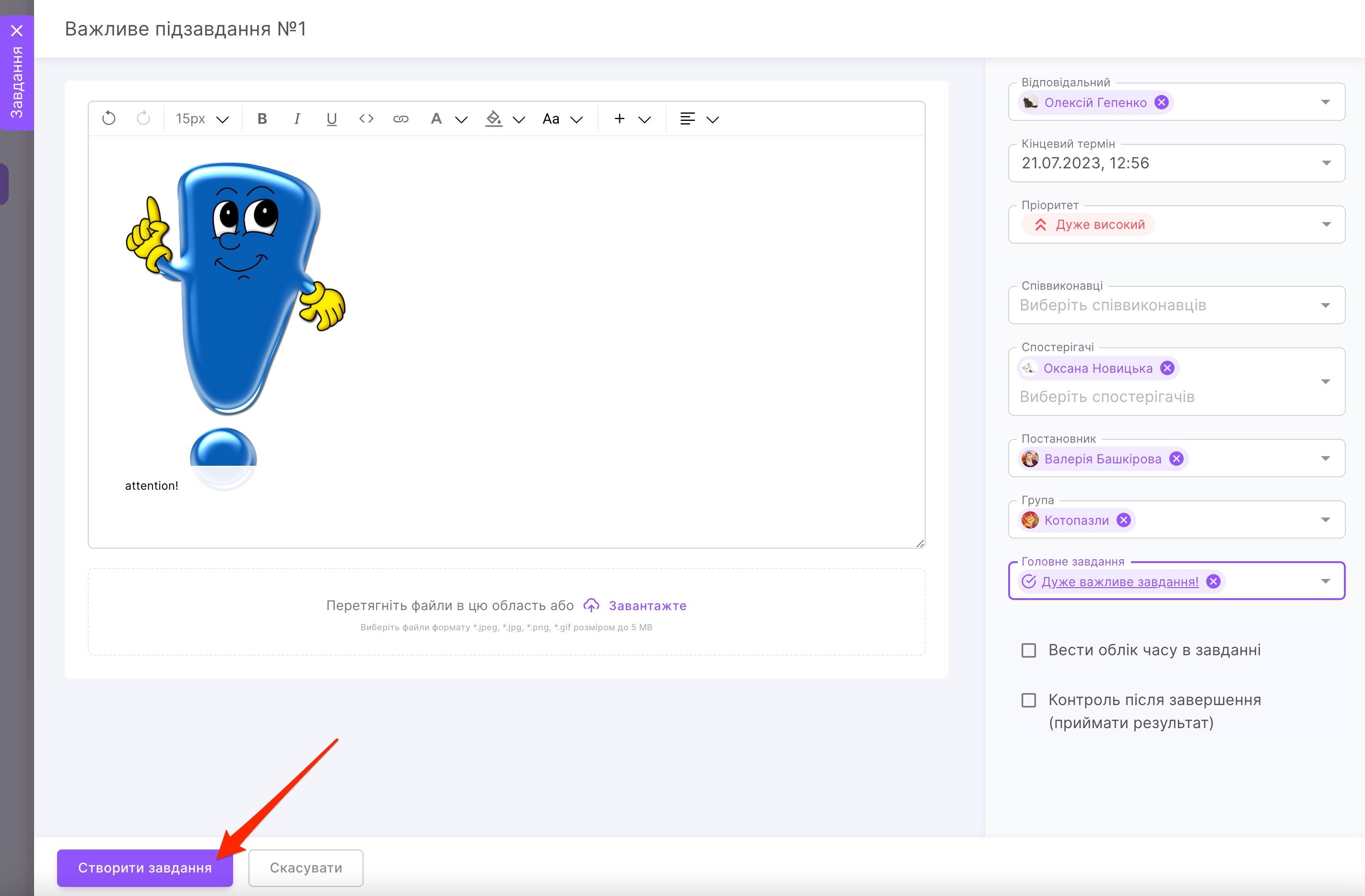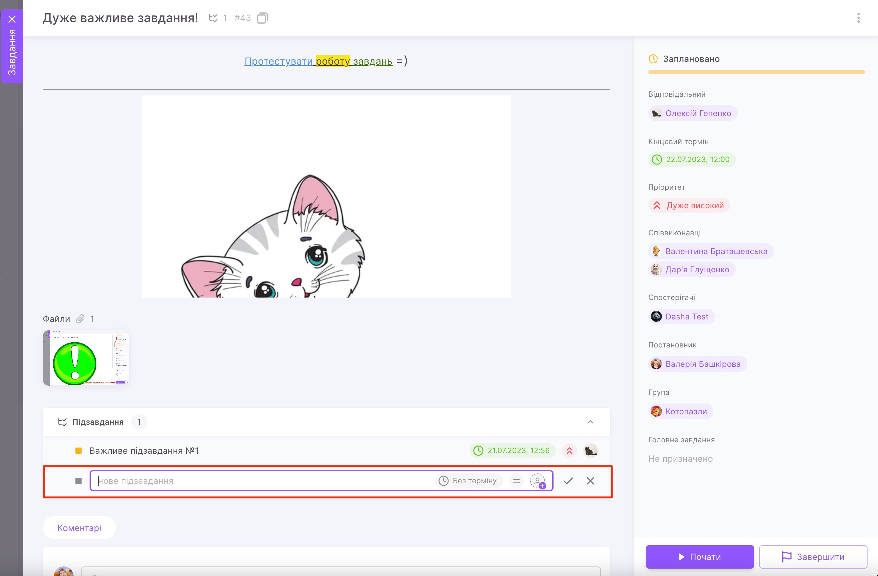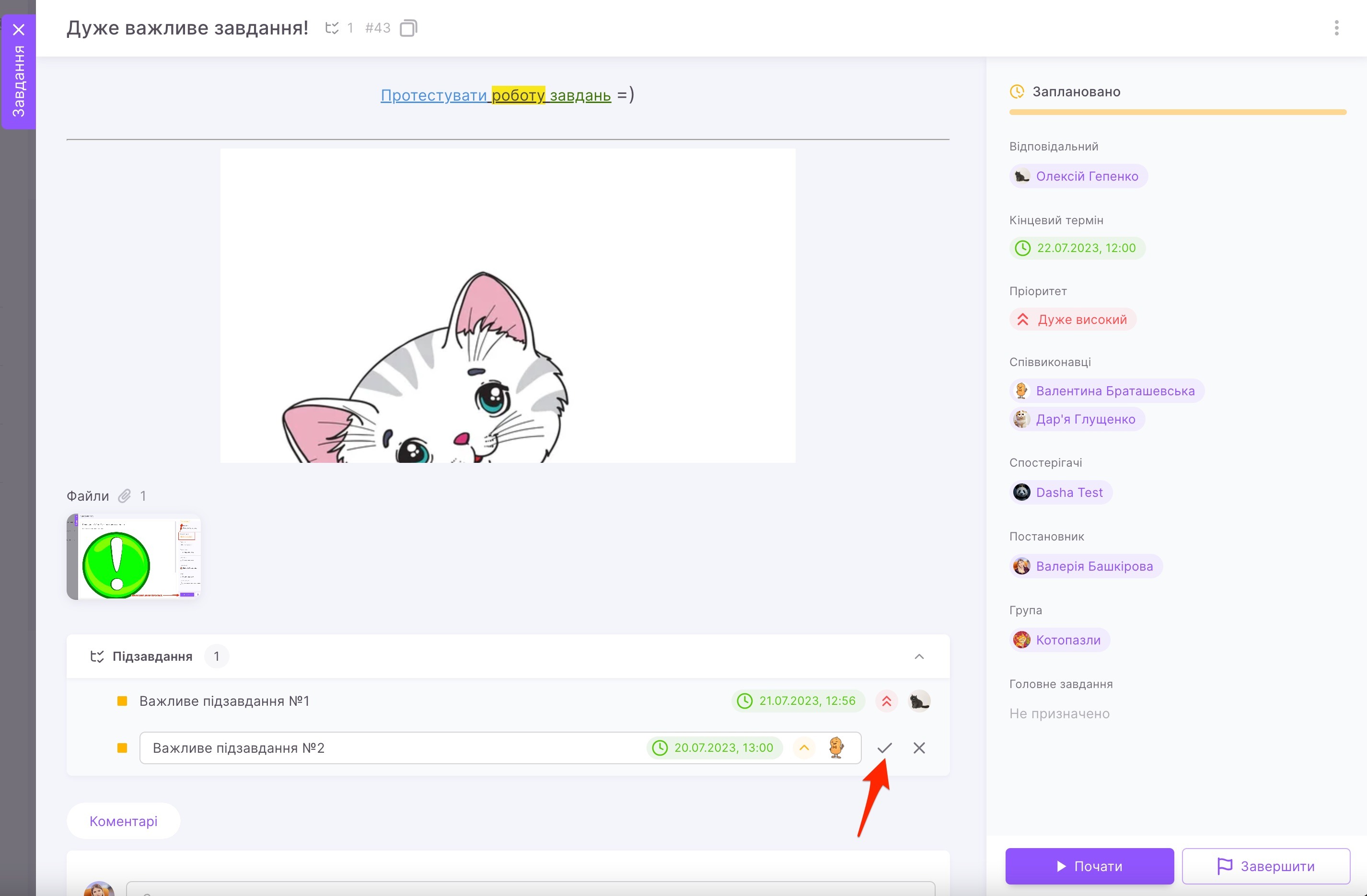 У кожному підзавданні є можливість, окрім назви, вказати термін, пріоритет та відповідального. Після заповнення цих даних, потрібно натиснути галочку для збереження та створення.