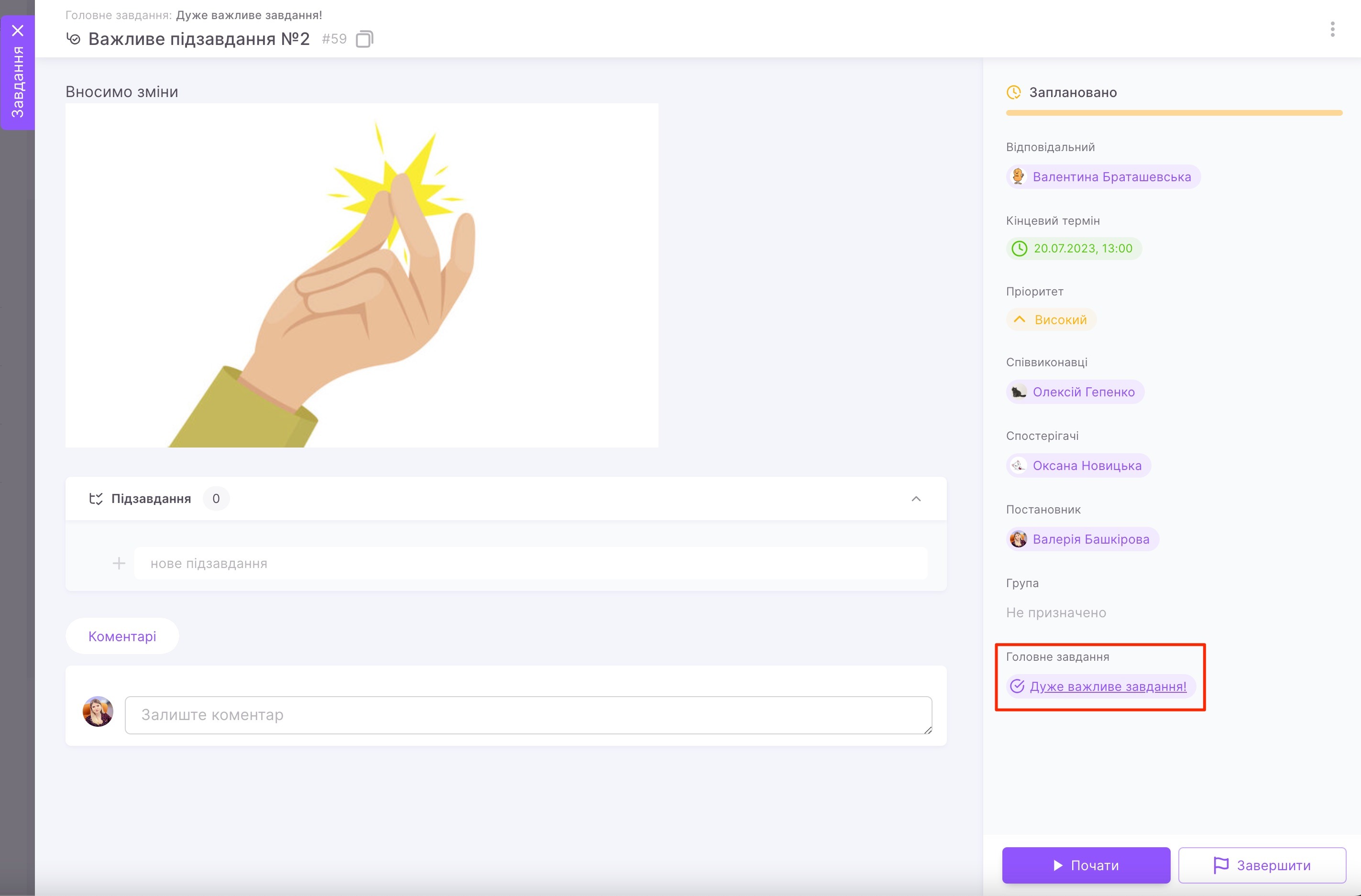 У результаті в картці перегляду у відповідному полі та біля назви ми бачимо потрібну нам прив’язку. Отже, так ми розуміємо, що створили саме підзавдання.