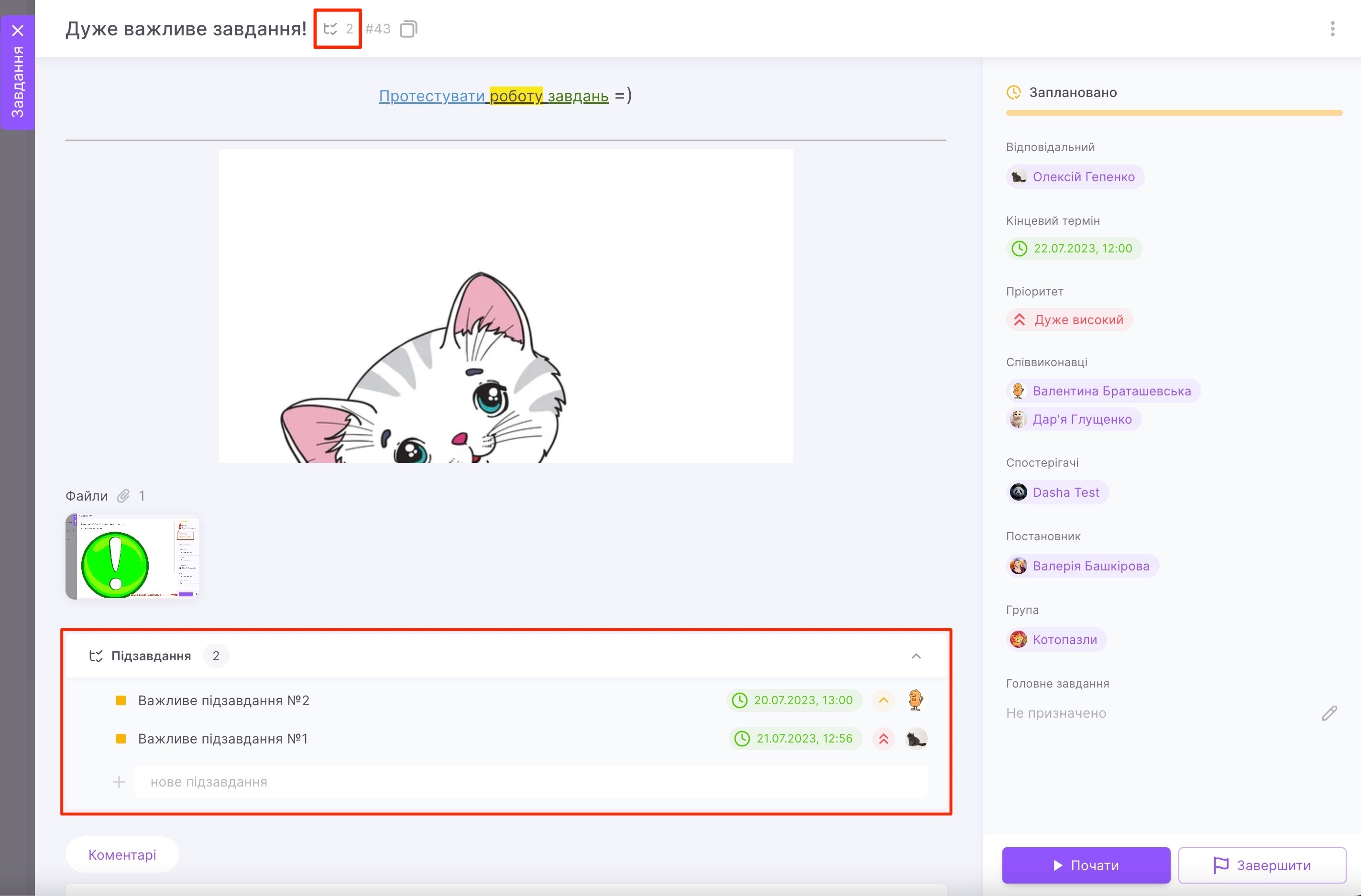Оскільки підзавдання у головному завданні групуються як пункти списку, то можна одразу побачити їх кількість та оцінити загальний масштаб робіт, які плануються до виконання. А також зрозуміти хто із співробітників за що відповідальний та до кого звертатися у разі потреби.