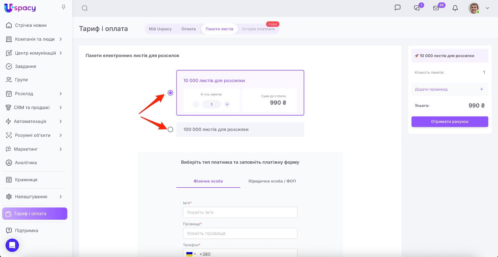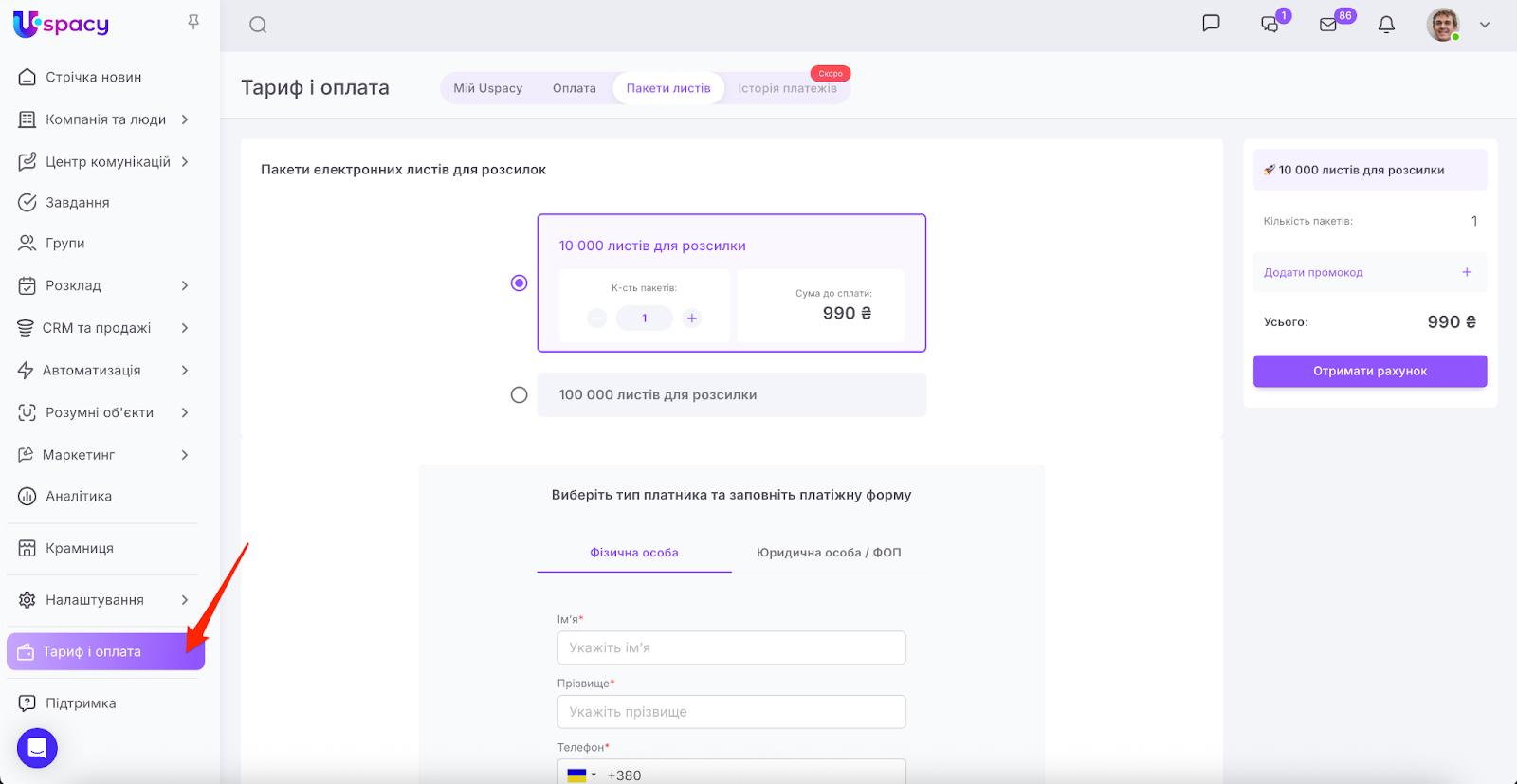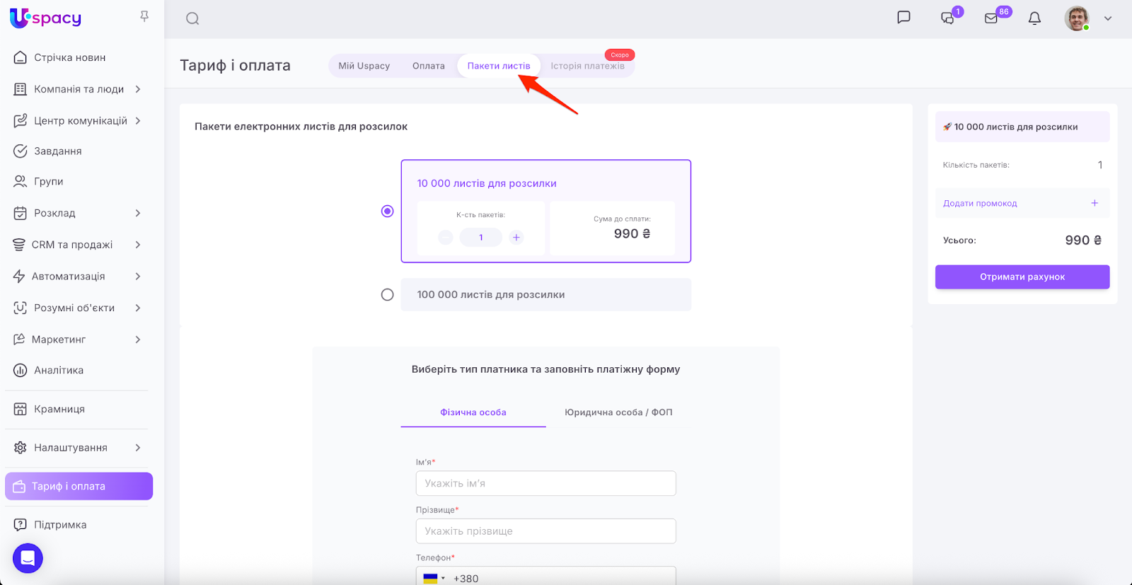 У Uspacy розсилки працюють на основі пакетів листів. Перший пакет на 1 000 листів ви отримуєте безкоштовно, а поточний залишок завжди відображається в інтерфейсі – це допомагає планувати відправлення.