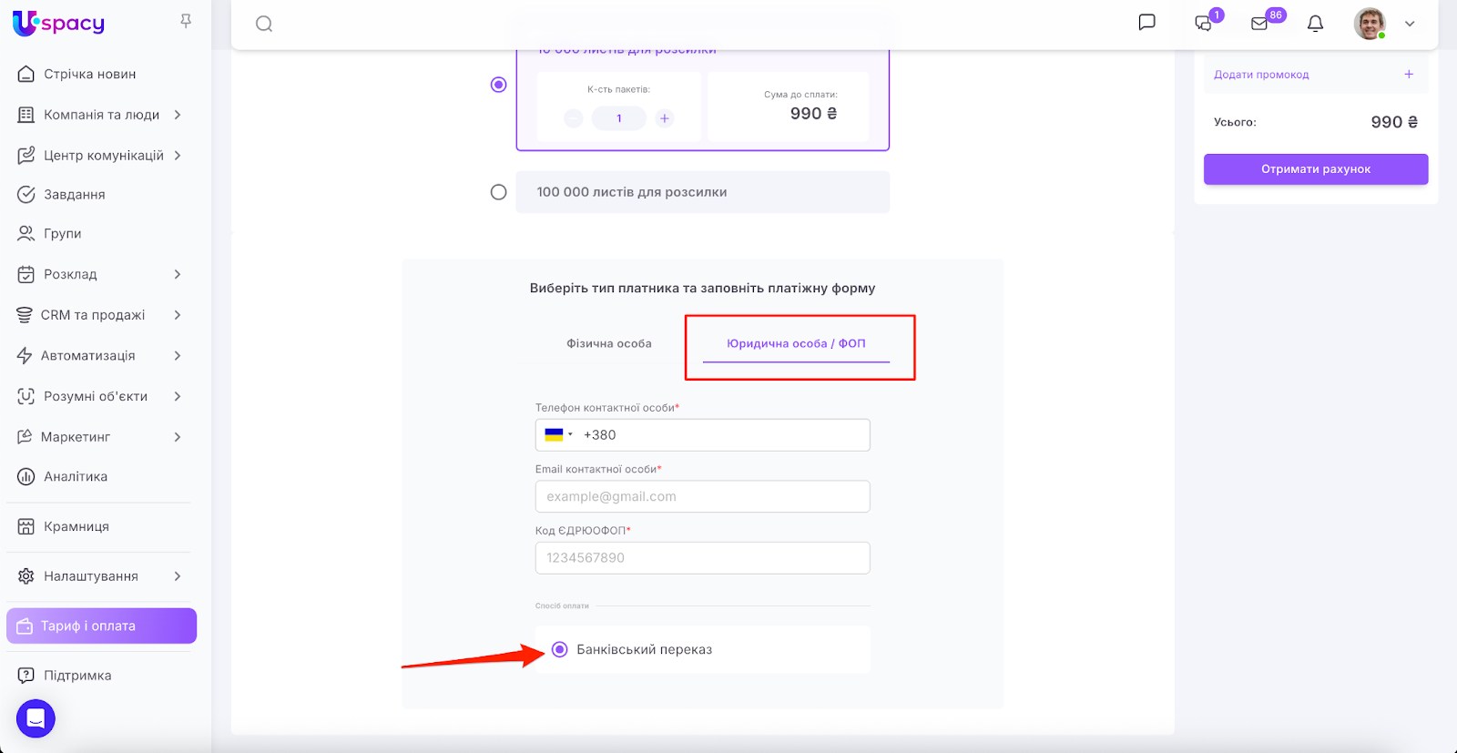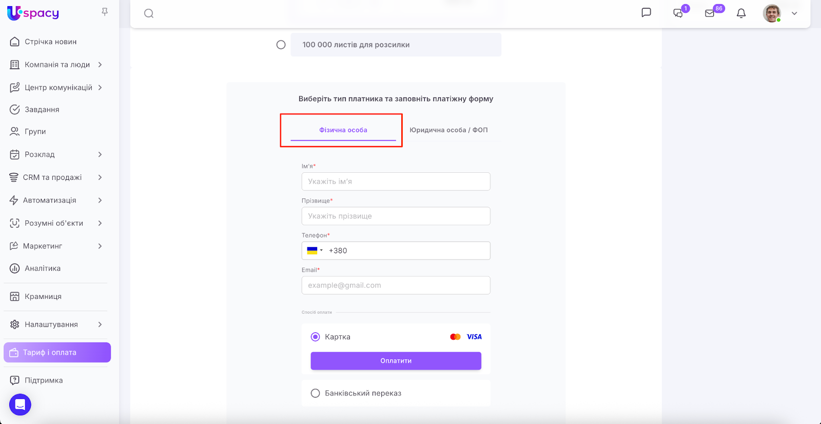 Далі потрібно вказати дані платника. Придбати пакет може як фізична особа (з використанням оплати карткою чи через банківський переказ).