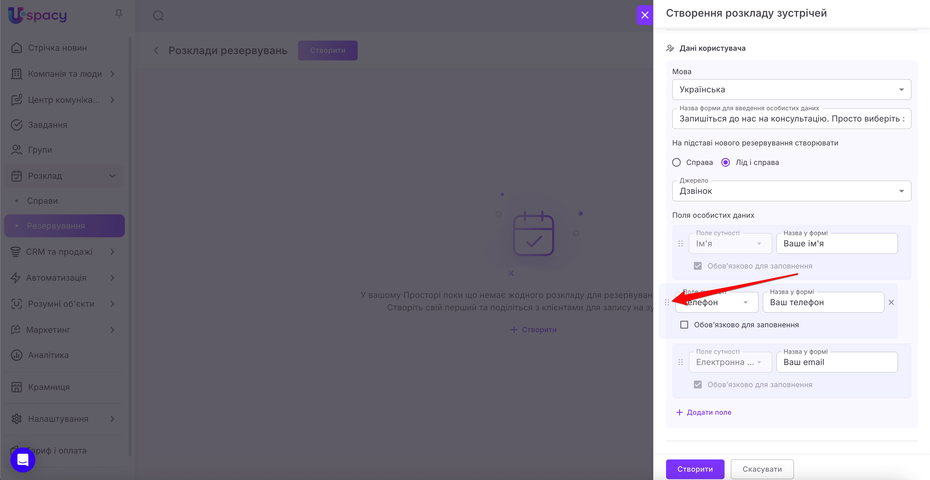 🟣 Тип події – характеристика, яка дозволяє вказати як зберігати в Просторі зарезервовані клієнтом зустрічі. Тобто який тип їм присвоювати: Справа, Дзвінок, Зустріч, Чат чи Лист.