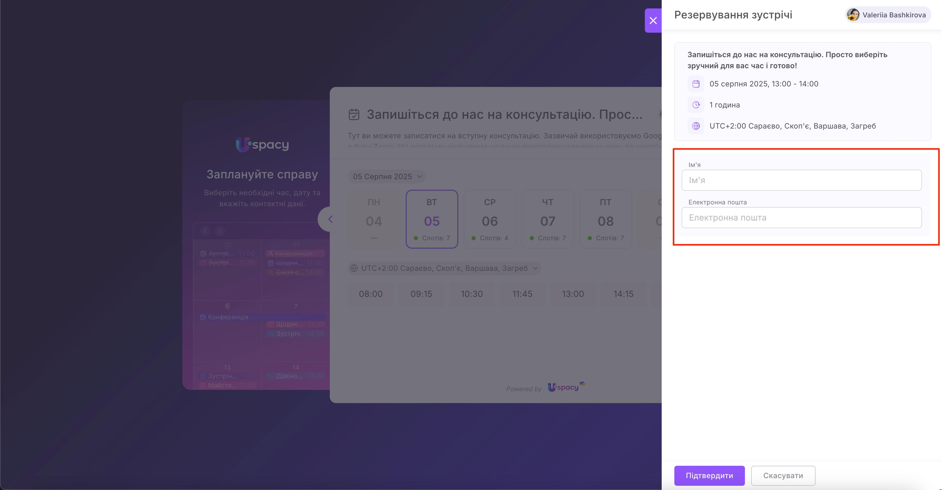 🟣 Назва форми для введення особистих даних – це заголовок, який міститься у вікні, яке відкривається після того як клієнт вибрав потрібний йому слот і переходить до заповнення необхідної інформації про себе.