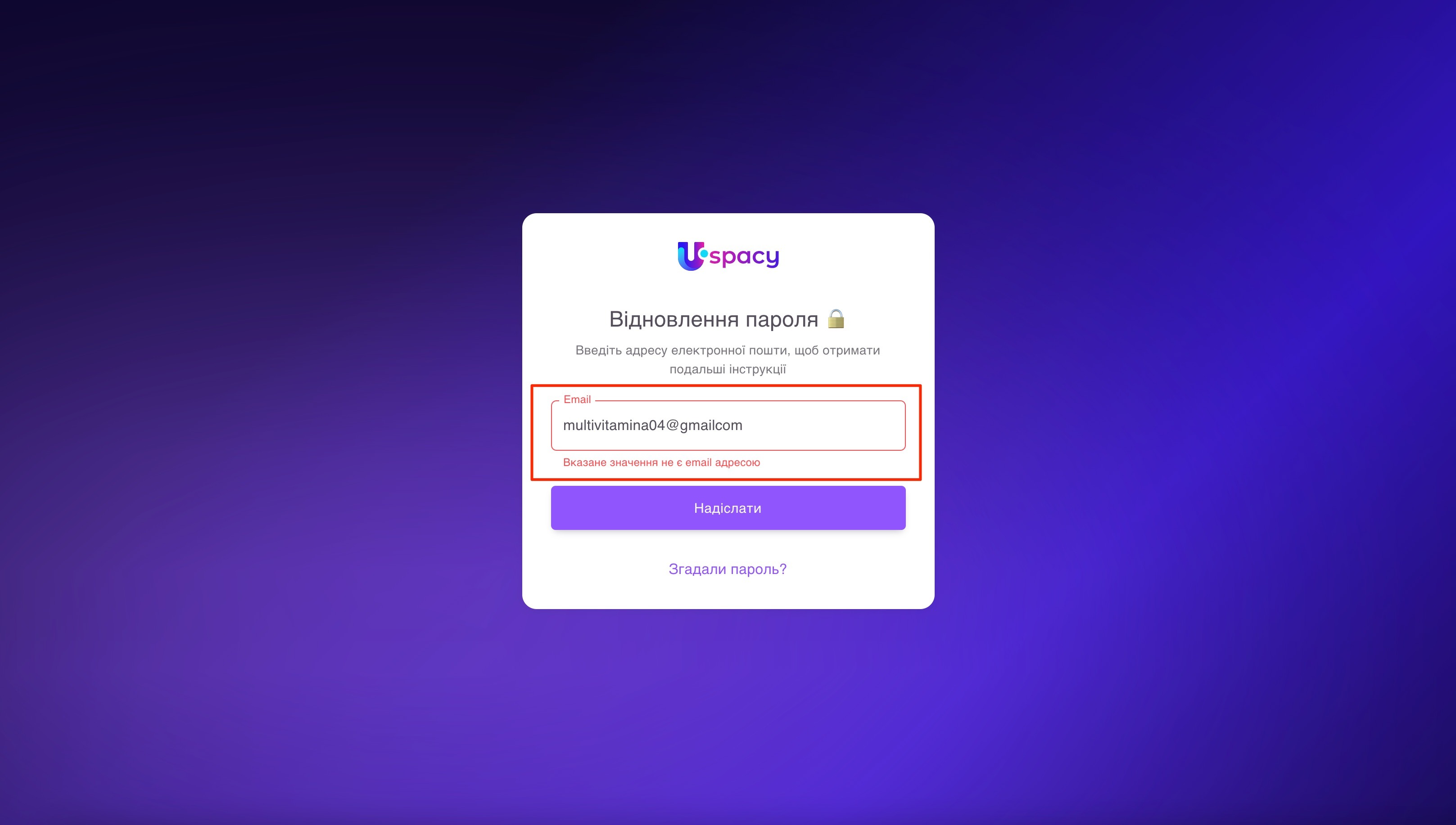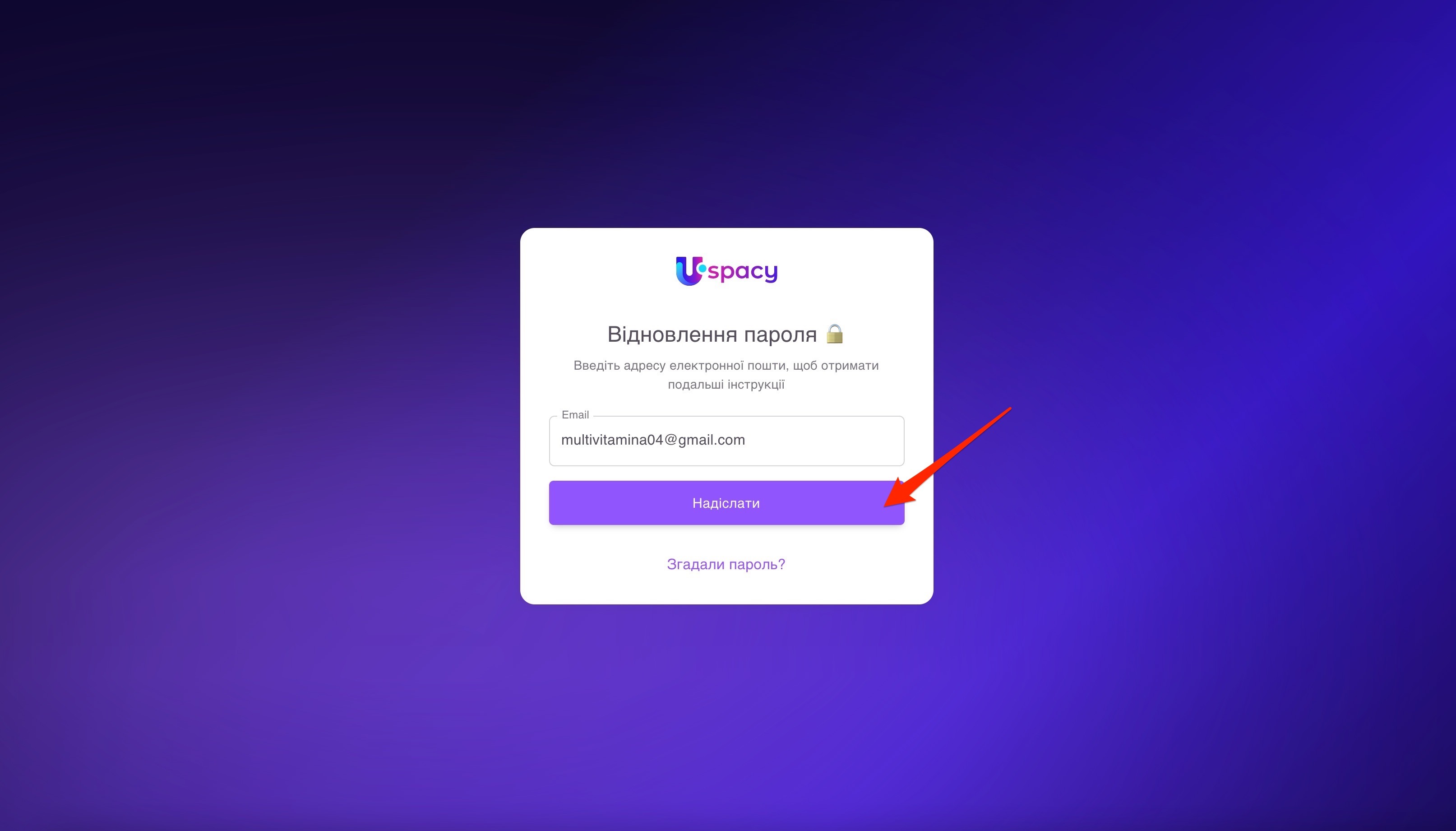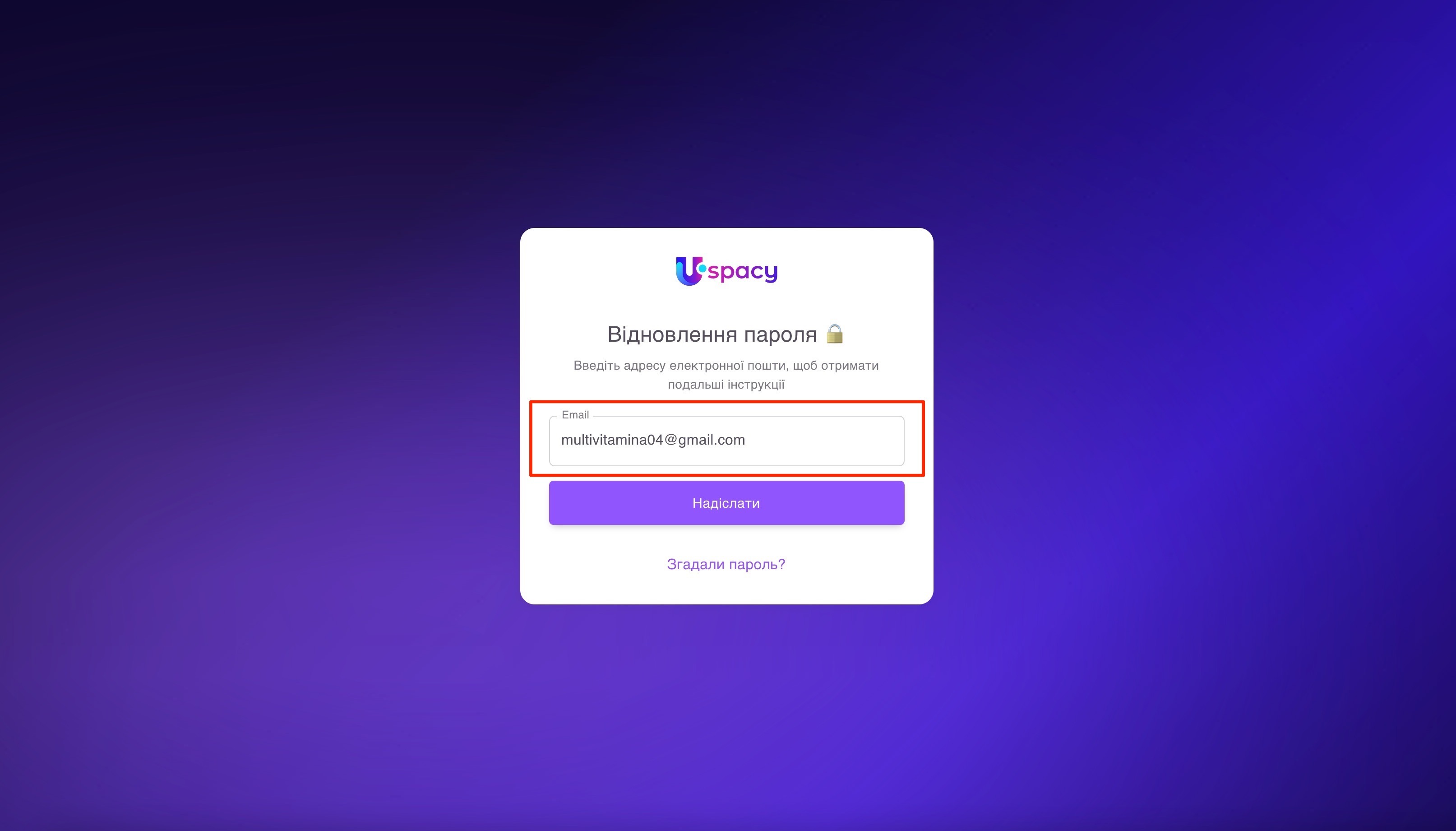 Відкриється форма для запиту на відновлення пароля. Потрібно буде ввести email, який логіном і використовується для входу в цей Простір.