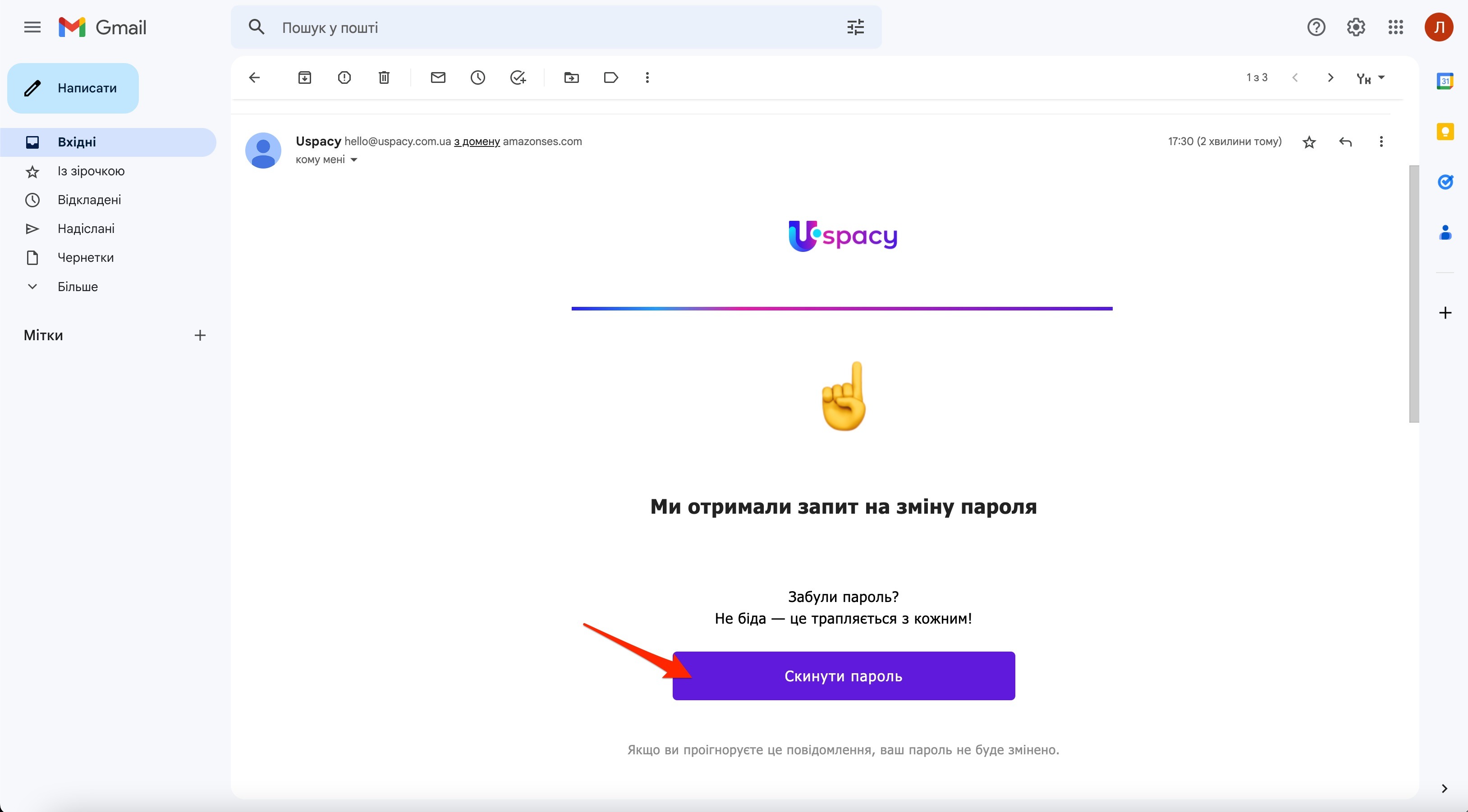 Після переходу до поштової скриньки та відкриття листа, потрібно натиснути на кнопку Скинути пароль.