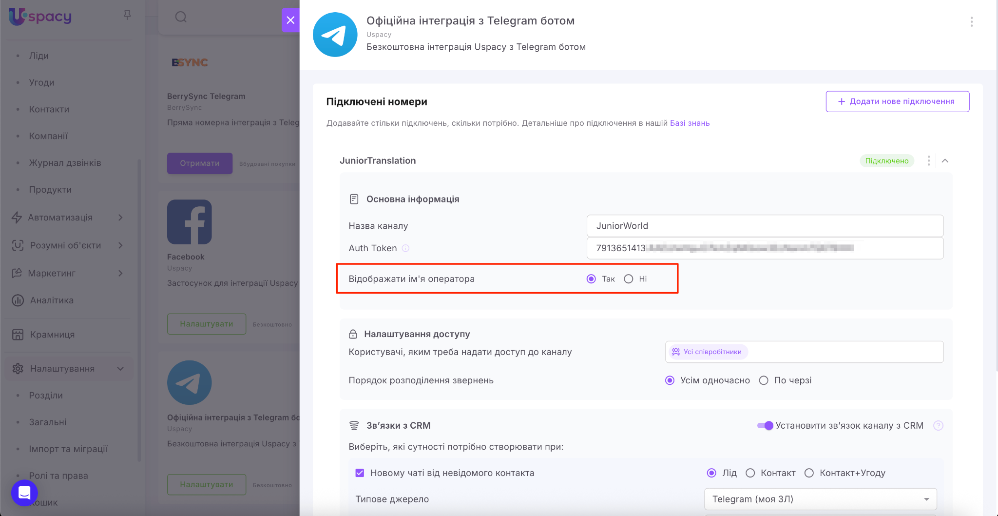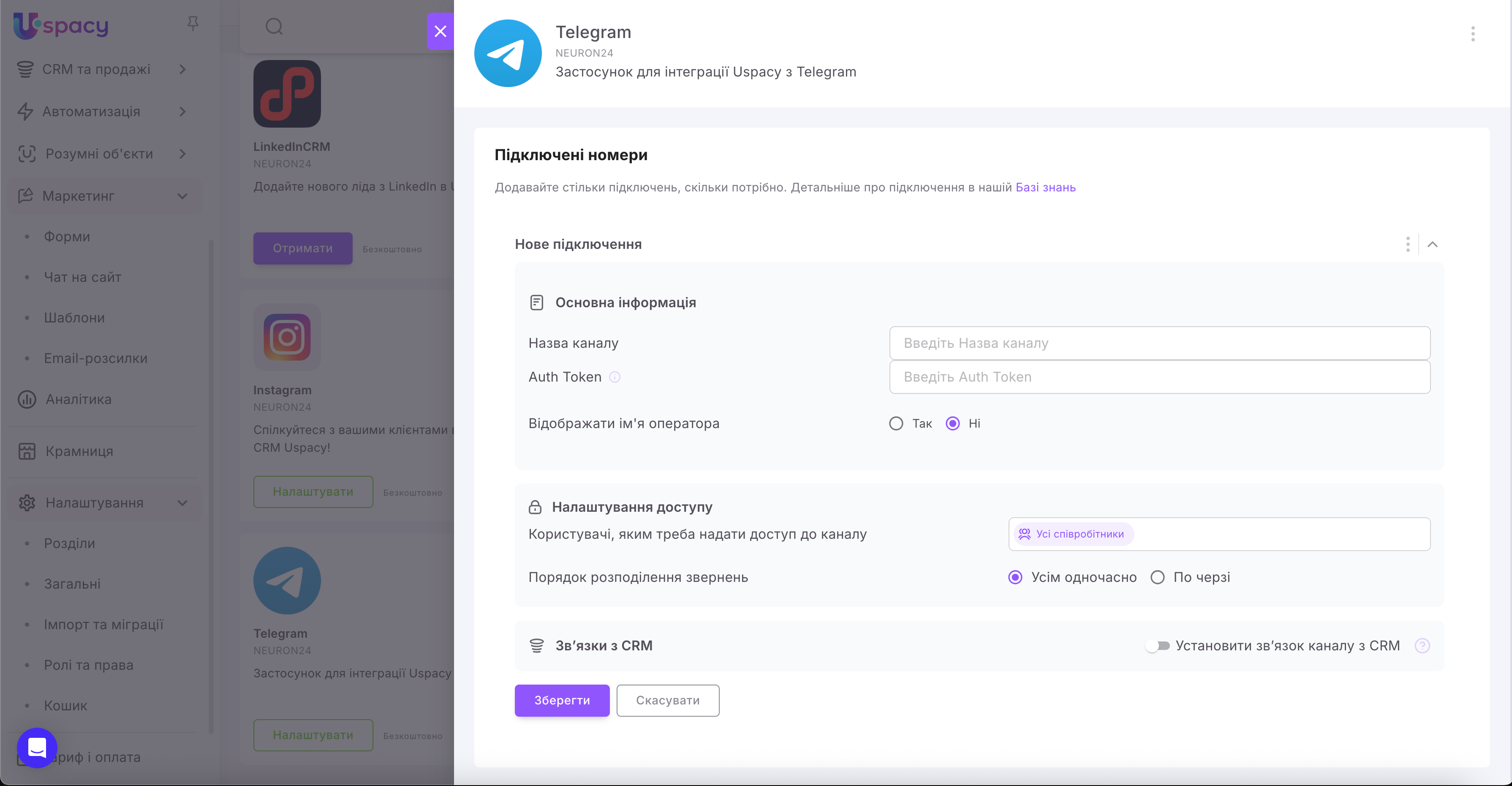 💡Додатковими параметрами під час підключення є Налаштування доступу та Зв’язки з CRM.