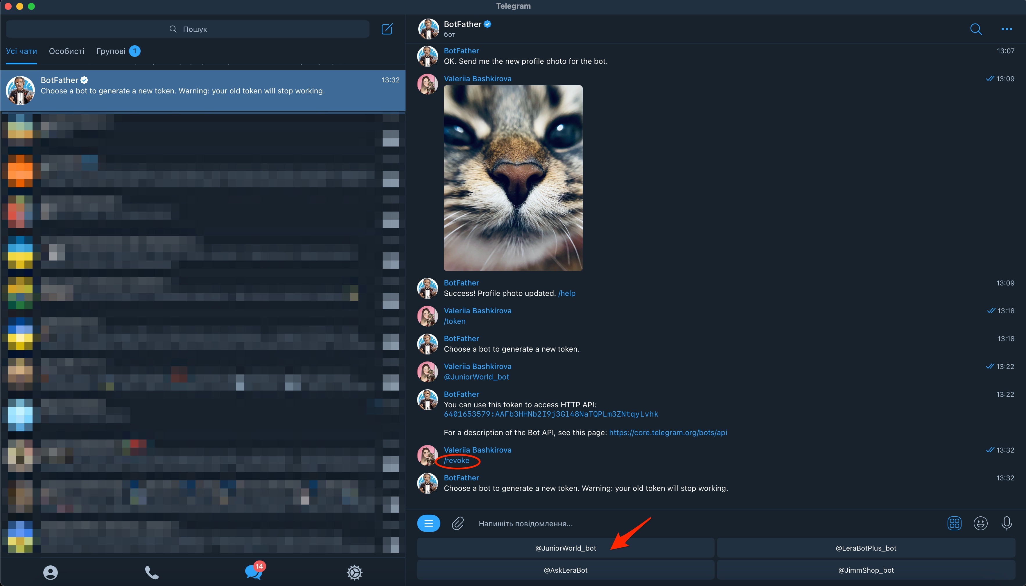 Для скидання використайте команду /revoke і надішліть у чат. Потім виберіть бот, для якого потрібно замінити токен.