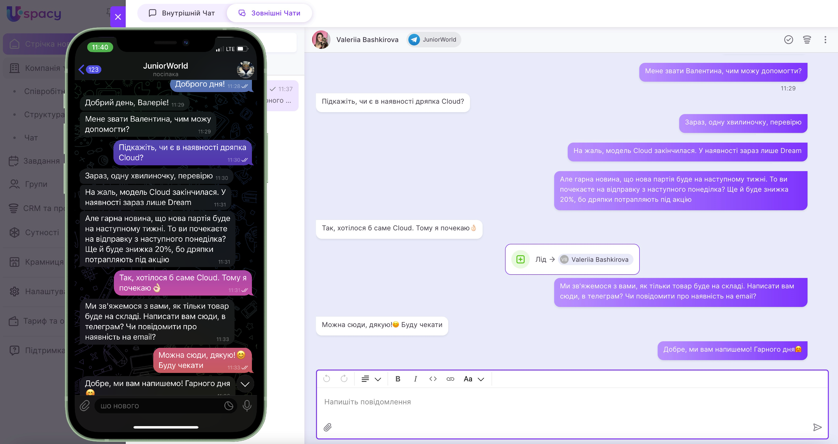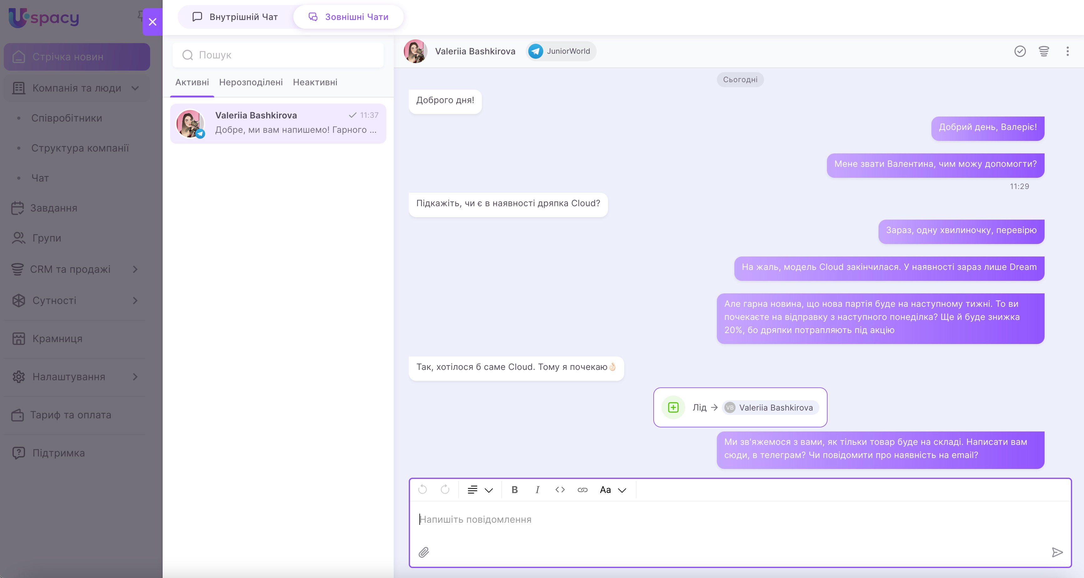 За допомогою функціоналу Зовнішніх Ліній можна спілкуватися з клієнтами прямо у своєму Uspacy в той час, коли вони пишуть вам у сторонніх месенджерах, наприклад, у Telegram.