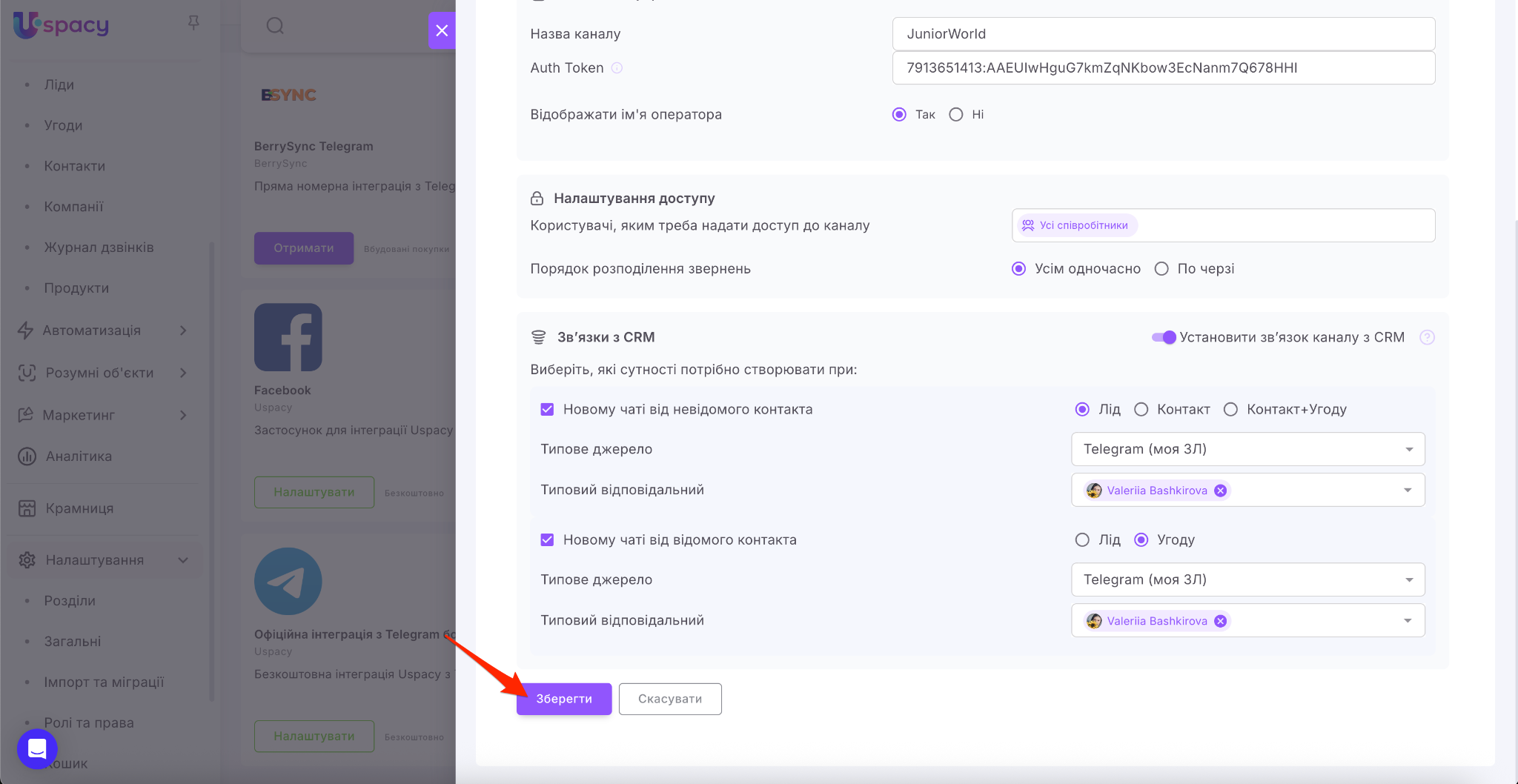 Так само, якщо не маєте потреби пов’язувати отримані чати з елементами CRM, то просто залиште неактивним блок Зв’язки з CRM.