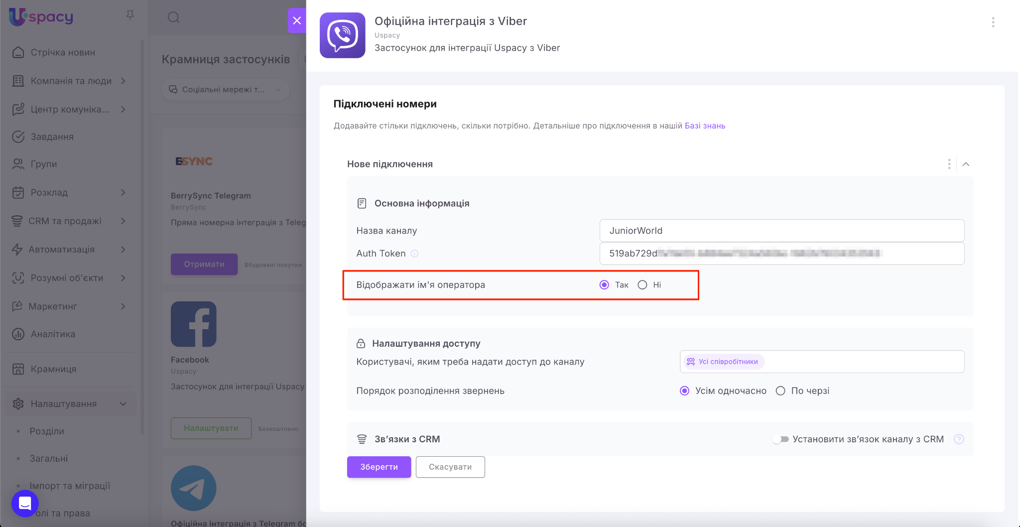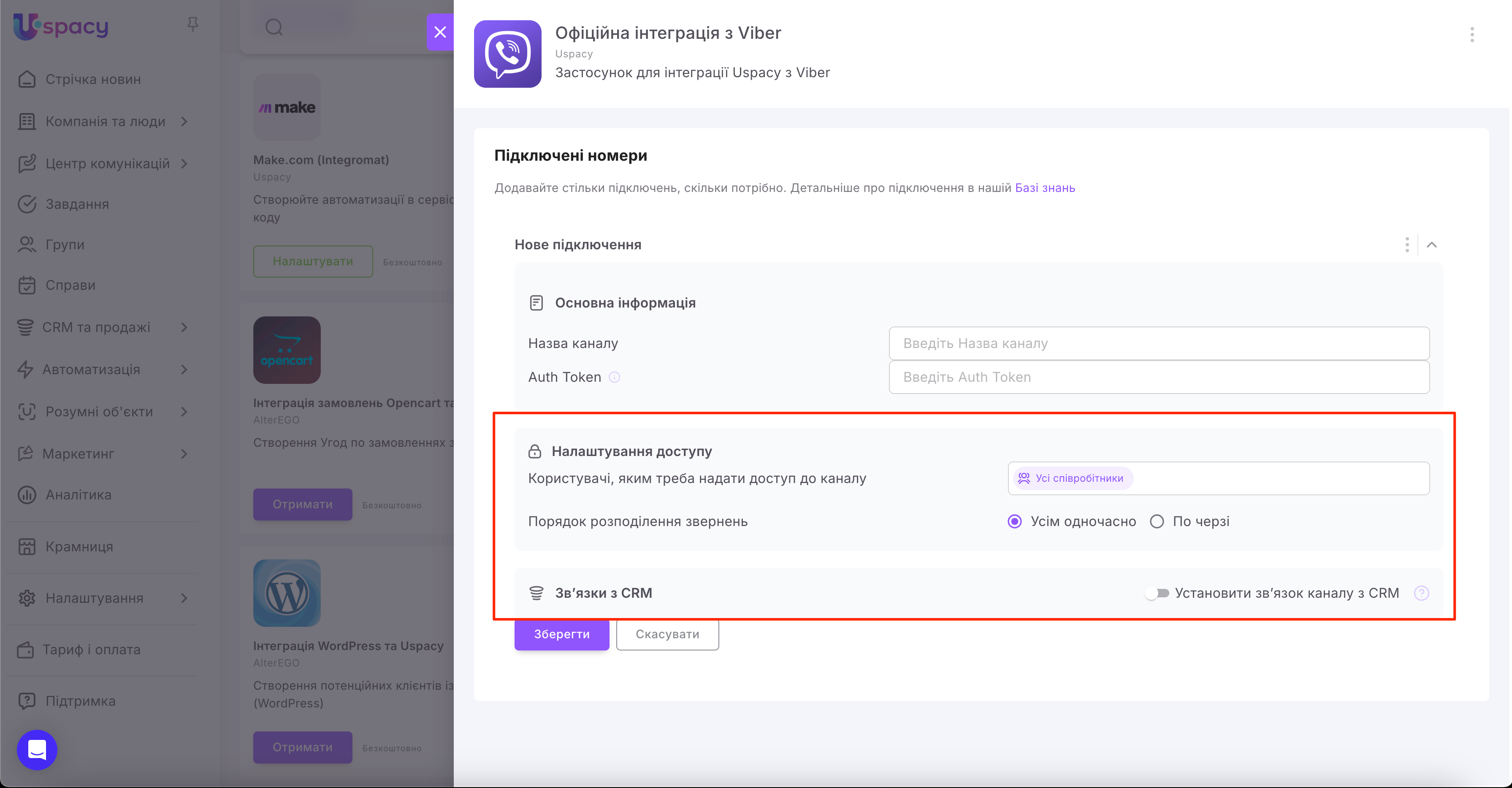 💡Додатковими параметрами під час підключення є Налаштування доступу та Зв’язки з CRM.