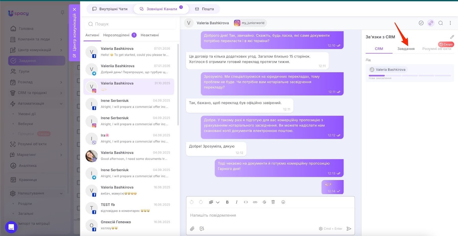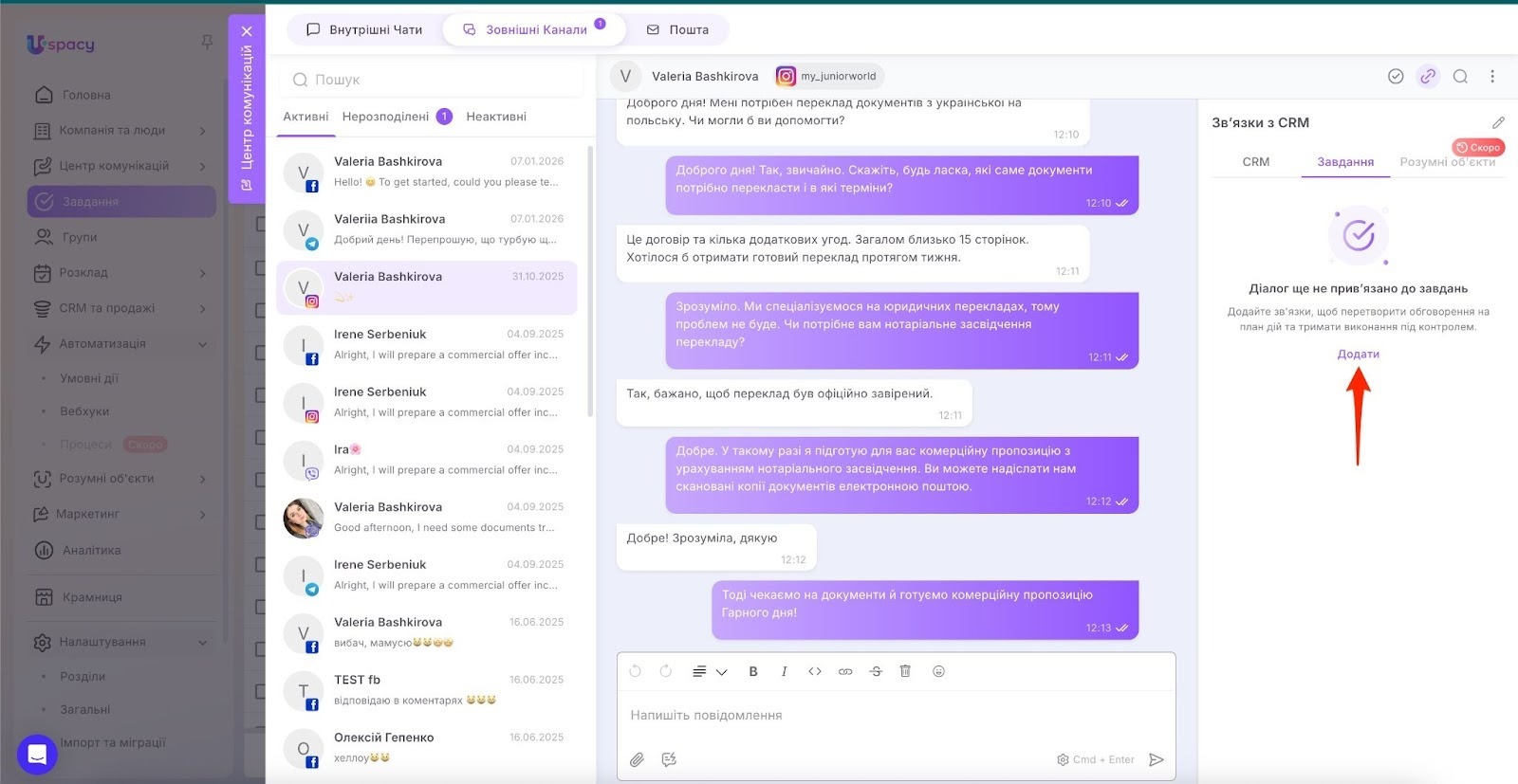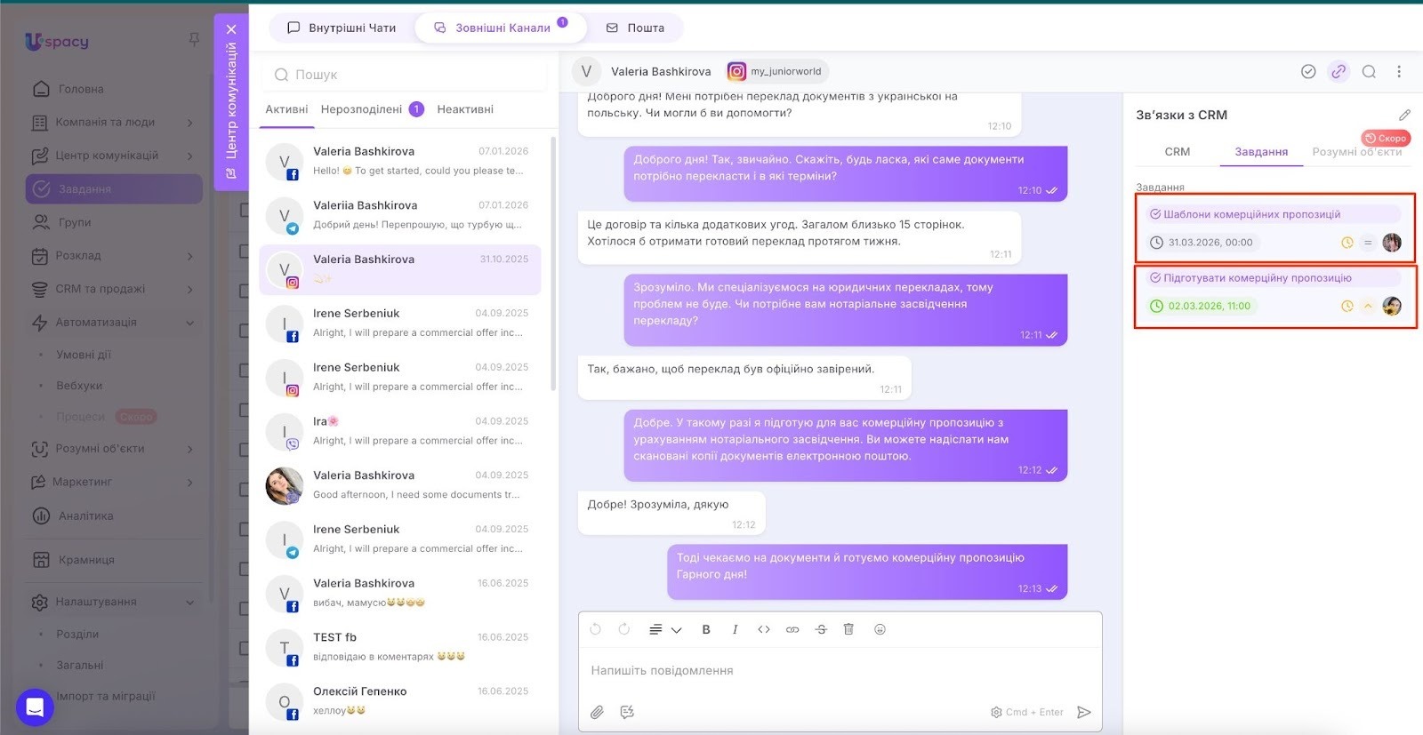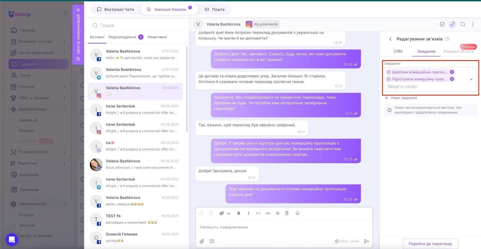 Коли клієнти пишуть у месенджери, важливо не просто швидко відповісти, а й зафіксувати домовленості: передзвонити, підготувати пропозицію, уточнити деталі, передати запит колезі. Саме тому в Uspacy зручно працювати з чатами Зовнішніх ліній (каналів) у Центрі комунікацій – ви ведете діалог у Просторі, не перемикаючись між різними сервісами.