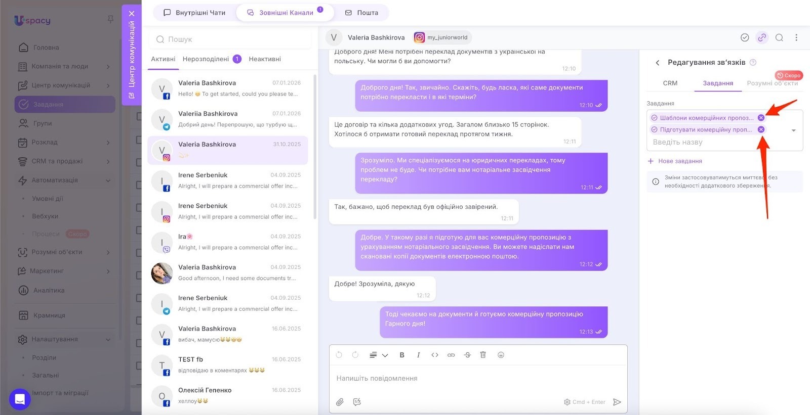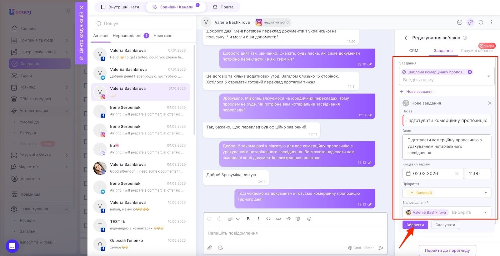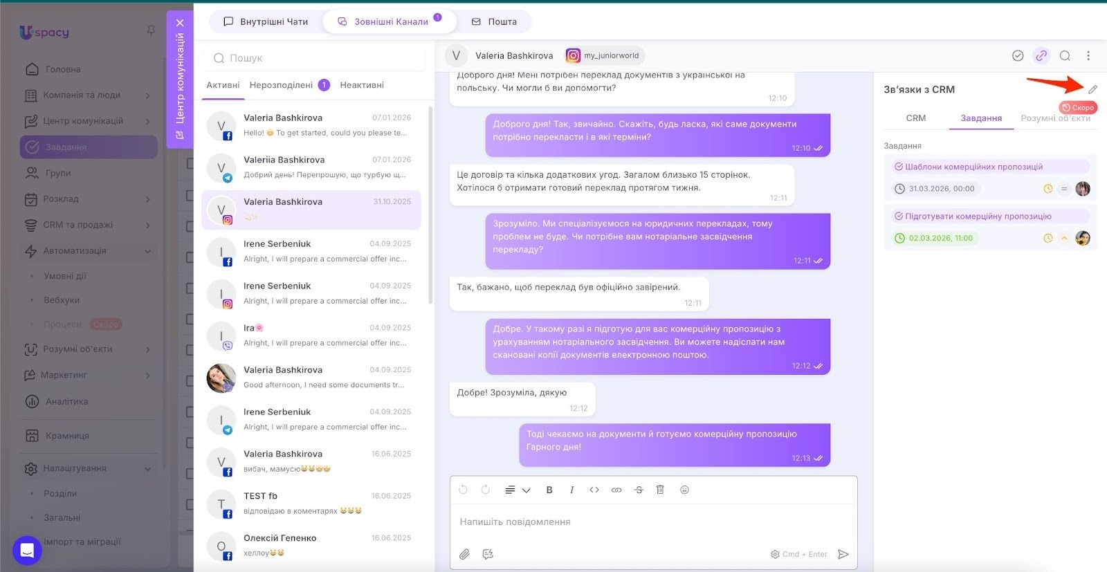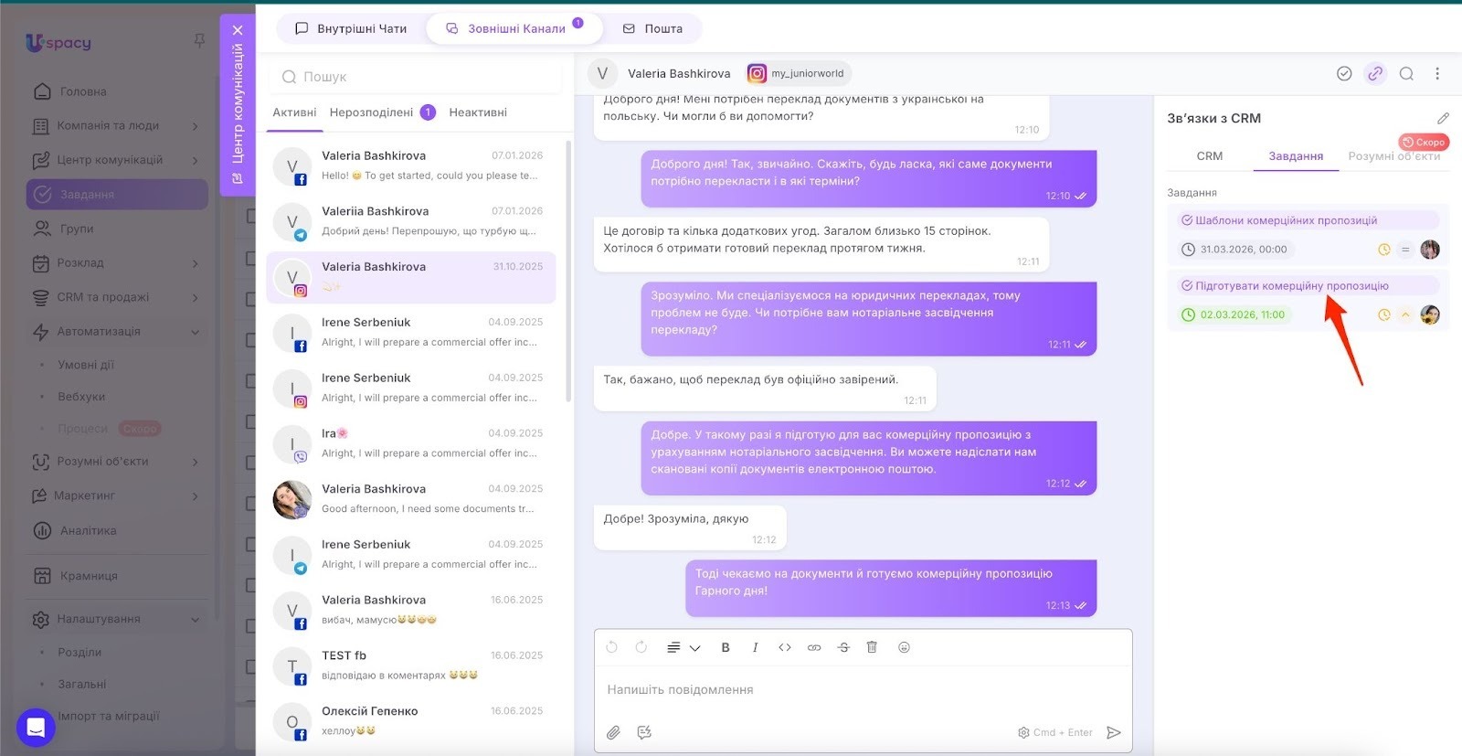 Коли клієнти пишуть у месенджери, важливо не просто швидко відповісти, а й зафіксувати домовленості: передзвонити, підготувати пропозицію, уточнити деталі, передати запит колезі. Саме тому в Uspacy зручно працювати з чатами Зовнішніх ліній (каналів) у Центрі комунікацій – ви ведете діалог у Просторі, не перемикаючись між різними сервісами.