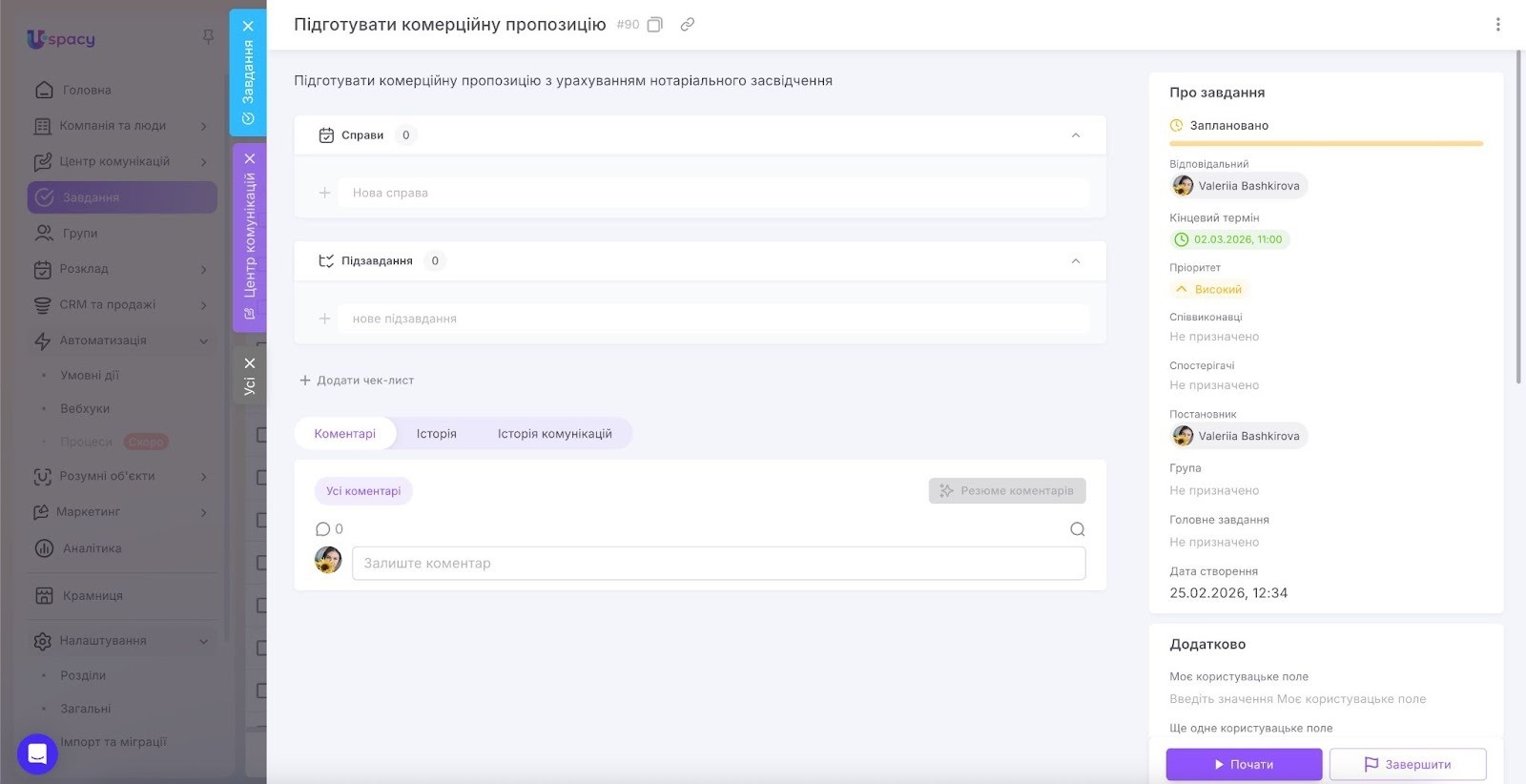 Після діалогу зазвичай з’являються наступні кроки. Якщо це «швидка дія» на конкретний час (передзвонити, домовитися про зустріч, написати повідомлення), її зручно зафіксувати як справу, пов’язану з клієнтом у CRM. А коли робота складніша й потребує структури (опису, чек-листа, підзавдань, кількох учасників) – додавайте зв’язки із Завданнями.