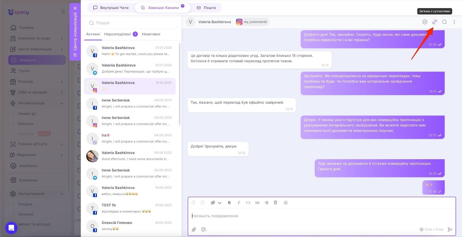 Щоб звернення не губилися й завжди залишався контекст, у Uspacy можна прив’язувати діалоги зовнішніх каналів до елементів CRM, а історія переписки буде доступна в картці клієнта.