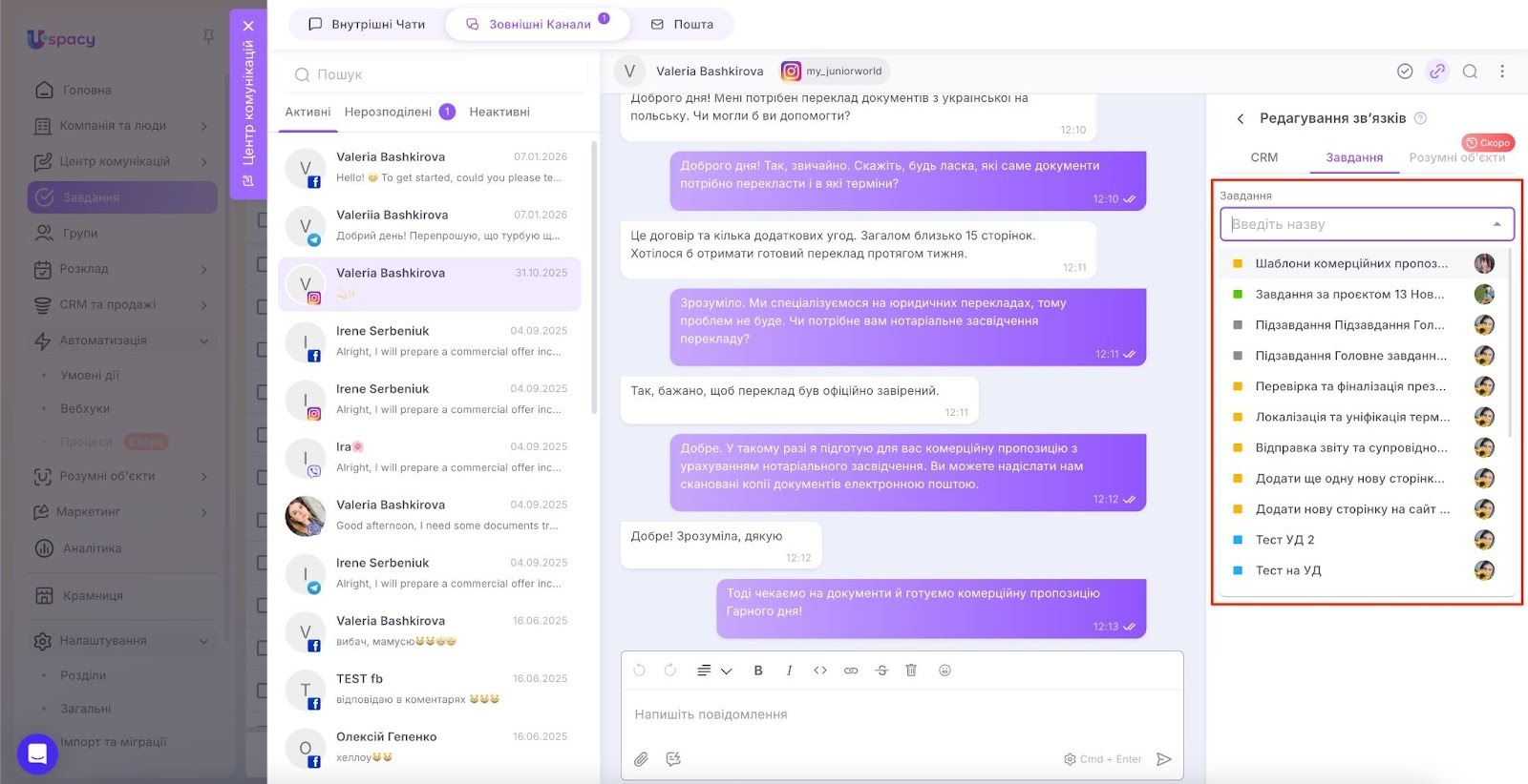 Так звернення із зовнішнього каналу перетворюється на контрольований процес, а команда розуміє, що вже зроблено і що ще потрібно виконати. Саме для цього в Uspacy передбачена можливість прив’язувати діалог до завдання – щоб наступні кроки не губилися й контекст переписки завжди був під рукою.