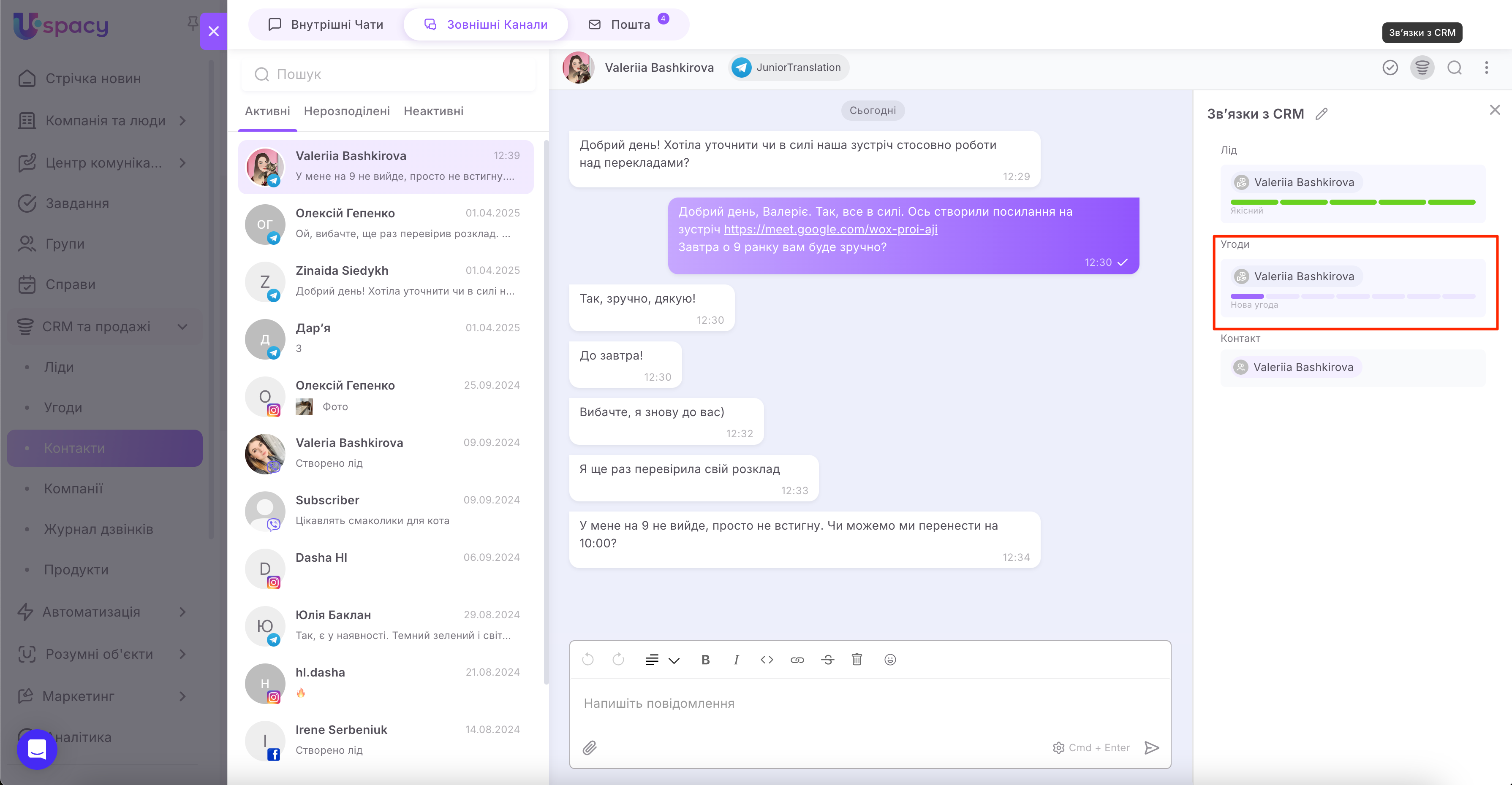 У Uspacy можна прив’язувати чати з певного каналу зовнішніх ліній до елементів CRM вручну та автоматично.