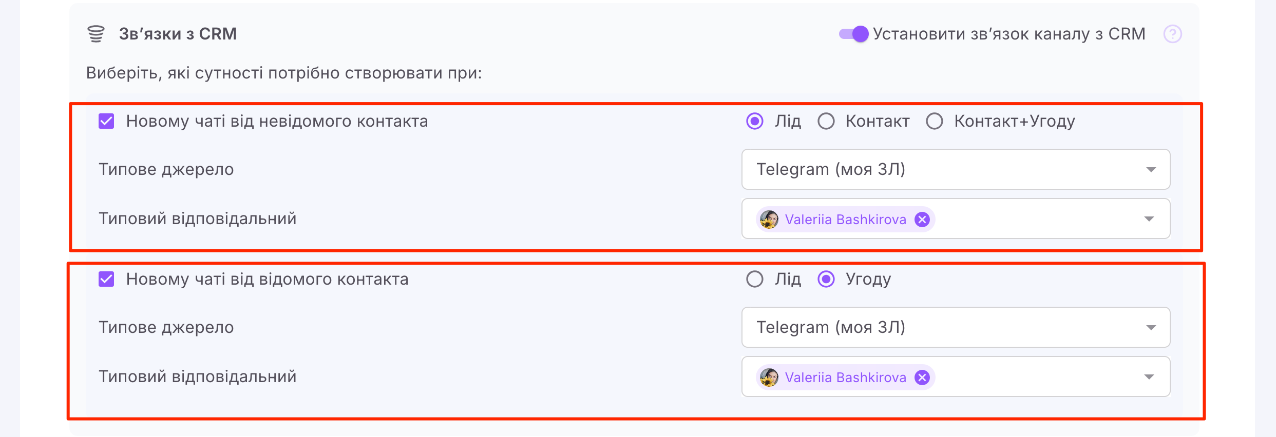 Відповідно налаштування зв’язків з CRM доступне для кожного з цих каналів.